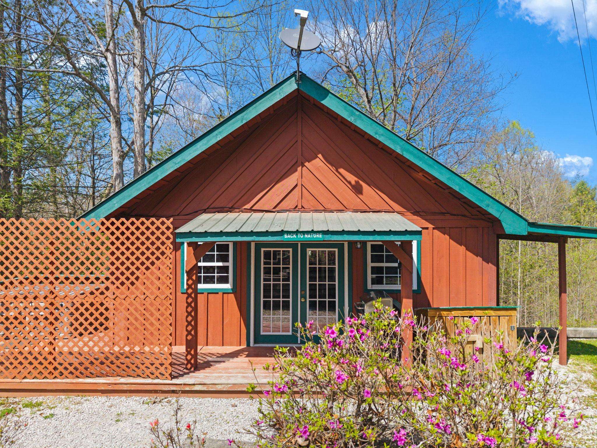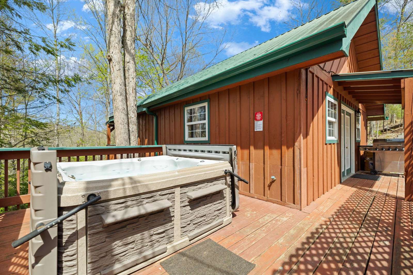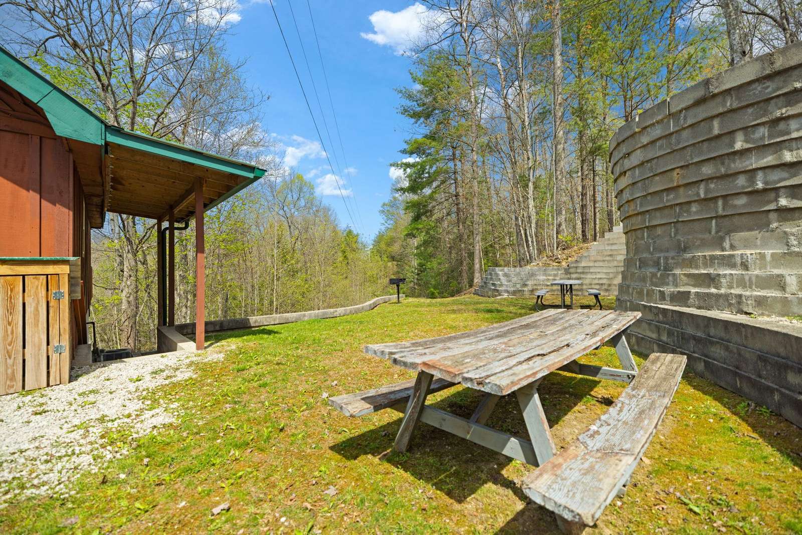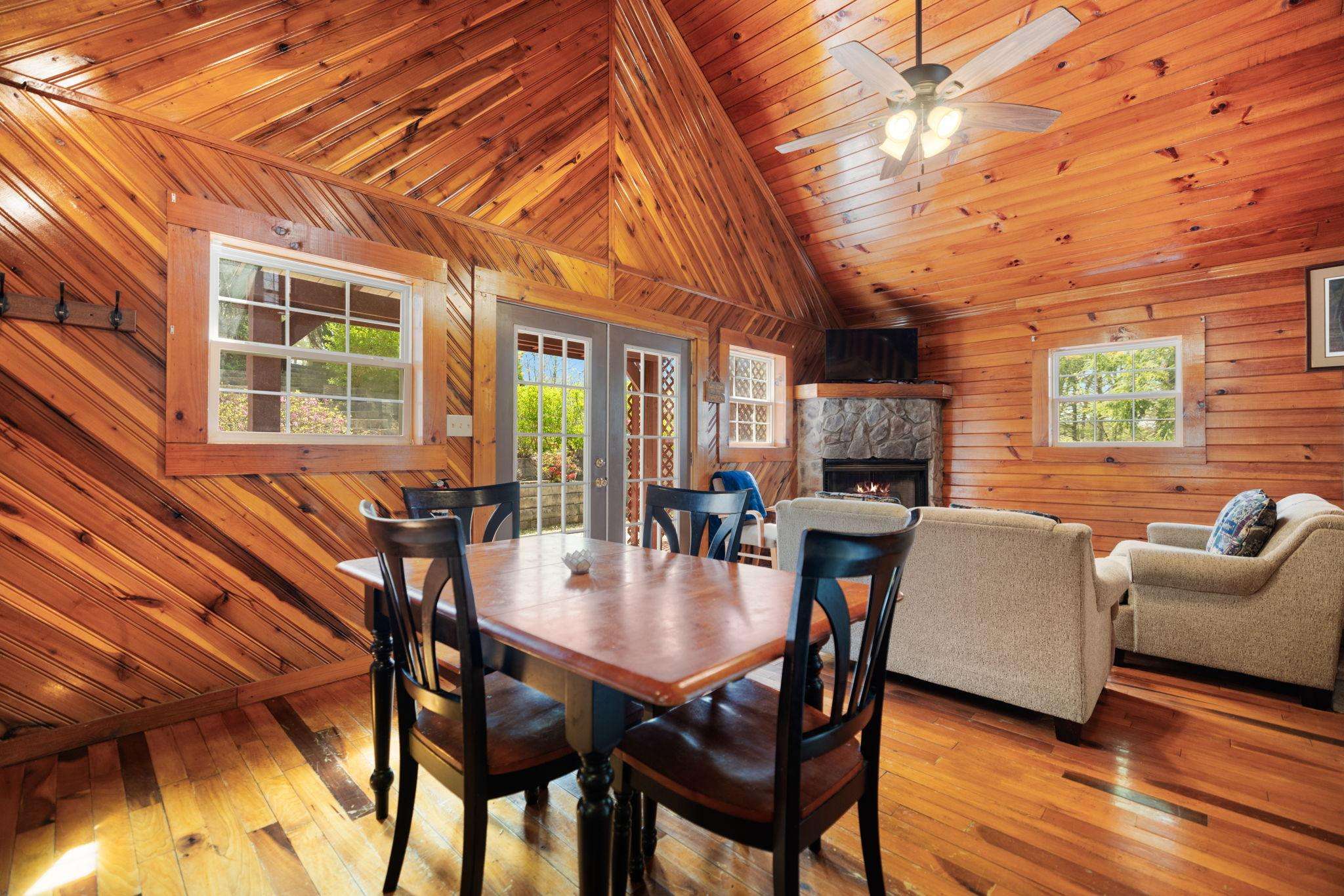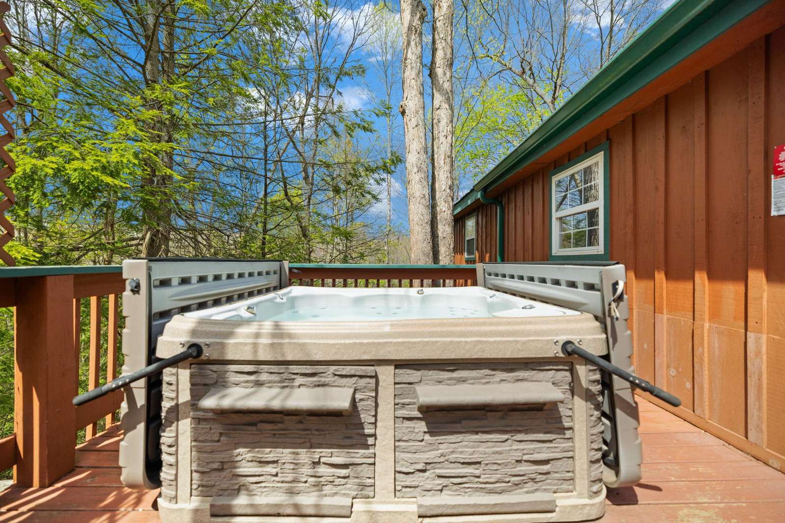 Back to Nature is a Recently Renovated Cabin highlighted by an elaborate courtyard layout weaved into the natural features of the Land giving Back to Nature a Secret Garden vibe! All new furnishings and appliances! This secluded, 3-Bed (2-private plus an open loft), 1-full BA Cabin is centrally located to all of the areas activities in Cliffview Resort. Both private bedrooms downstairs have queen beds and the open loft BR has 2 full beds. One Full bathroom has a spacious tub/shower combo. Amenities include fiber optic Wi-Fi, flat screen Smart TV, Gas Log Fireplace (for winter use), New central HVAC, Refrigerator with automatic Ice maker and Water Dispenser, dishwasher, New 6-person Hot Tub, covered private back deck, awesome fire pit, a gas grill and a park style charcoal grill for either flavor of grill master. Relax in modern comfort, enjoy the private covered porch on the back while enjoying nature or sitting by the fire pit. Cliffview Resort offers stocked ponds for fishing (catch & release) and trails for hiking and 11 miles of mountain biking trails. Harold's Lake is Cliffview's largest fishing pond, just a short walk down the hill from the cabin. Cast a line on one of the two docks.