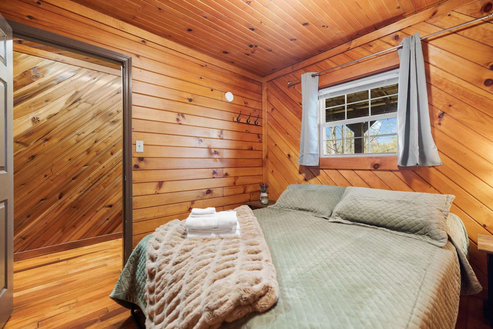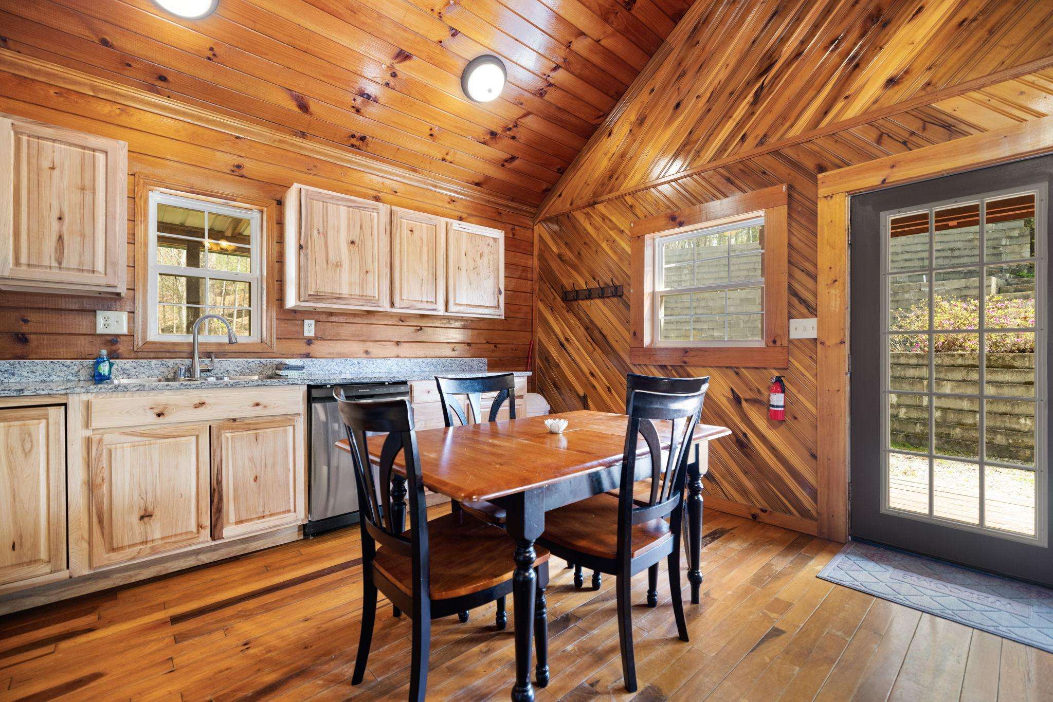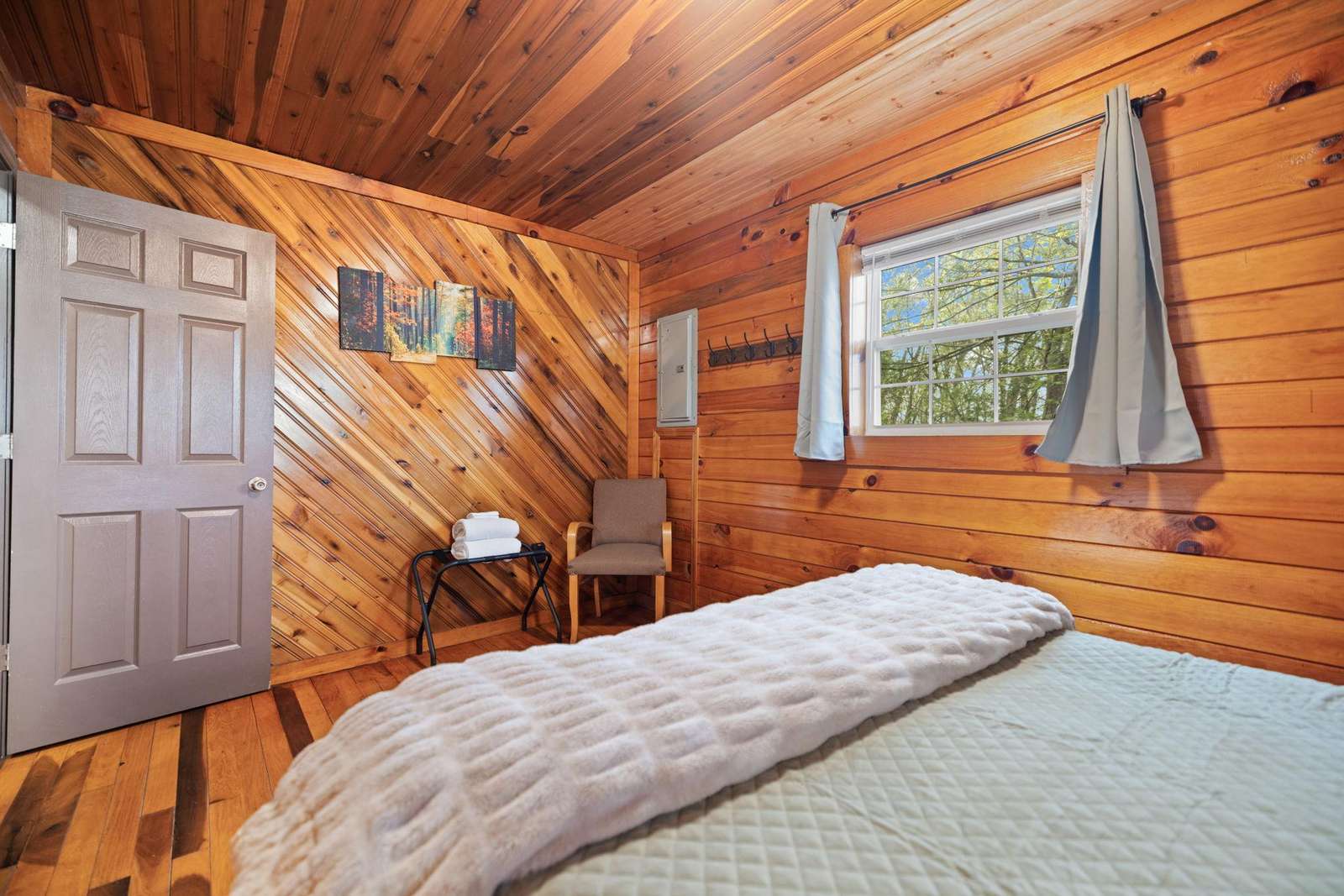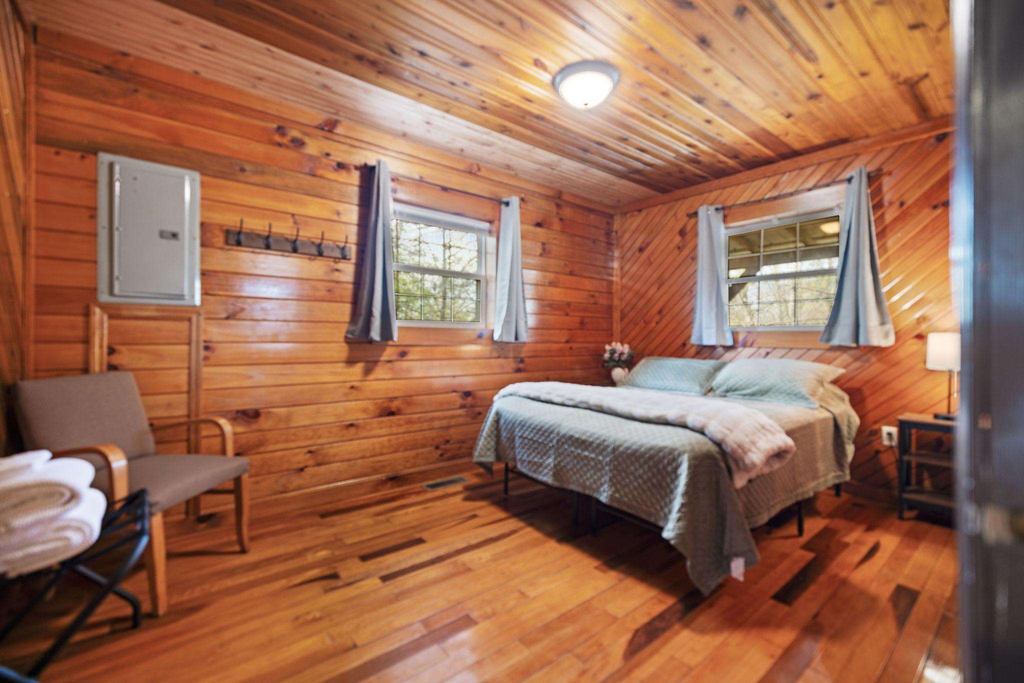 Back to Nature is a Recently Renovated Cabin highlighted by an elaborate courtyard layout weaved into the natural features of the Land giving Back to Nature a Secret Garden vibe! All new furnishings and appliances! This secluded, 3-Bed (2-private plus an open loft), 1-full BA Cabin is centrally located to all of the areas activities in Cliffview Resort. Both private bedrooms downstairs have queen beds and the open loft BR has 2 full beds. One Full bathroom has a spacious tub/shower combo. Amenities include fiber optic Wi-Fi, flat screen Smart TV, Gas Log Fireplace (for winter use), New central HVAC, Refrigerator with automatic Ice maker and Water Dispenser, dishwasher, New 6-person Hot Tub, covered private back deck, awesome fire pit, a gas grill and a park style charcoal grill for either flavor of grill master. Relax in modern comfort, enjoy the private covered porch on the back while enjoying nature or sitting by the fire pit. Cliffview Resort offers stocked ponds for fishing (catch & release) and trails for hiking and 11 miles of mountain biking trails. Harold's Lake is Cliffview's largest fishing pond, just a short walk down the hill from the cabin. Cast a line on one of the two docks.