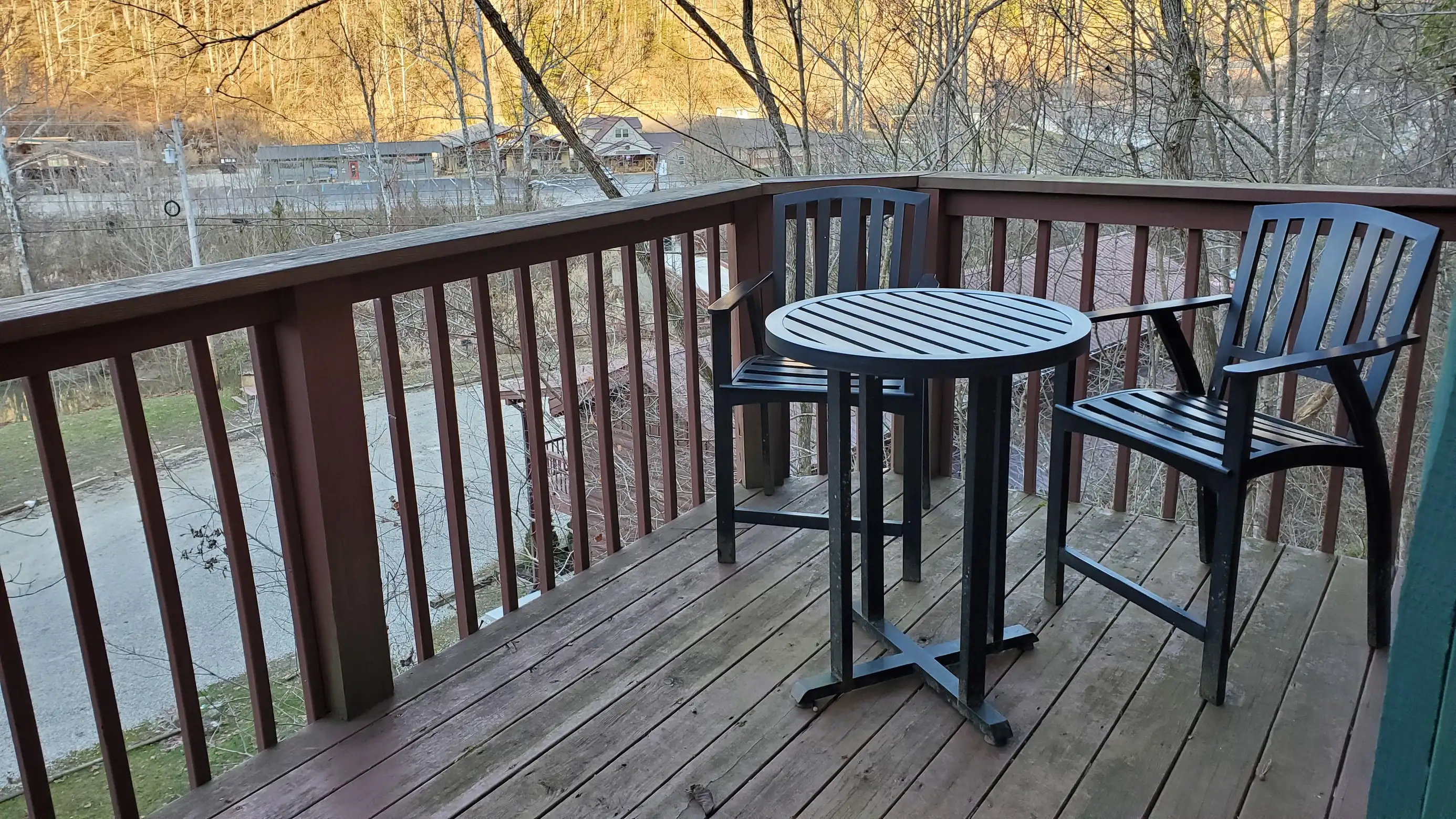 This cabin is 2 stories. The upstairs Main Living Room has Brand New Leather Sofas, a 46'' Flat Screen Satellite TV with inputs for Game console, computer, etc. Kitchen and dining table join the main living room. Two private bedrooms each with a Queen Bed. One bedroom has a private balcony for taking in the fresh mountain air. Both share one full bathroom with a tub/shower combo.