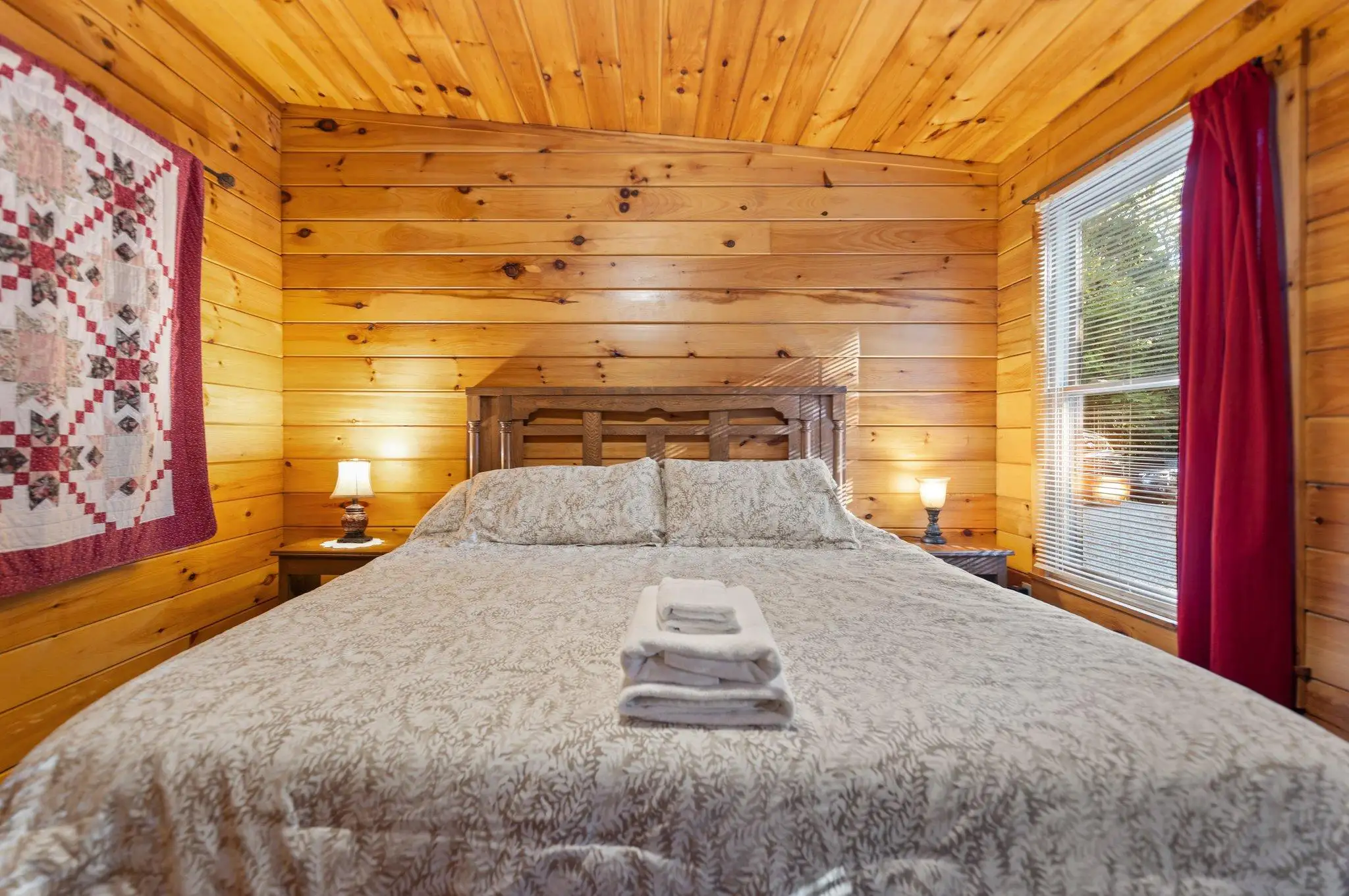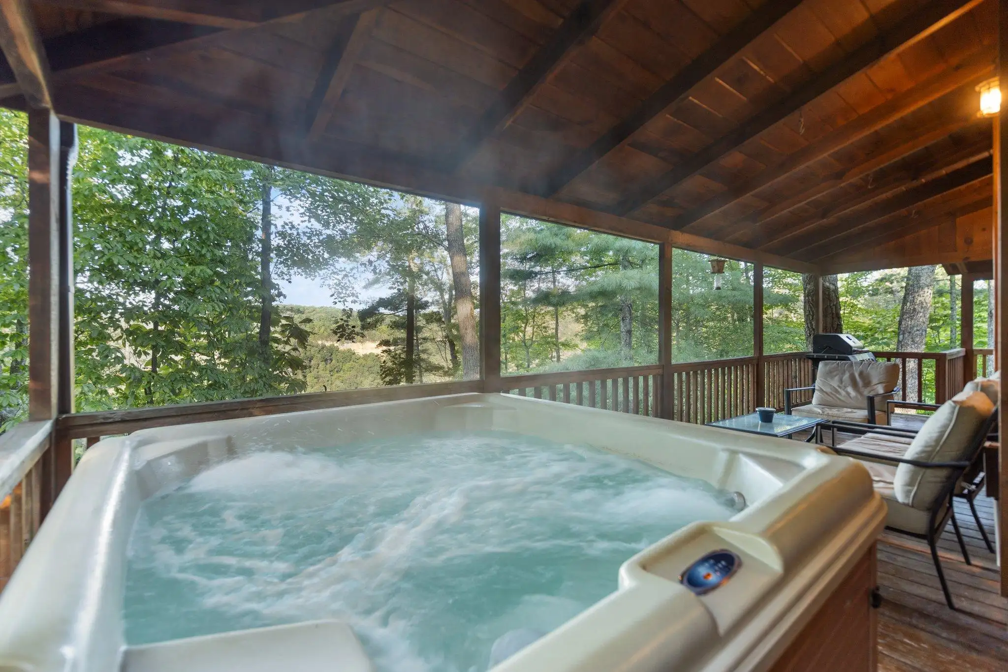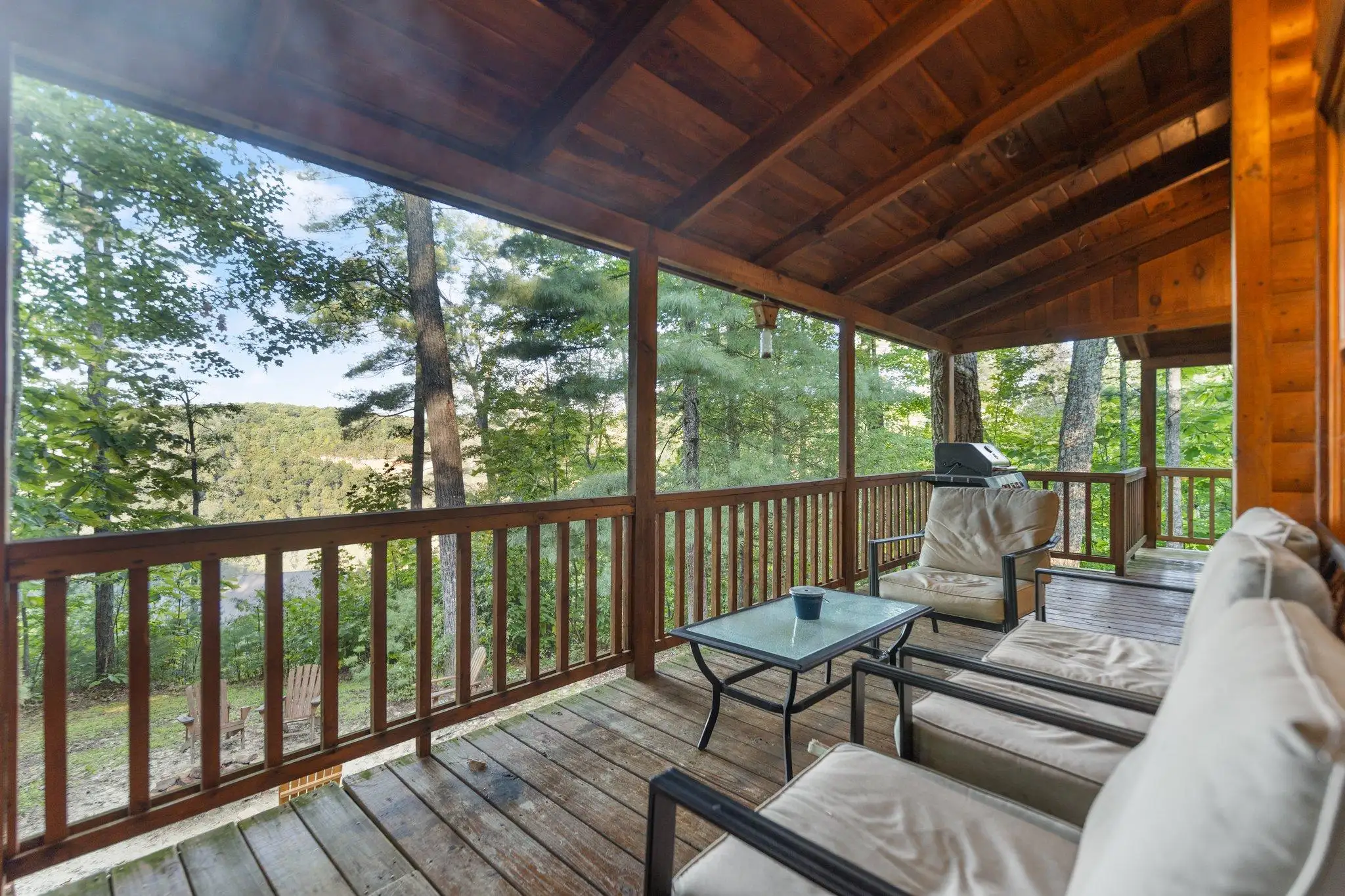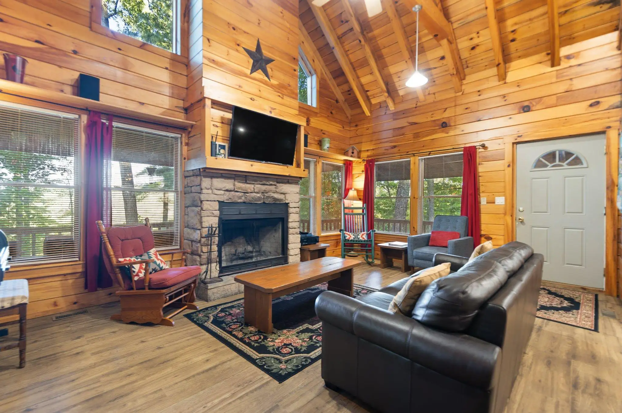 Nestled in a scenic backdrop with captivating mountain valley view! This beautiful vacation log cabin is picturesque in a fairly secluded corner of Scenic Heights Resort. (No cabins within view from the deck). Close to both Natural Bridge State Park and the Red River Gorge. This modern 3-BR, 2-BA cabin sleeps up to 8 , has a large flat screen satellite TV on main floor, an indoor/outdoor sound system, fiber optic Wi-Fi, washer/dryer, gas grill, outdoor fire pit, dishwasher, wood burning fireplace, central heat/AC,5-person hot tub & foosball table upstairs. Master BR has a king bed and a Jack-N-Jill bathroom shared with main floor and the second BR which has a king bed. Upstairs is a third BR which has a twin bunk bed with trundle and small twin built into the wall so this room can sleep up to 4 young people!. The wall twin bed is only accessible by a ladder. YOUNG CHILDREN MUST BE SUPERVISED WHEN ON LADDER. (Scenic Cabin Rentals not responsible for injuries incurred by the bunk bed) The Upstairs BR also has a flat screen TV for gaming with Blu-Ray/DVD player (The main living room TV is the only one with satellite TV) and has a private balcony. The top floor has a full bath with tub/shower to make bath time for 4 kids a splash! All will enjoy a great time grilling out on the covered wrap around deck listening to music on the sound system, or sitting in the outdoor hot tub with seating for 5 while soaking in the spectacular view. It is no wonder people leave feeling relaxed and refreshed. This beautiful log home and area makes a perfect honeymoon destination. Visit Red River Gorge, Kentucky and relax at Bobcat Lodge in the Scenic Heights neighborhood area!