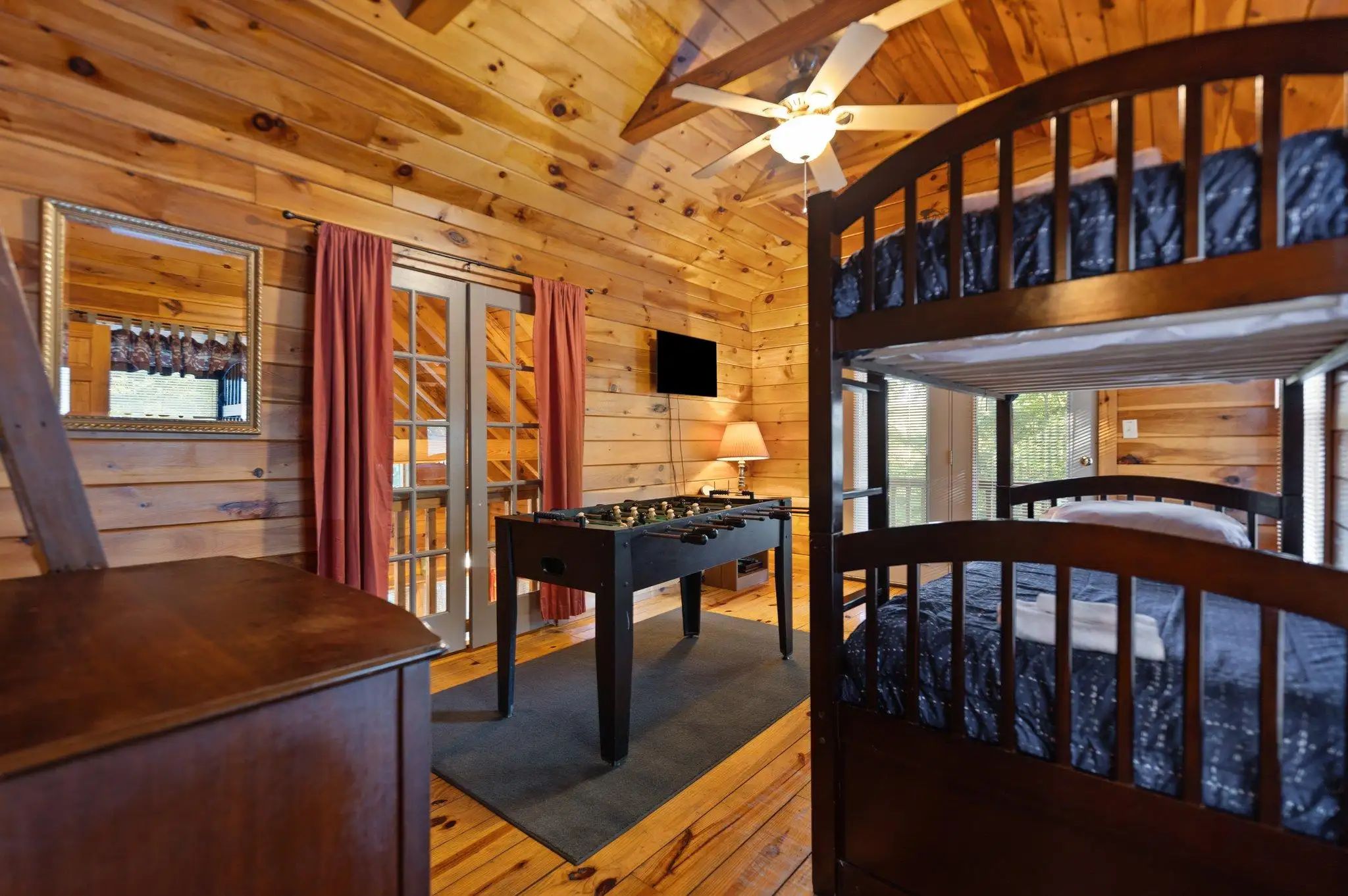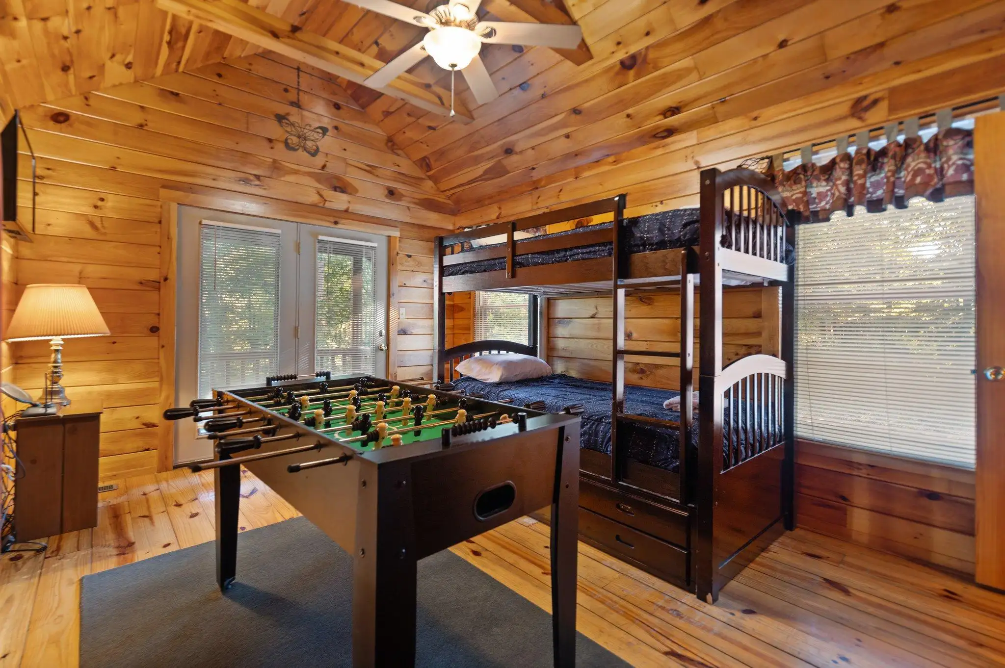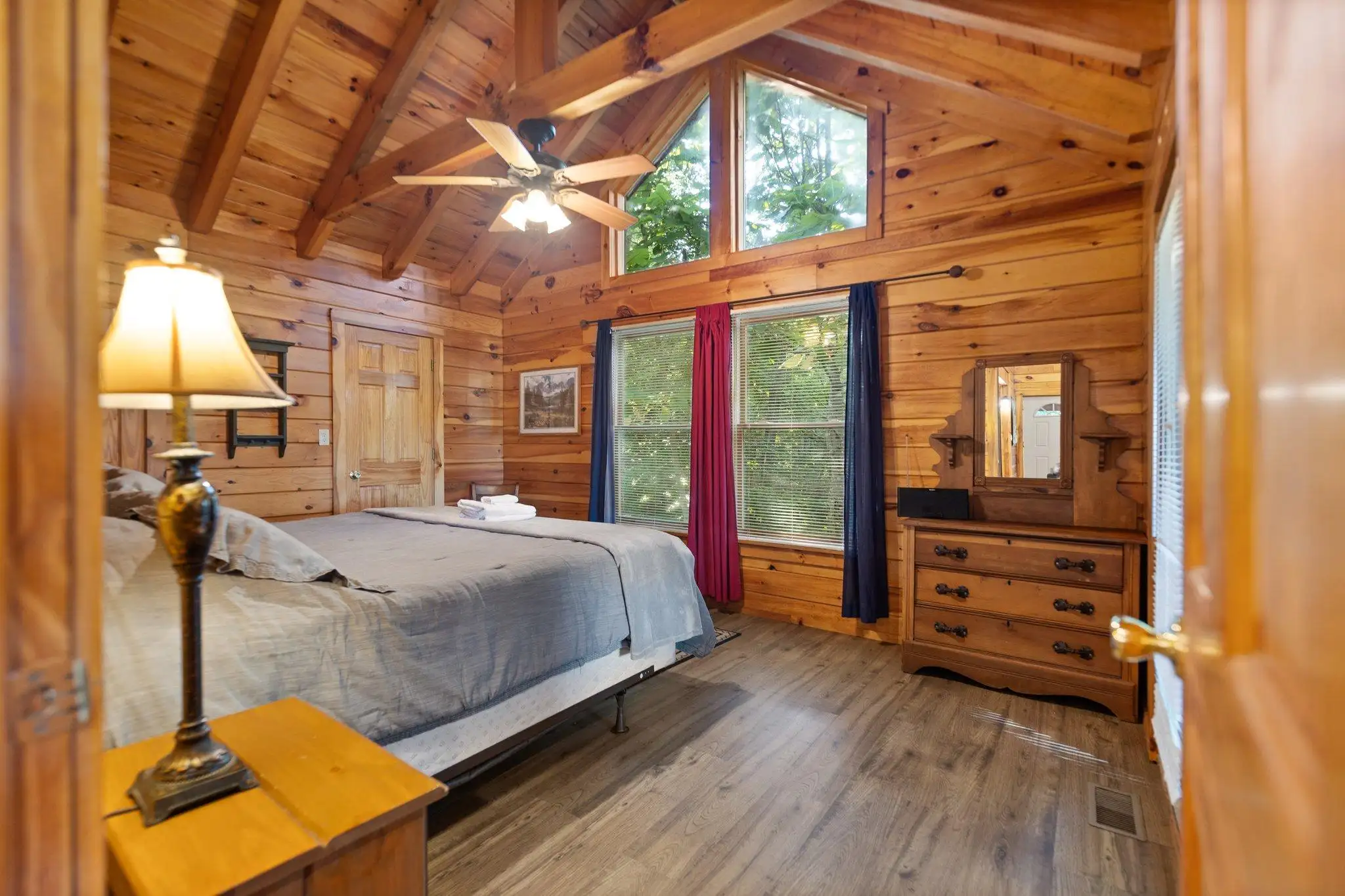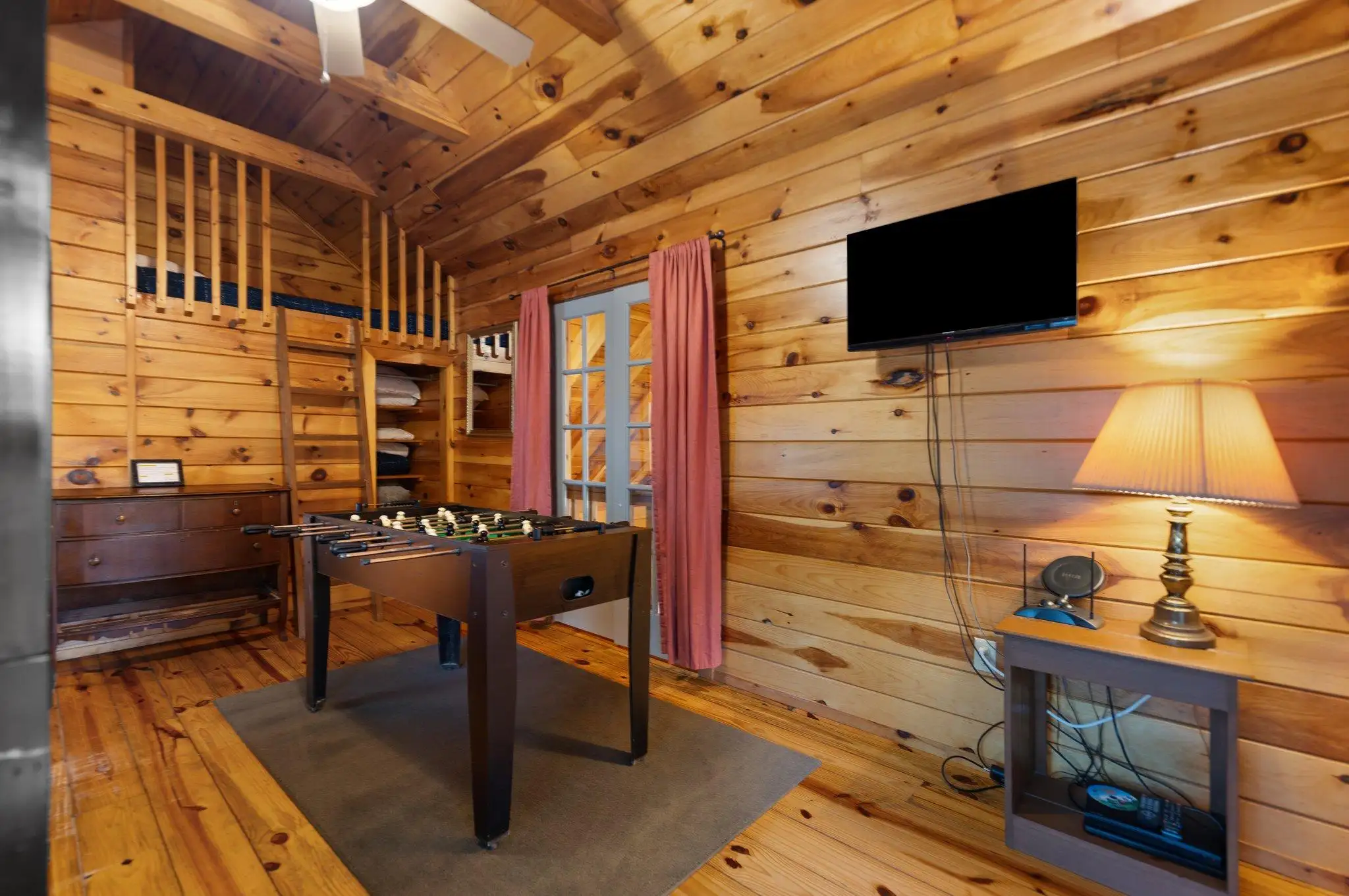 Nestled in a scenic backdrop with captivating mountain valley view! This beautiful vacation log cabin is picturesque in a fairly secluded corner of Scenic Heights Resort. (No cabins within view from the deck). Close to both Natural Bridge State Park and the Red River Gorge. This modern 3-BR, 2-BA cabin sleeps up to 8 , has a large flat screen satellite TV on main floor, an indoor/outdoor sound system, fiber optic Wi-Fi, washer/dryer, gas grill, outdoor fire pit, dishwasher, wood burning fireplace, central heat/AC,5-person hot tub & foosball table upstairs. Master BR has a king bed and a Jack-N-Jill bathroom shared with main floor and the second BR which has a king bed. Upstairs is a third BR which has a twin bunk bed with trundle and small twin built into the wall so this room can sleep up to 4 young people!. The wall twin bed is only accessible by a ladder. YOUNG CHILDREN MUST BE SUPERVISED WHEN ON LADDER. (Scenic Cabin Rentals not responsible for injuries incurred by the bunk bed) The Upstairs BR also has a flat screen TV for gaming with Blu-Ray/DVD player (The main living room TV is the only one with satellite TV) and has a private balcony. The top floor has a full bath with tub/shower to make bath time for 4 kids a splash! All will enjoy a great time grilling out on the covered wrap around deck listening to music on the sound system, or sitting in the outdoor hot tub with seating for 5 while soaking in the spectacular view. It is no wonder people leave feeling relaxed and refreshed. This beautiful log home and area makes a perfect honeymoon destination. Visit Red River Gorge, Kentucky and relax at Bobcat Lodge in the Scenic Heights neighborhood area!