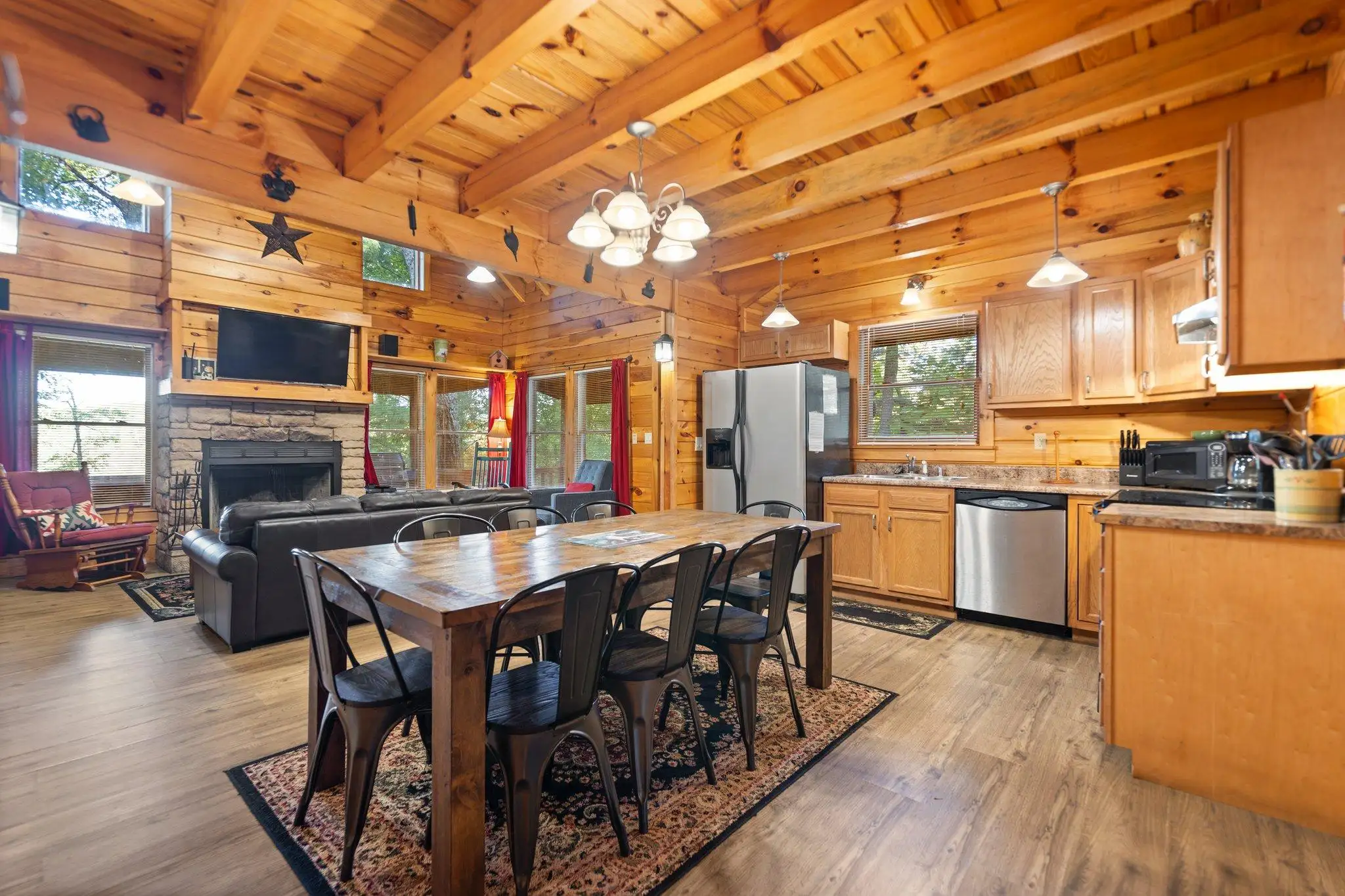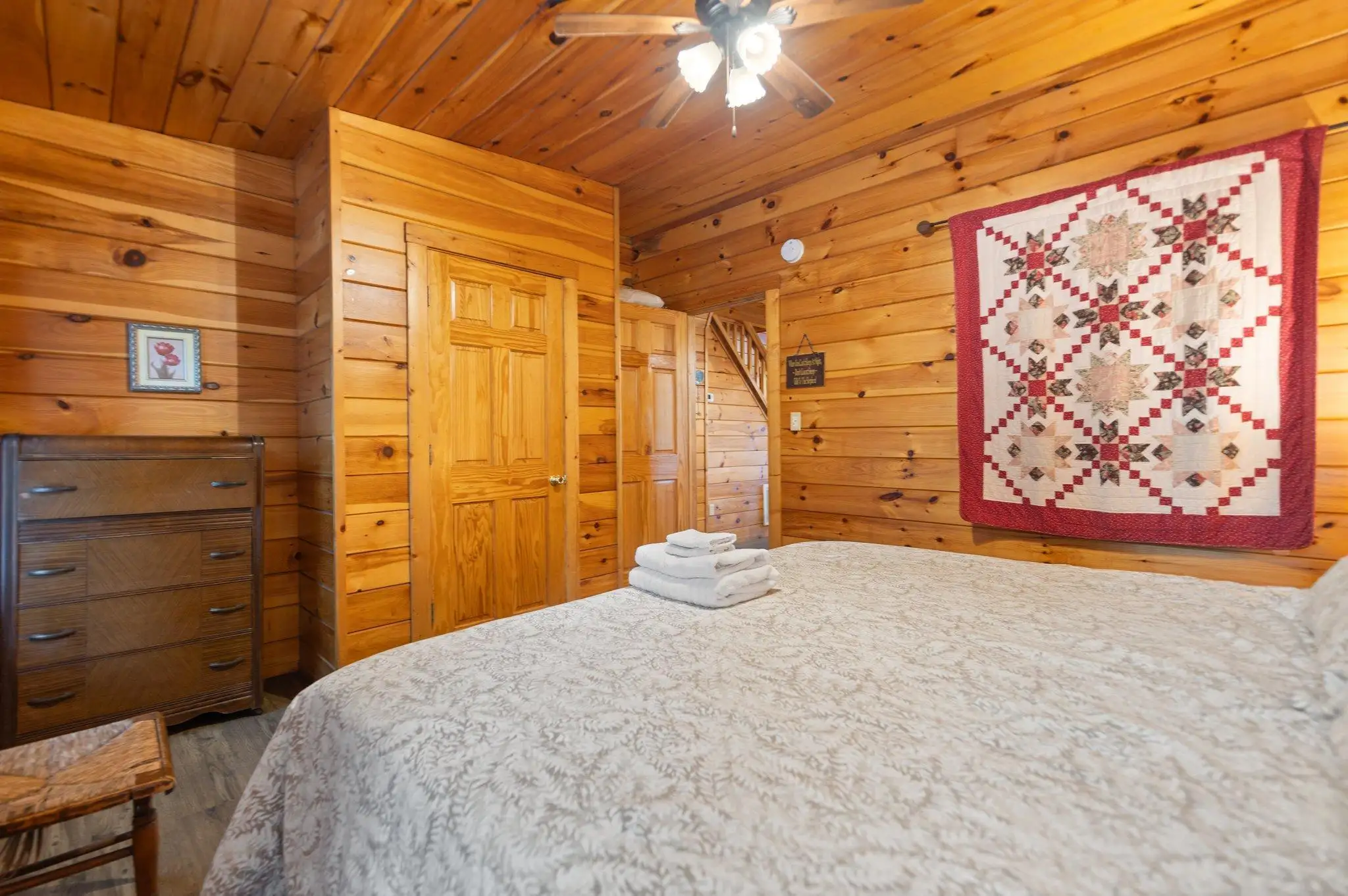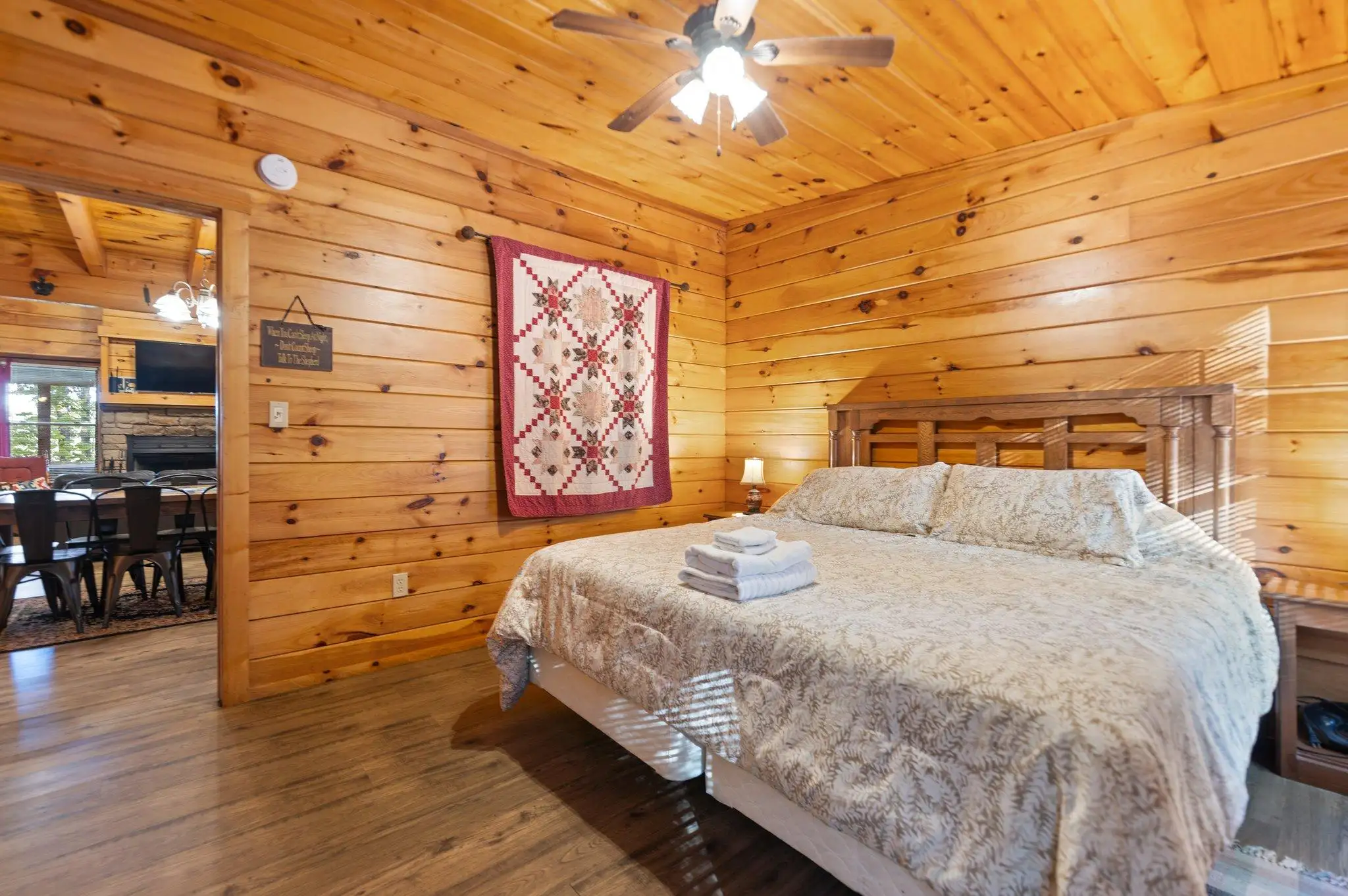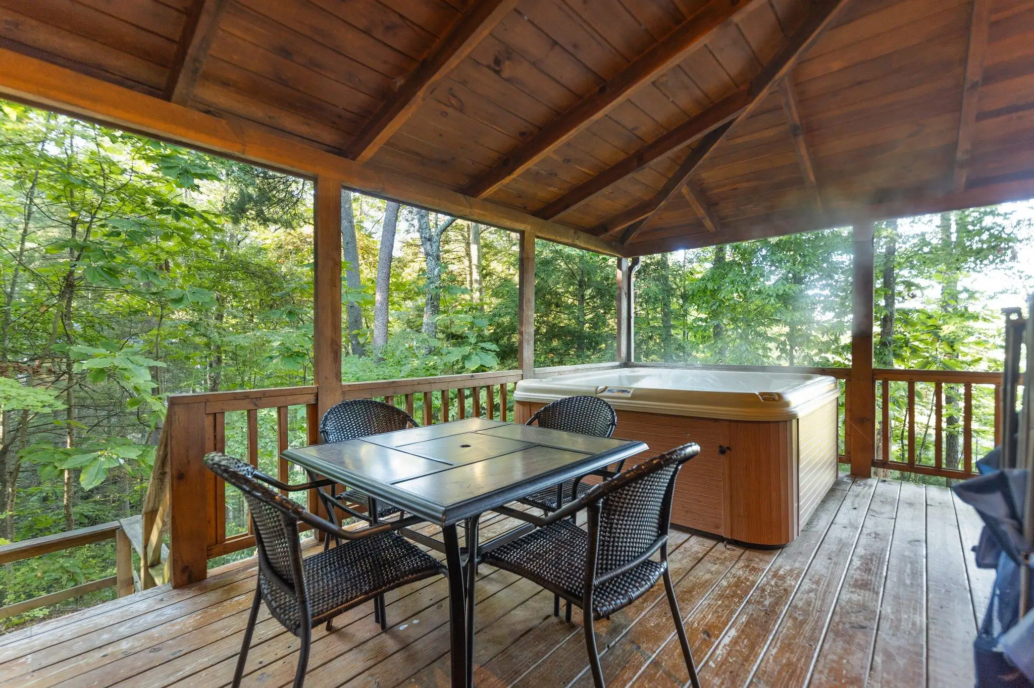 Nestled in a scenic backdrop with captivating mountain valley view! This beautiful vacation log cabin is picturesque in a fairly secluded corner of Scenic Heights Resort. (No cabins within view from the deck). Close to both Natural Bridge State Park and the Red River Gorge. This modern 3-BR, 2-BA cabin sleeps up to 8 , has a large flat screen satellite TV on main floor, an indoor/outdoor sound system, fiber optic Wi-Fi, washer/dryer, gas grill, outdoor fire pit, dishwasher, wood burning fireplace, central heat/AC,5-person hot tub & foosball table upstairs. Master BR has a king bed and a Jack-N-Jill bathroom shared with main floor and the second BR which has a king bed. Upstairs is a third BR which has a twin bunk bed with trundle and small twin built into the wall so this room can sleep up to 4 young people!. The wall twin bed is only accessible by a ladder. YOUNG CHILDREN MUST BE SUPERVISED WHEN ON LADDER. (Scenic Cabin Rentals not responsible for injuries incurred by the bunk bed) The Upstairs BR also has a flat screen TV for gaming with Blu-Ray/DVD player (The main living room TV is the only one with satellite TV) and has a private balcony. The top floor has a full bath with tub/shower to make bath time for 4 kids a splash! All will enjoy a great time grilling out on the covered wrap around deck listening to music on the sound system, or sitting in the outdoor hot tub with seating for 5 while soaking in the spectacular view. It is no wonder people leave feeling relaxed and refreshed. This beautiful log home and area makes a perfect honeymoon destination. Visit Red River Gorge, Kentucky and relax at Bobcat Lodge in the Scenic Heights neighborhood area!