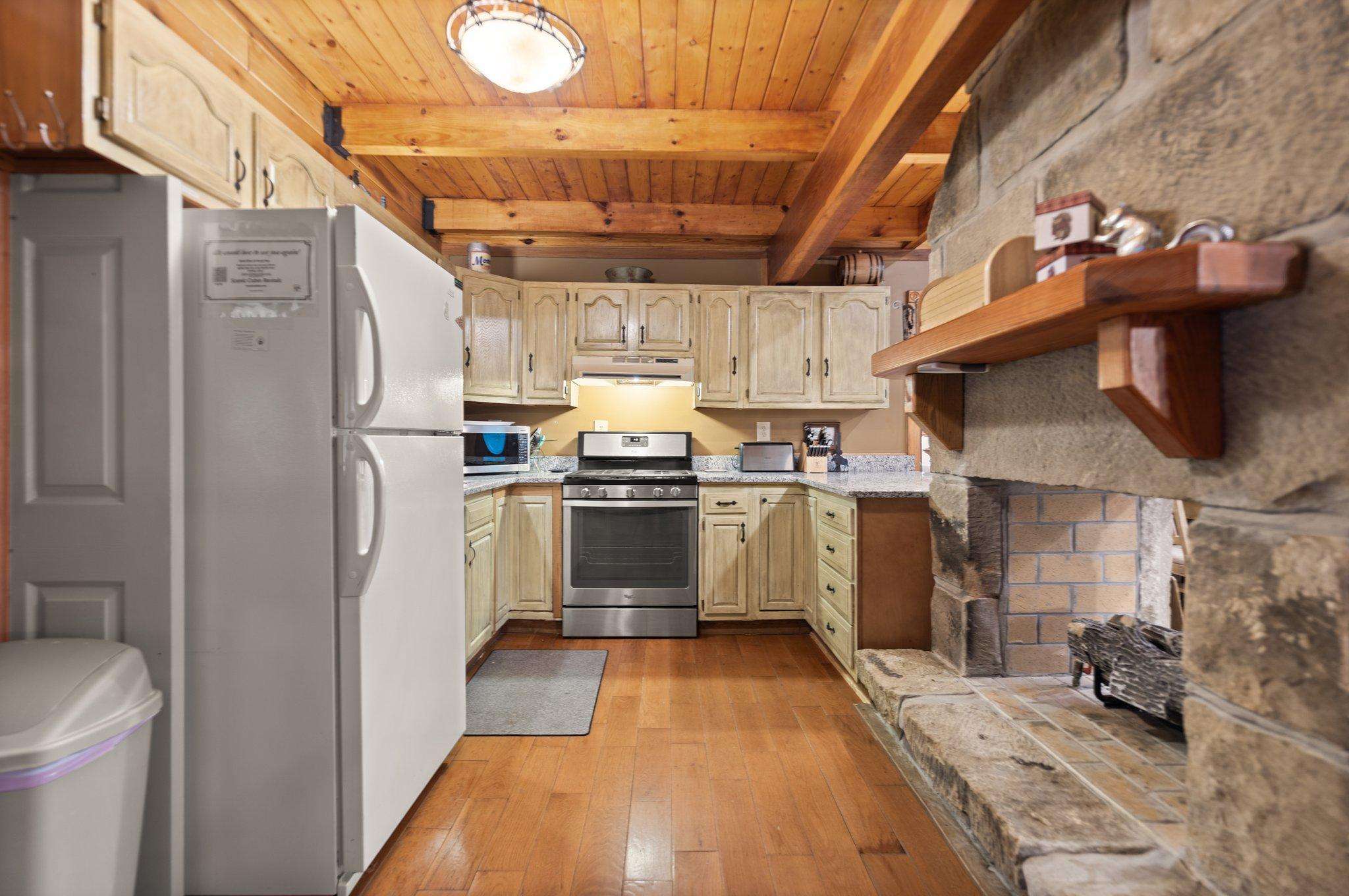 The open kitchen and spacious living room is centered on a towering see-through fireplace with a gas log insert. The kitchen has granite counters and plenty of room for cooking on the gas stove. The refrigerator has an automatic ice maker. Appliances up to but not limited to: microwave, toaster, coffee maker, mixer and standard cooking and kitchenware. The dining table seats up to 6. The kitchen also has barstool seating for two. Unwind on the sofa and chairs in the living room while watching your favorite program on the 55’’ flat screen smart TV connected to fiber optic Wi-Fi internet.