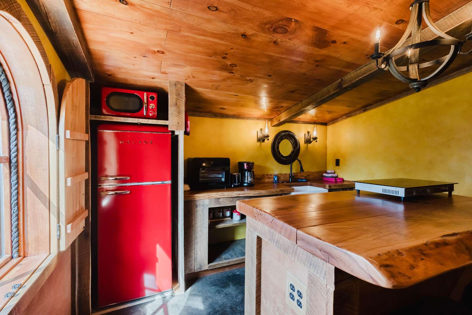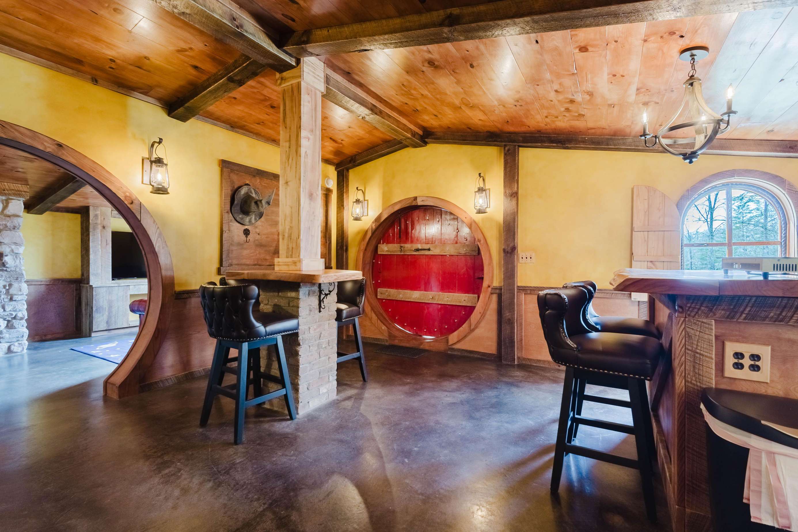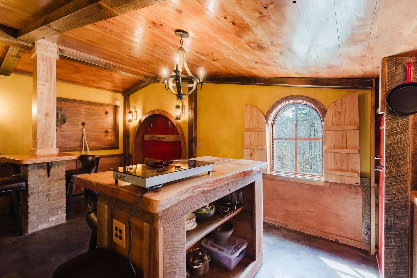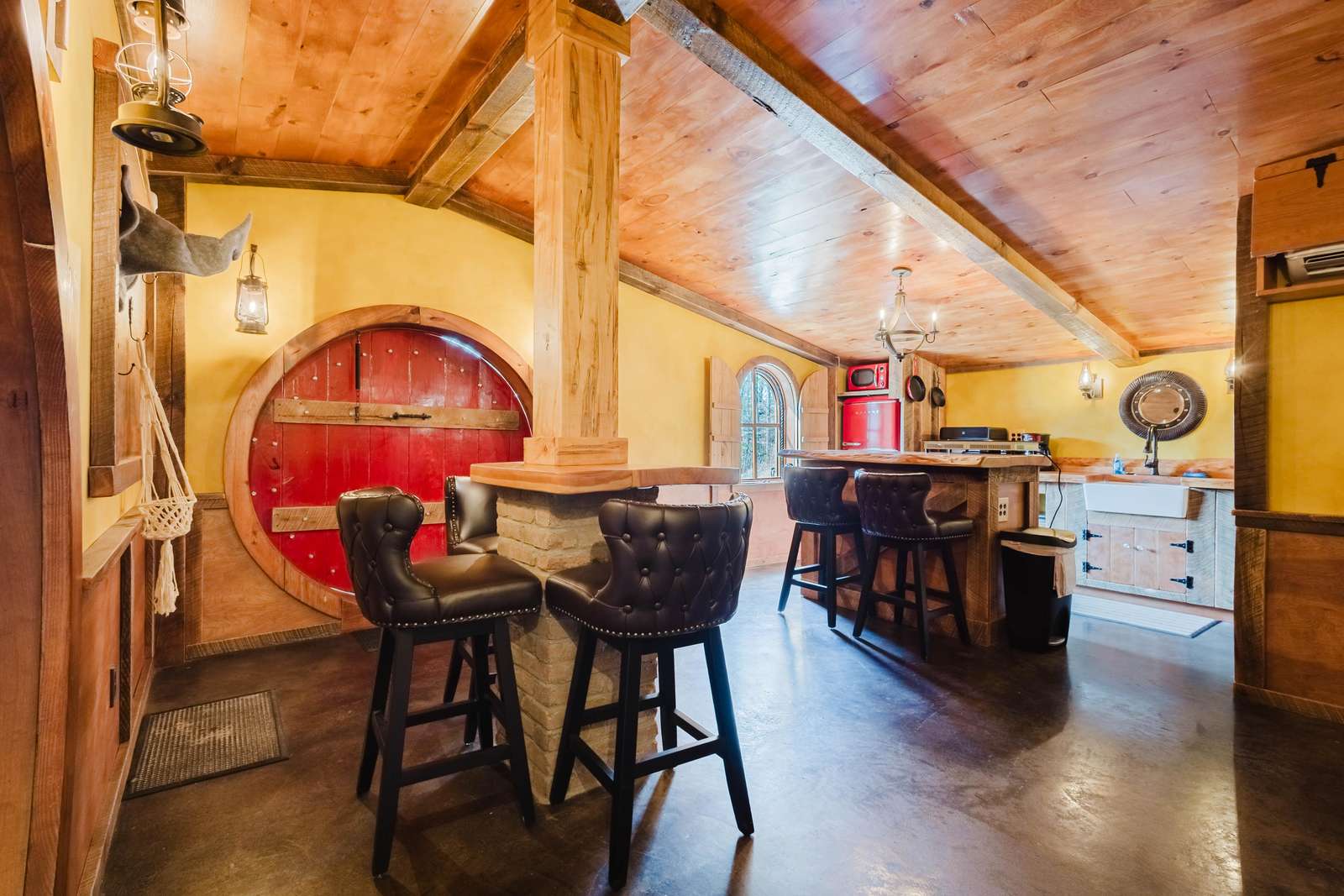 Inside the Red Hobbit, the extent of the craftsmanship and detail come into focus. Entering the iconic hand built round door to the open kitchenette and spacious dining area with bar stool seating at the kitchen island and bar top table. The kitchenette features a Refrigerator, toaster-oven, 2-burner electric cook top, microwave, coffee maker and all of the cookware and dinnerware you need. The adjacent living room has a decorative real stone fireplace with electric Log insert to enjoy while sitting on the couch streaming your favorite program or game on the 55'' flat screen smart TV connected to high speed, fiber optic Wi-Fi.