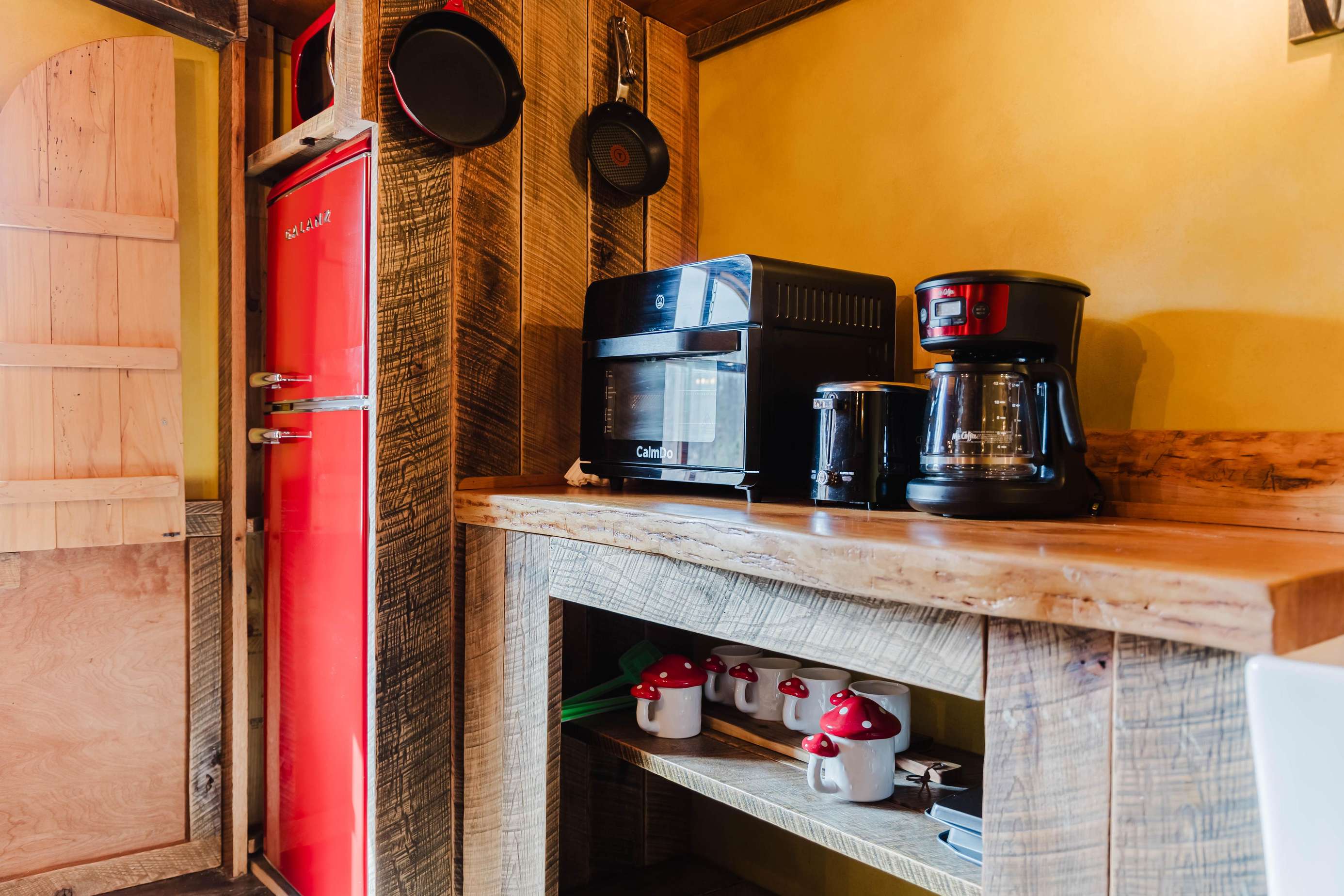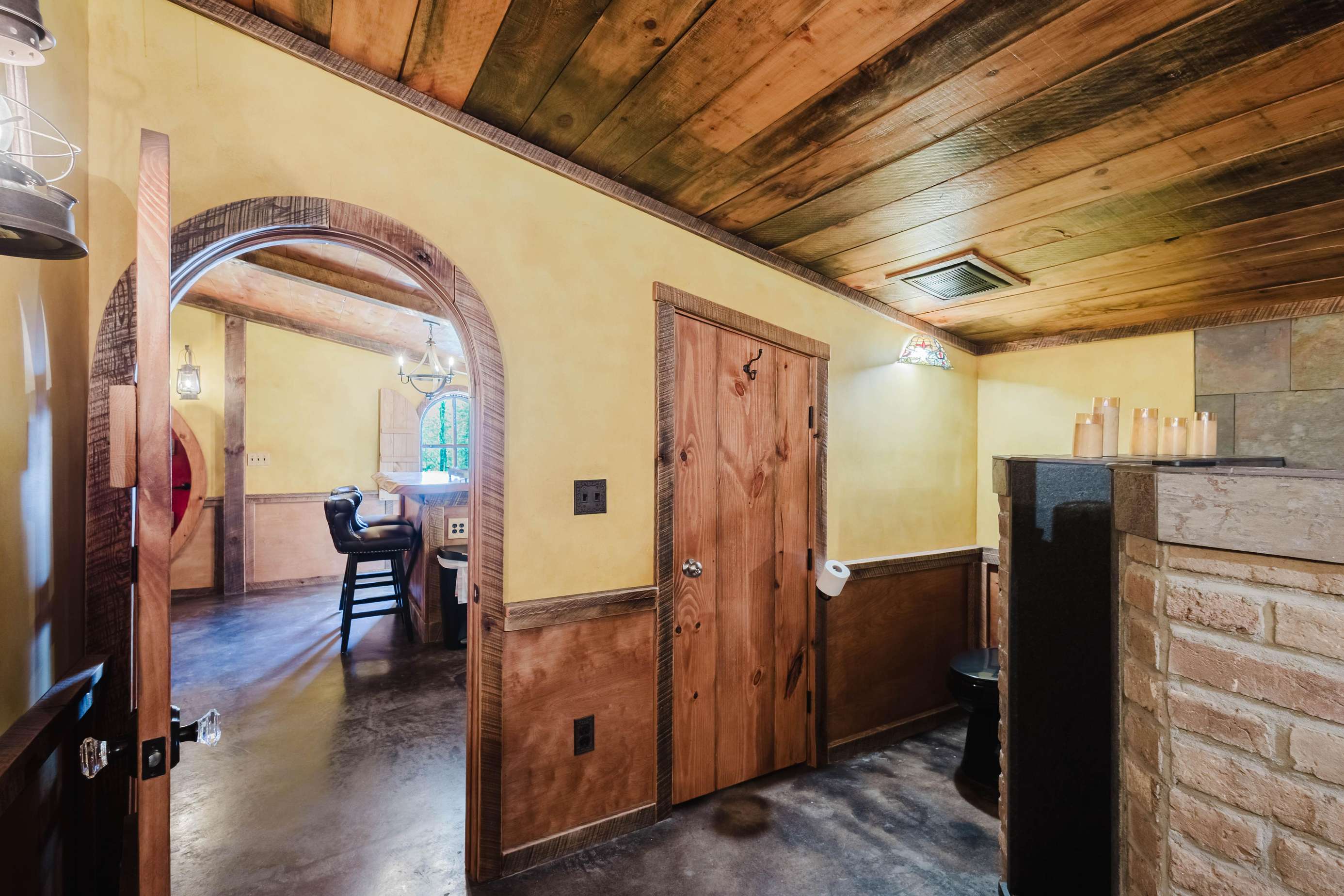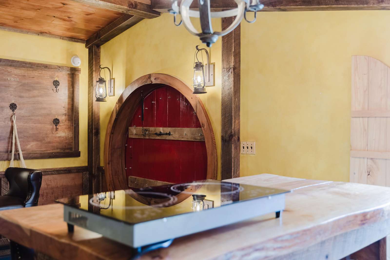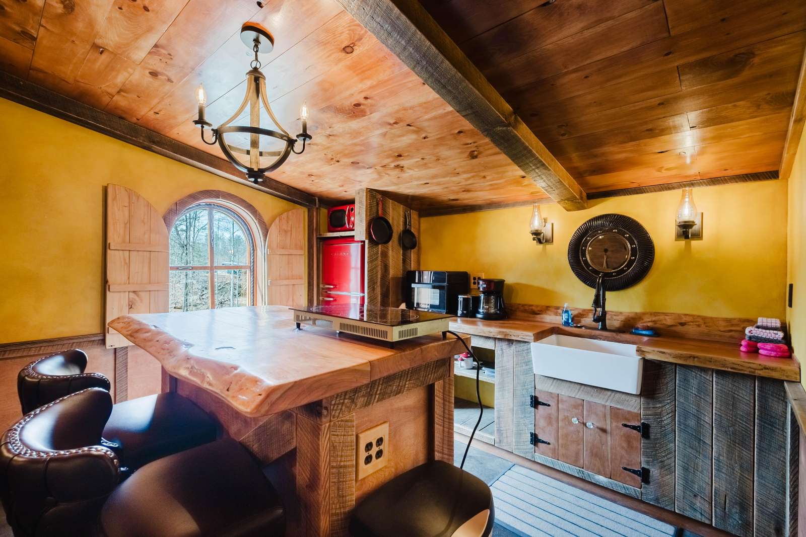 Inside the Red Hobbit, the extent of the craftsmanship and detail come into focus. Entering the iconic hand built round door to the open kitchenette and spacious dining area with bar stool seating at the kitchen island and bar top table. The kitchenette features a Refrigerator, toaster-oven, 2-burner electric cook top, microwave, coffee maker and all of the cookware and dinnerware you need. The adjacent living room has a decorative real stone fireplace with electric Log insert to enjoy while sitting on the couch streaming your favorite program or game on the 55'' flat screen smart TV connected to high speed, fiber optic Wi-Fi.