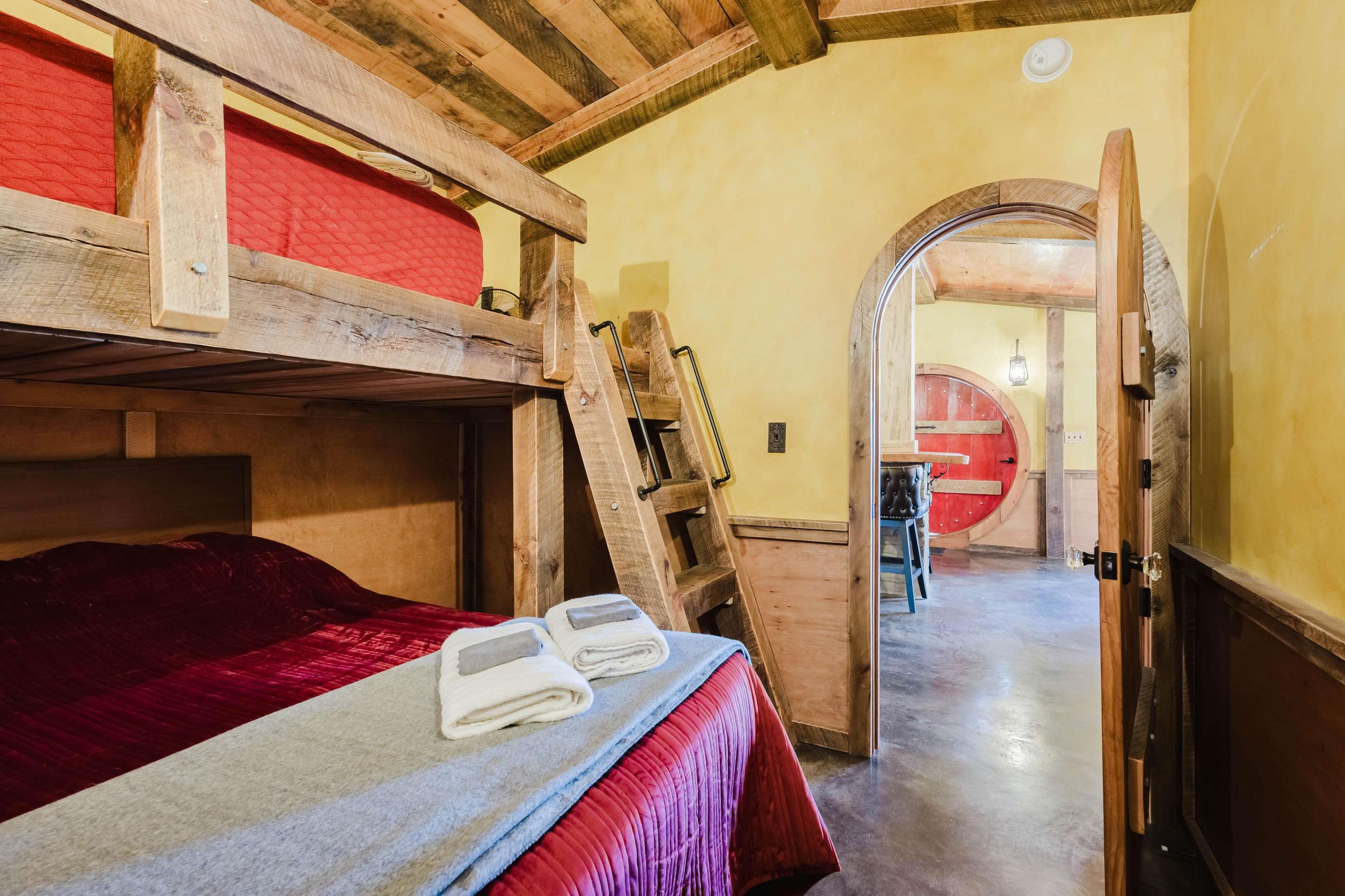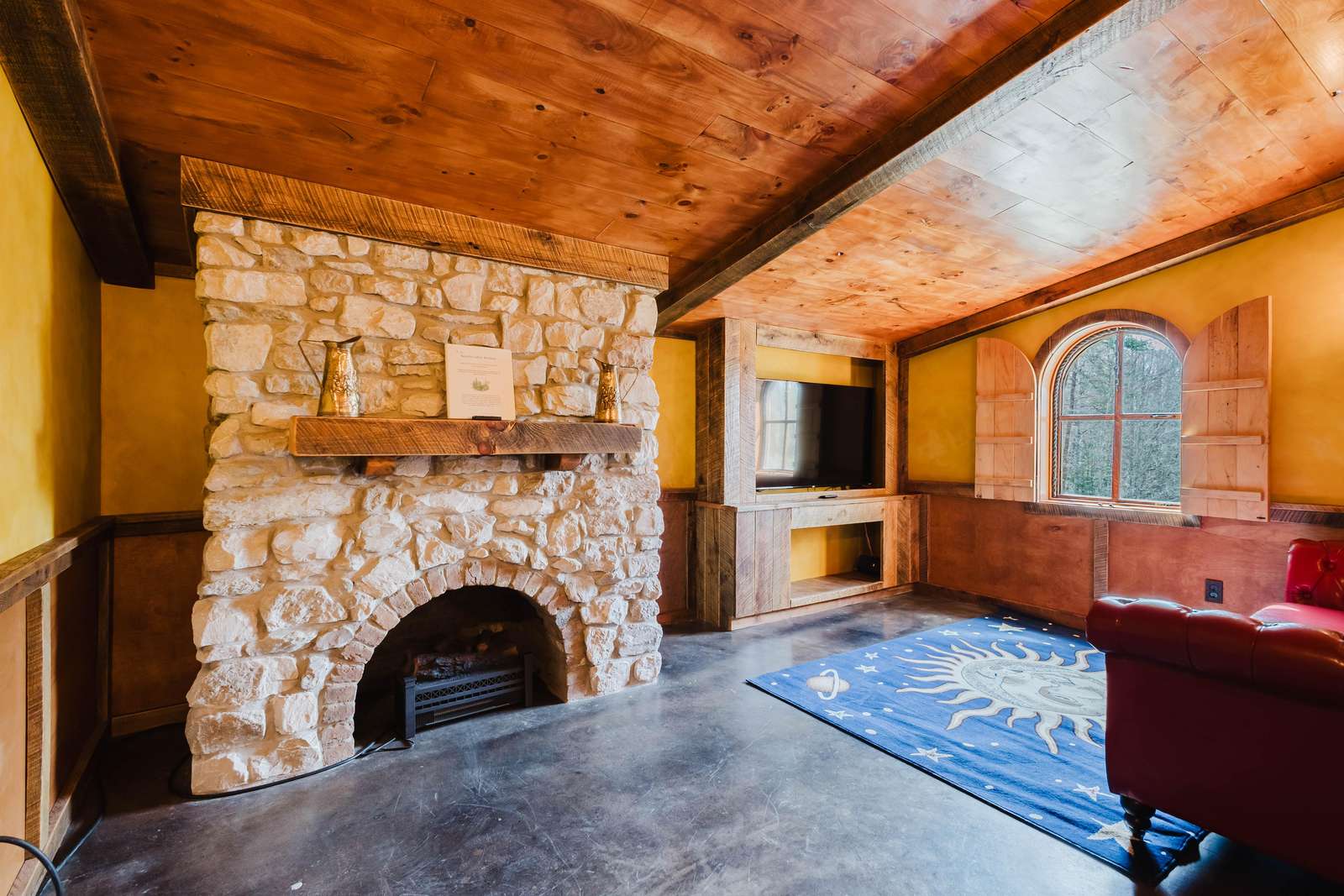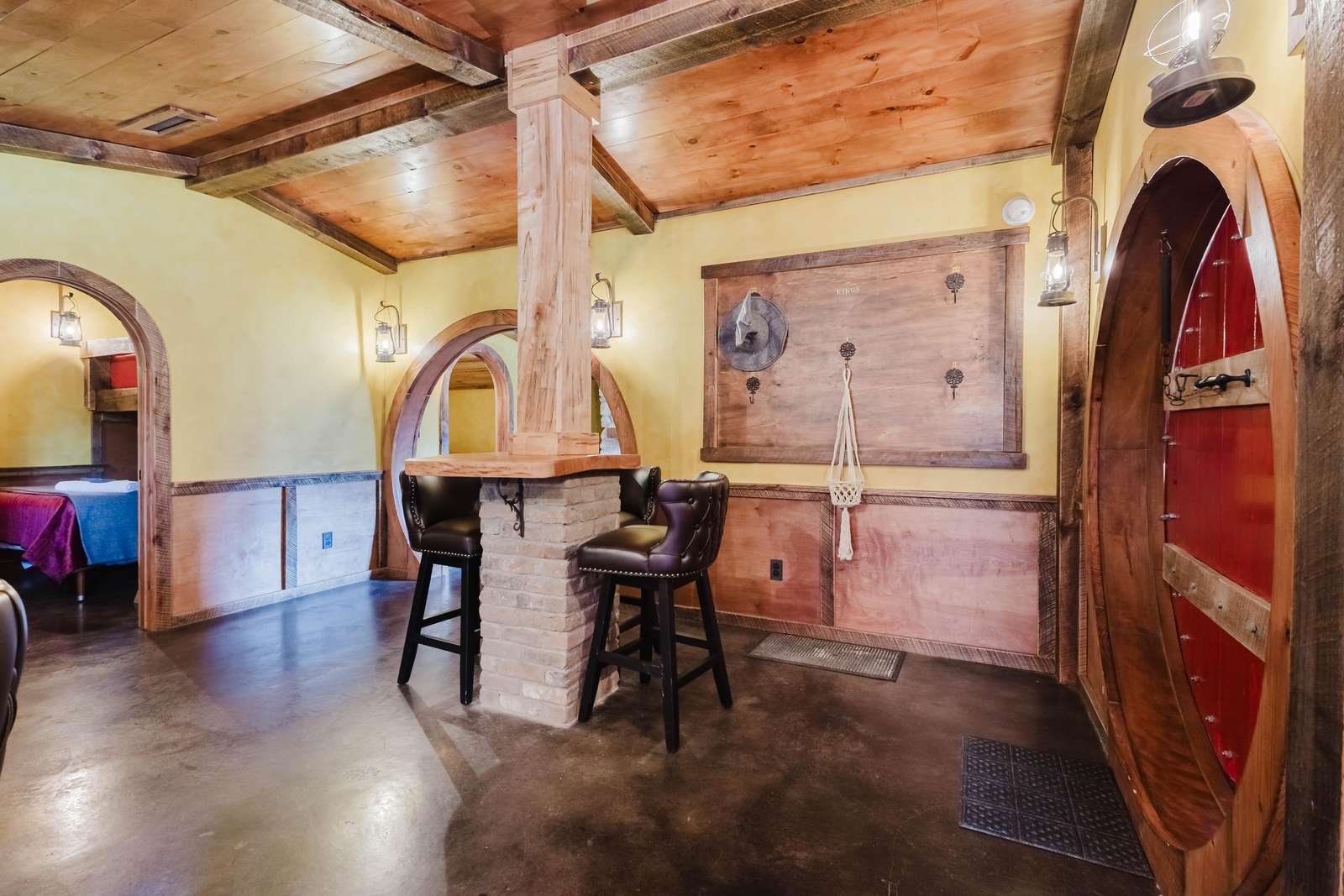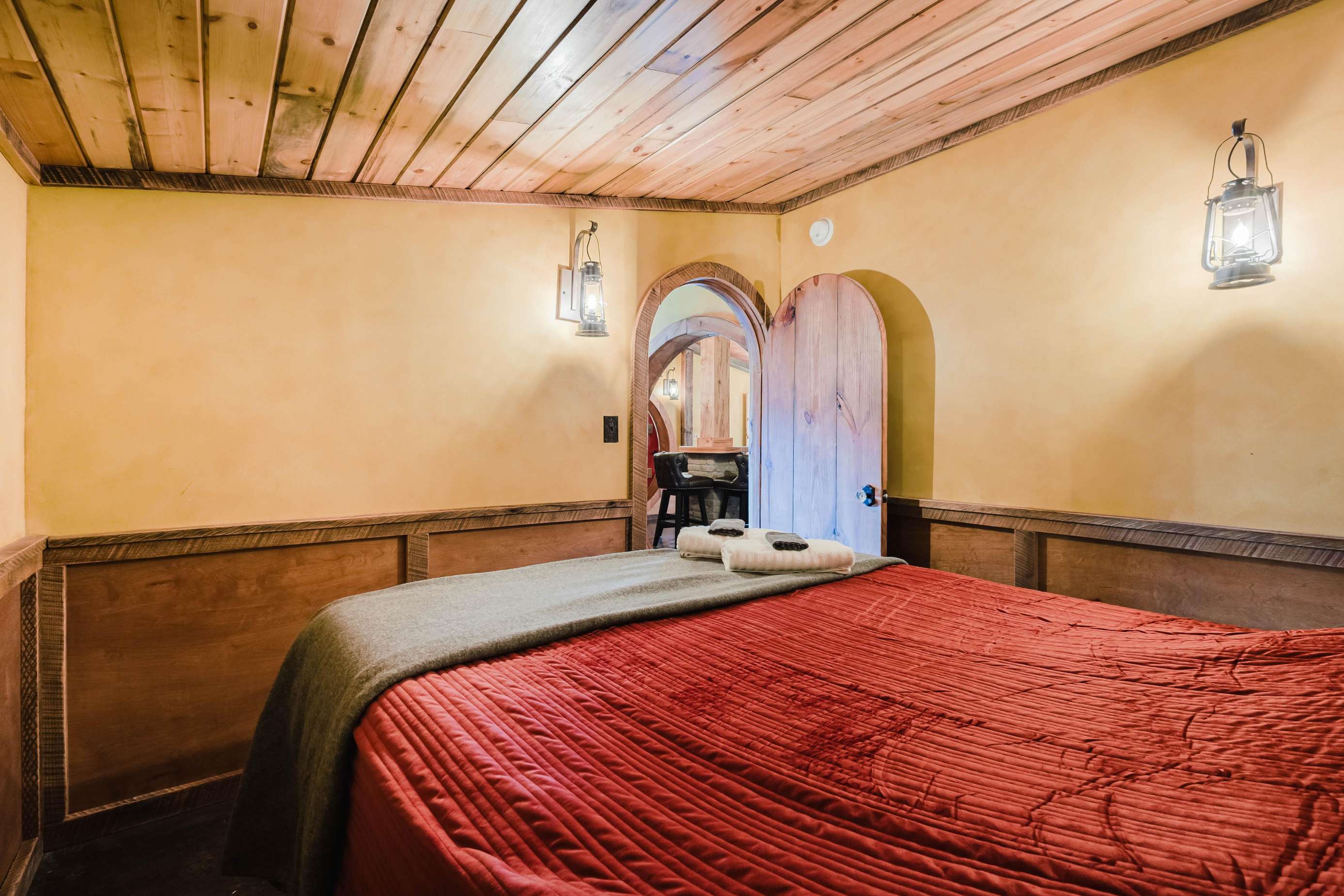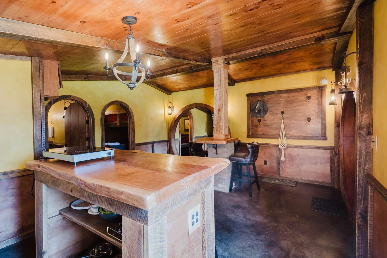 Inside the Red Hobbit, the extent of the craftsmanship and detail come into focus. Entering the iconic hand built round door to the open kitchenette and spacious dining area with bar stool seating at the kitchen island and bar top table. The kitchenette features a Refrigerator, toaster-oven, 2-burner electric cook top, microwave, coffee maker and all of the cookware and dinnerware you need. The adjacent living room has a decorative real stone fireplace with electric Log insert to enjoy while sitting on the couch streaming your favorite program or game on the 55'' flat screen smart TV connected to high speed, fiber optic Wi-Fi.