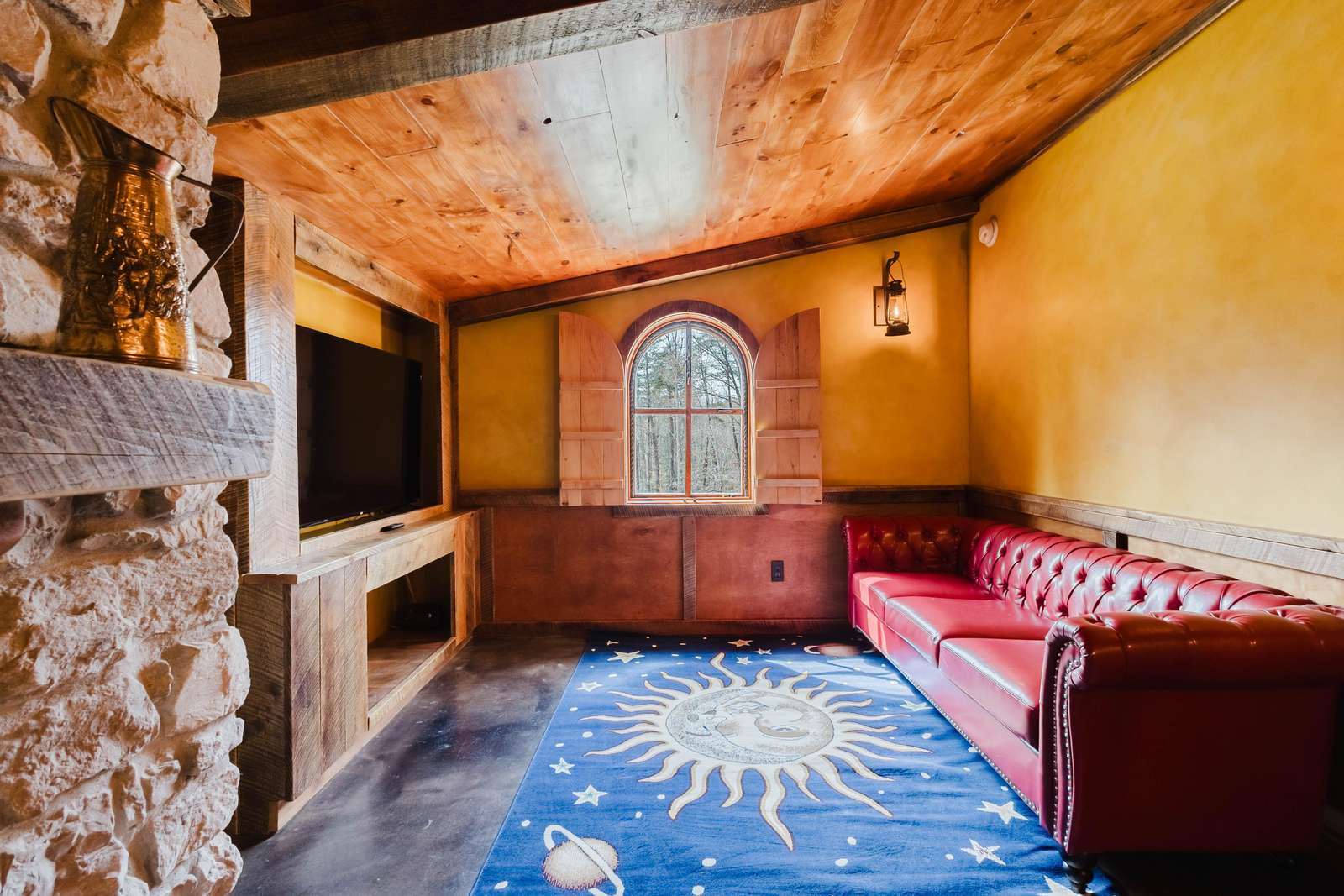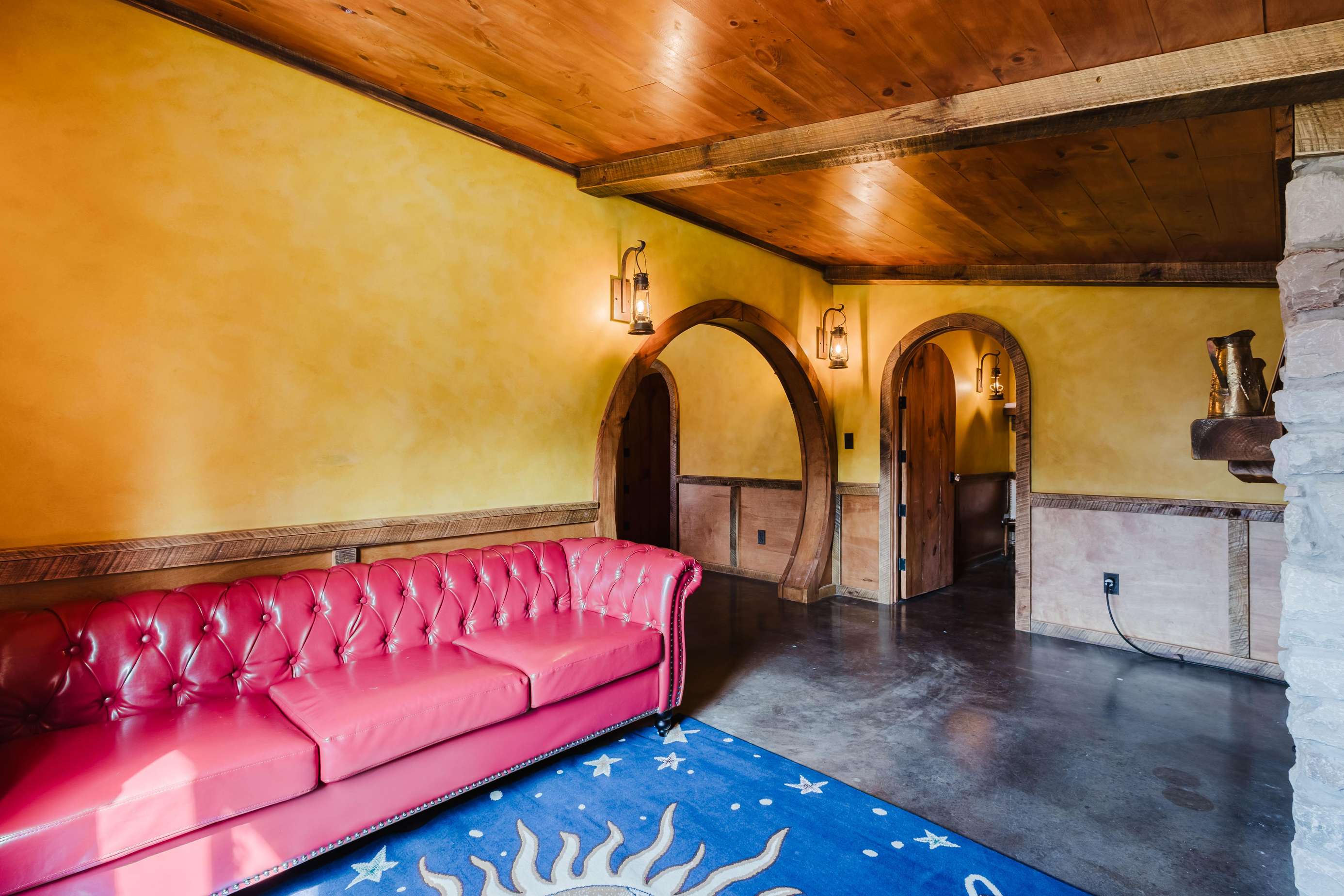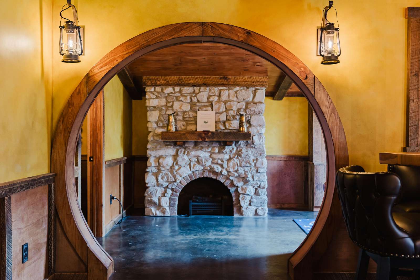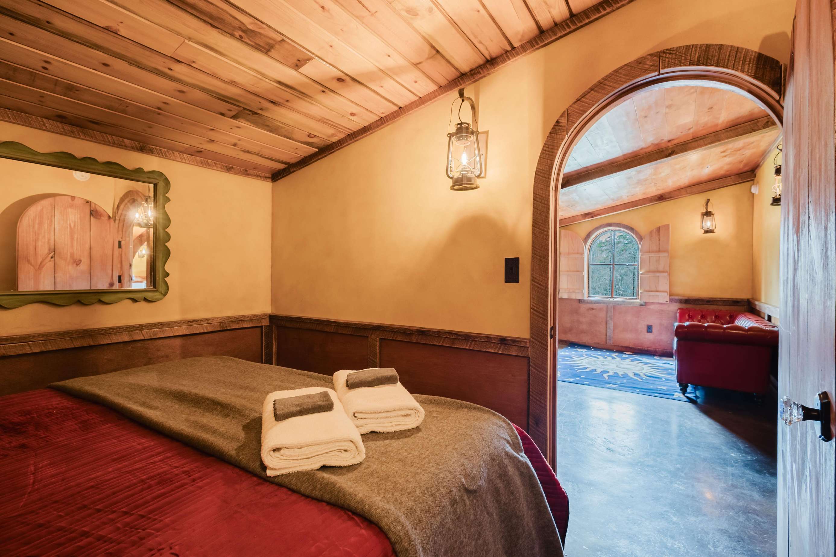 Inside the Red Hobbit, the extent of the craftsmanship and detail come into focus. Entering the iconic hand built round door to the open kitchenette and spacious dining area with bar stool seating at the kitchen island and bar top table. The kitchenette features a Refrigerator, toaster-oven, 2-burner electric cook top, microwave, coffee maker and all of the cookware and dinnerware you need. The adjacent living room has a decorative real stone fireplace with electric Log insert to enjoy while sitting on the couch streaming your favorite program or game on the 55'' flat screen smart TV connected to high speed, fiber optic Wi-Fi.