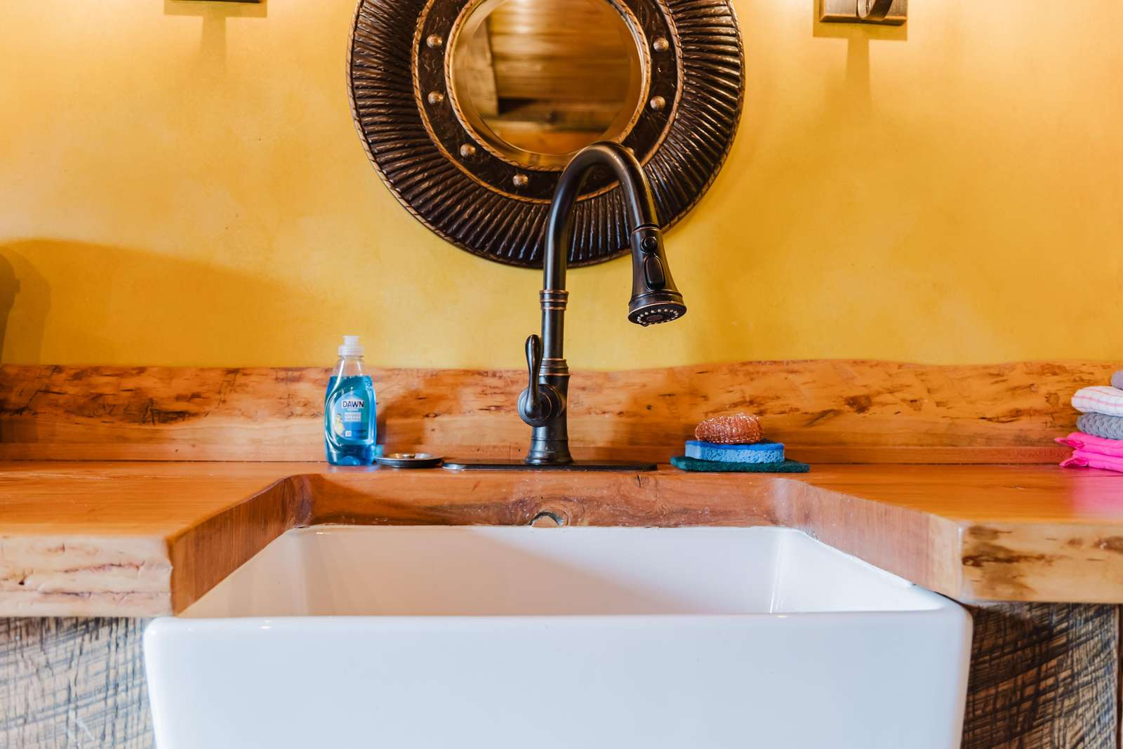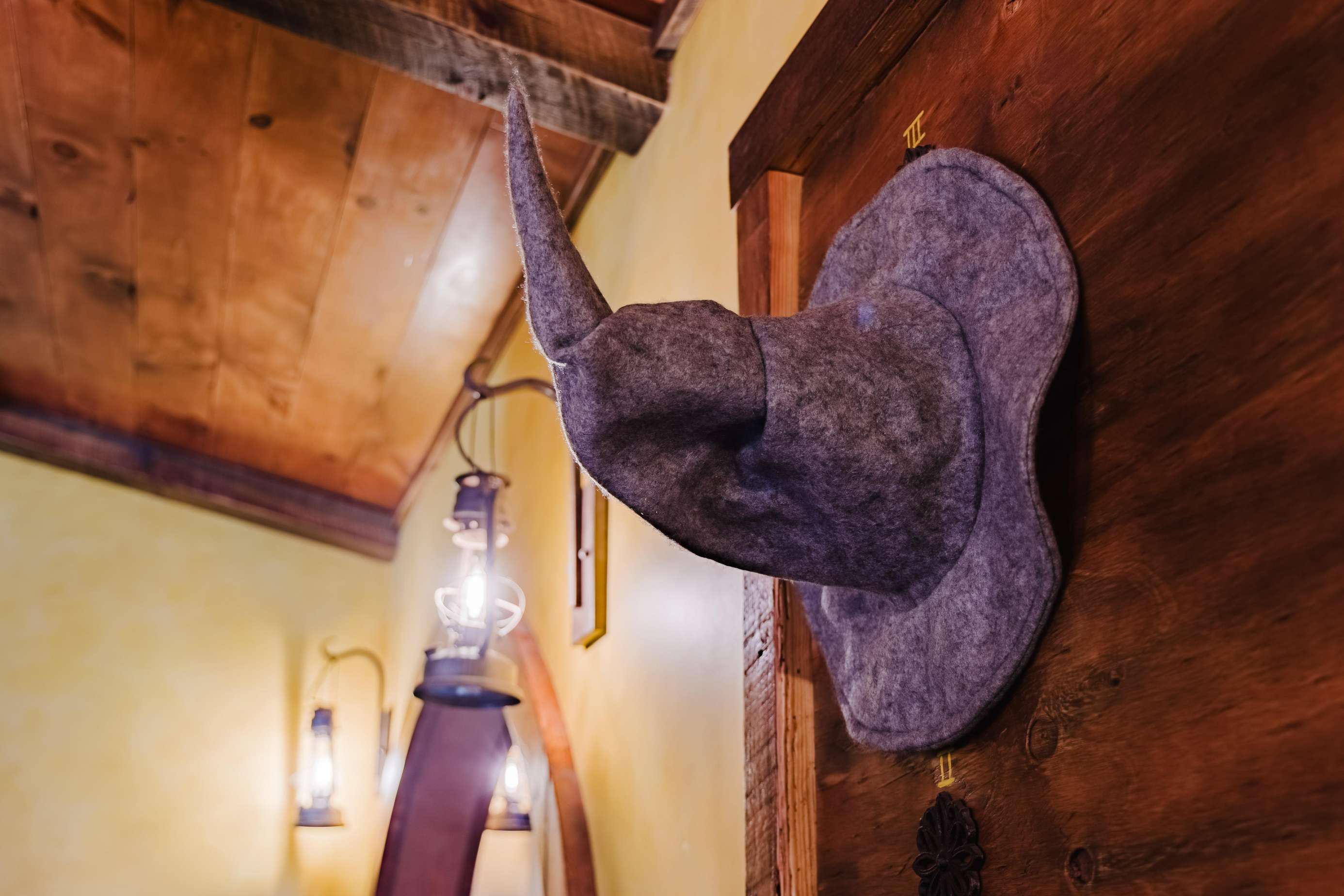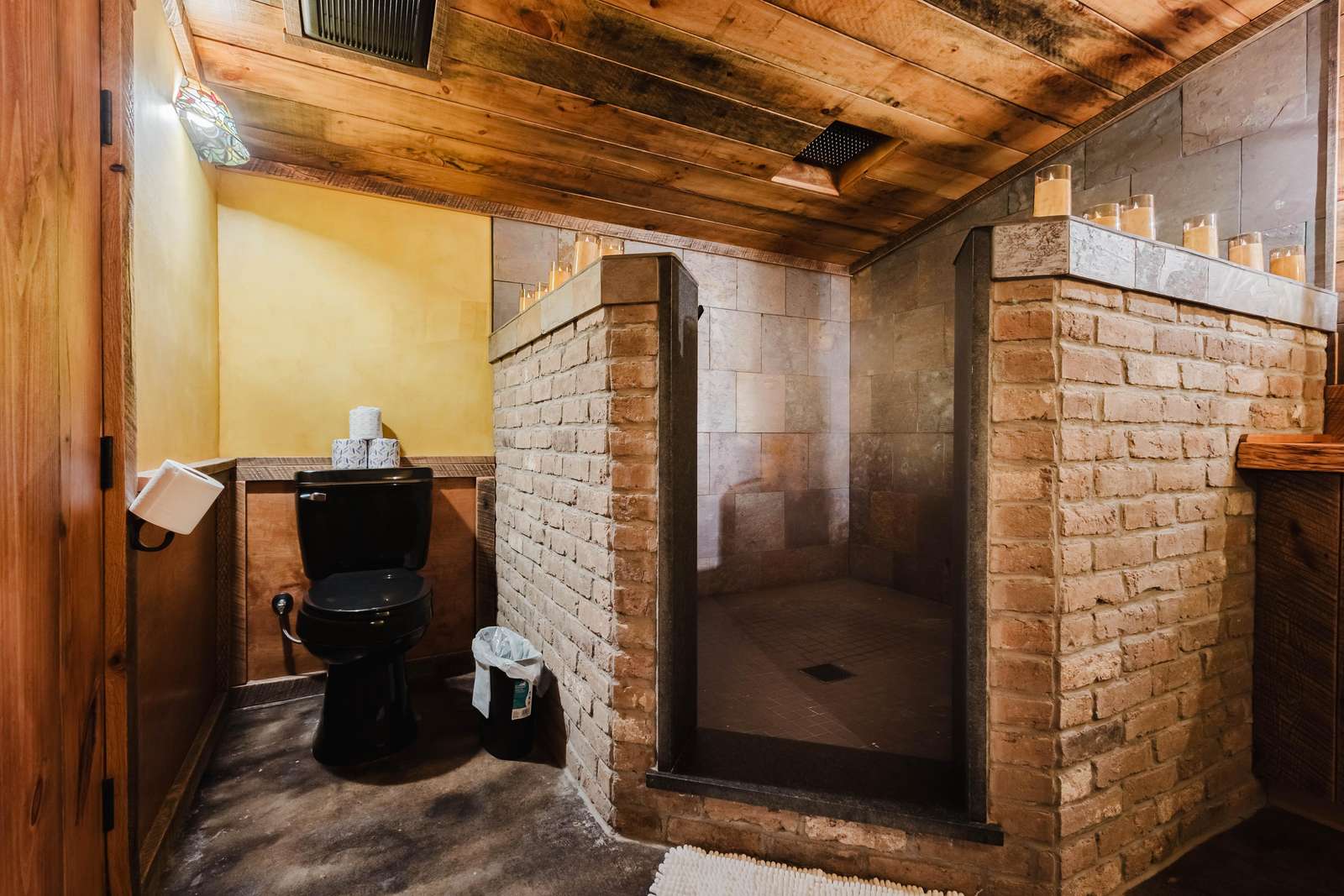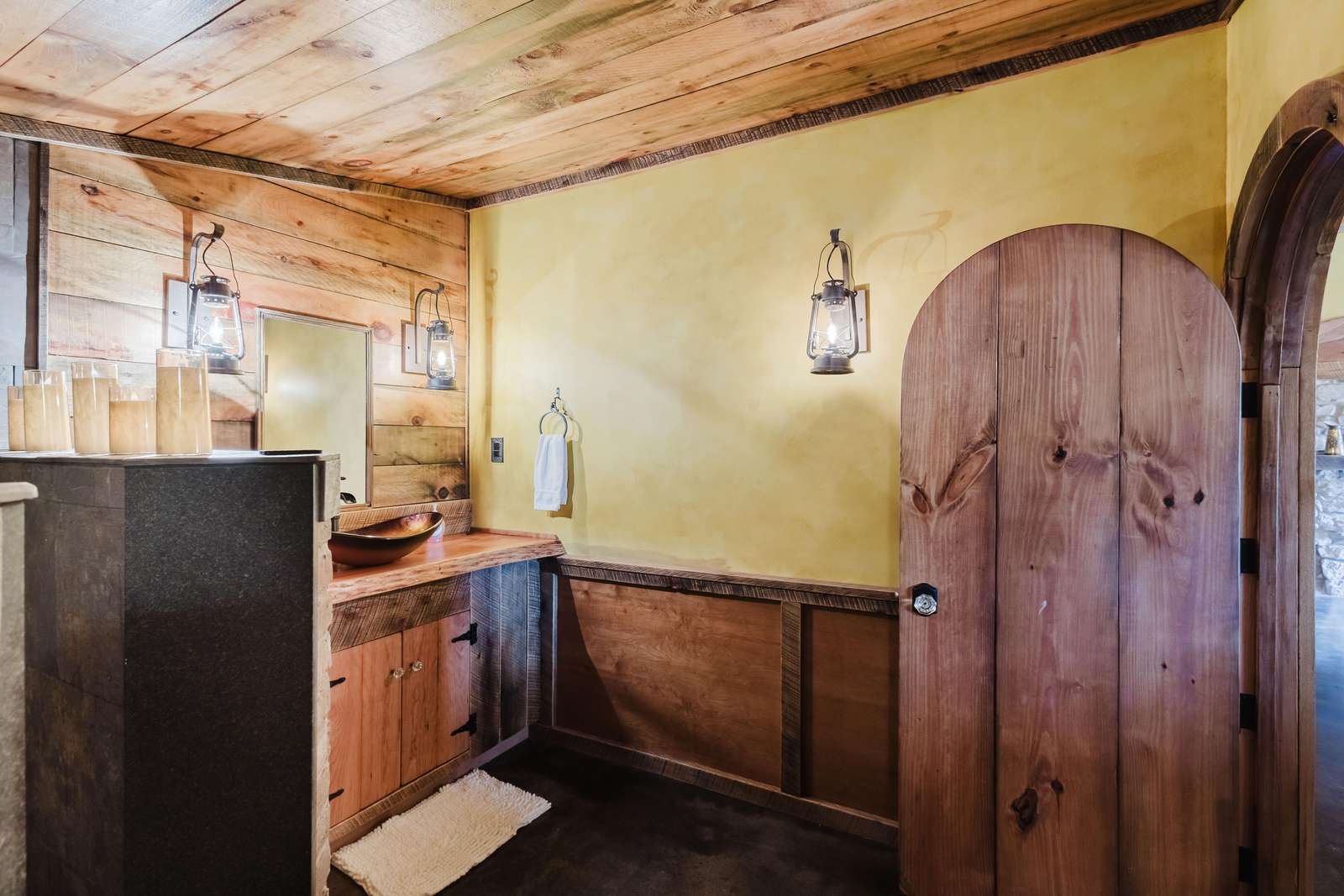Inside the Red Hobbit, the extent of the craftsmanship and detail come into focus. Entering the iconic hand built round door to the open kitchenette and spacious dining area with bar stool seating at the kitchen island and bar top table. The kitchenette features a Refrigerator, toaster-oven, 2-burner electric cook top, microwave, coffee maker and all of the cookware and dinnerware you need. The adjacent living room has a decorative real stone fireplace with electric Log insert to enjoy while sitting on the couch streaming your favorite program or game on the 55'' flat screen smart TV connected to high speed, fiber optic Wi-Fi.