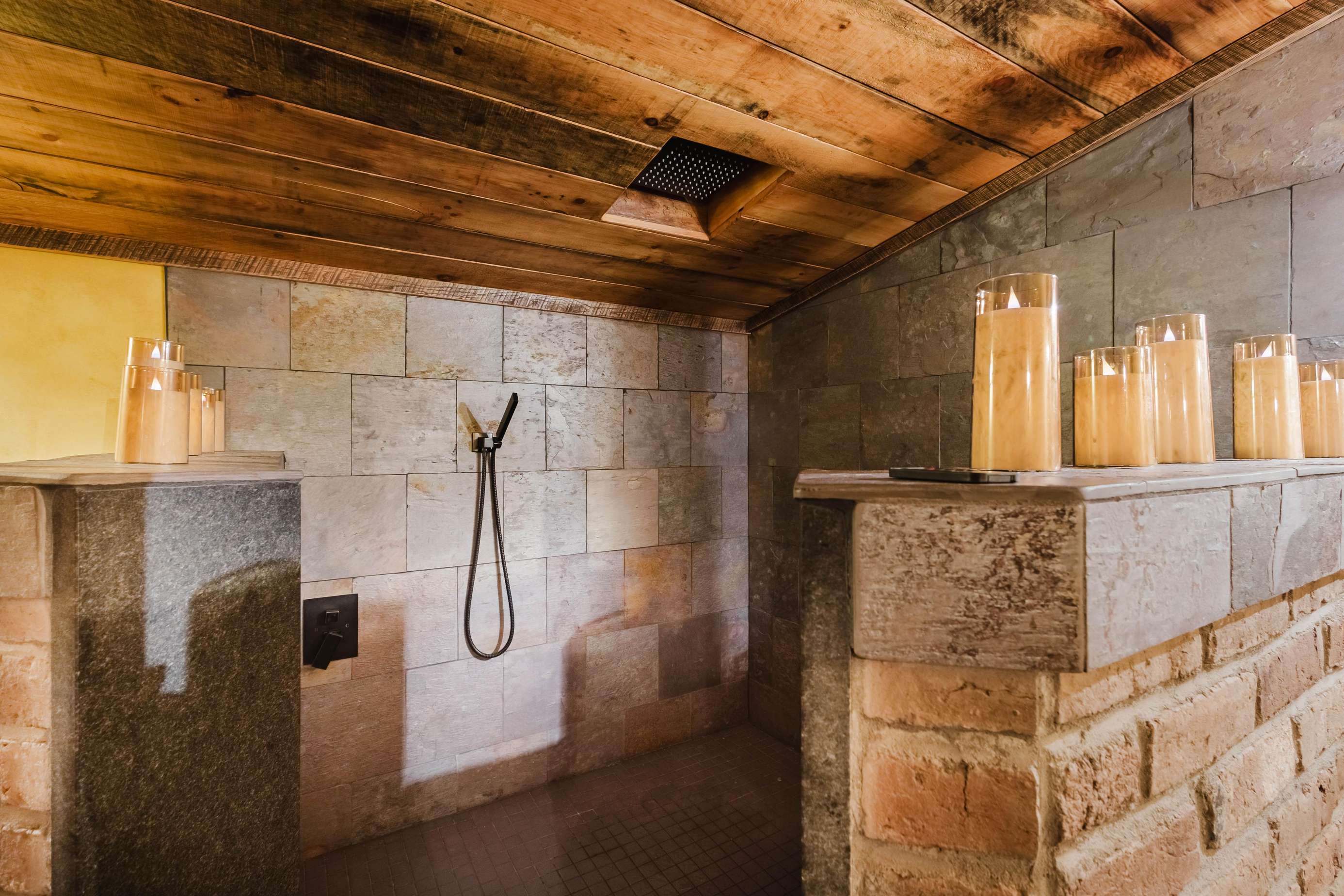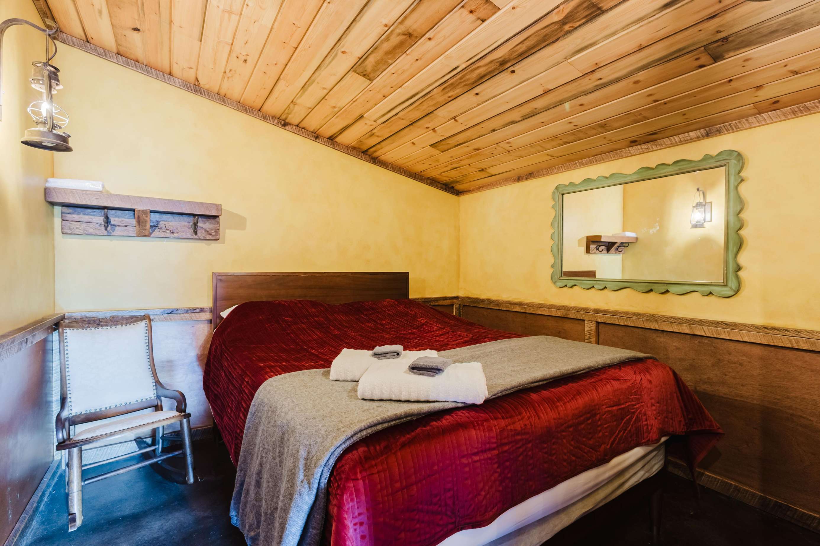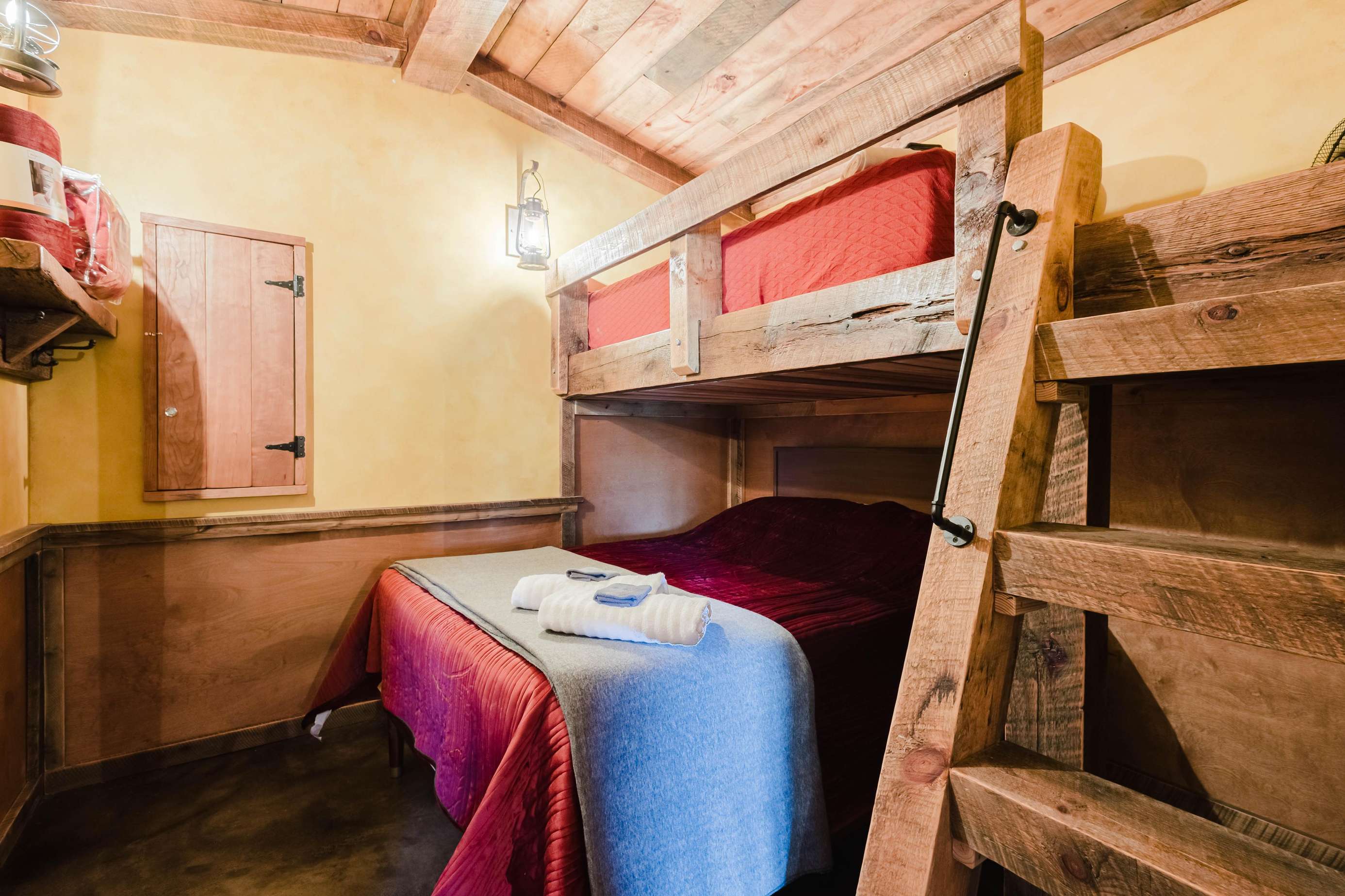 Two private bedrooms: One has a queen memory foam mattress, the 2nd private bedroom has a hand built twin over full bunk bed. Both are memory foam beds. They share the beautiful full bathroom with amazing custom walk-in tile shower with a large rain shower head and hand wand.