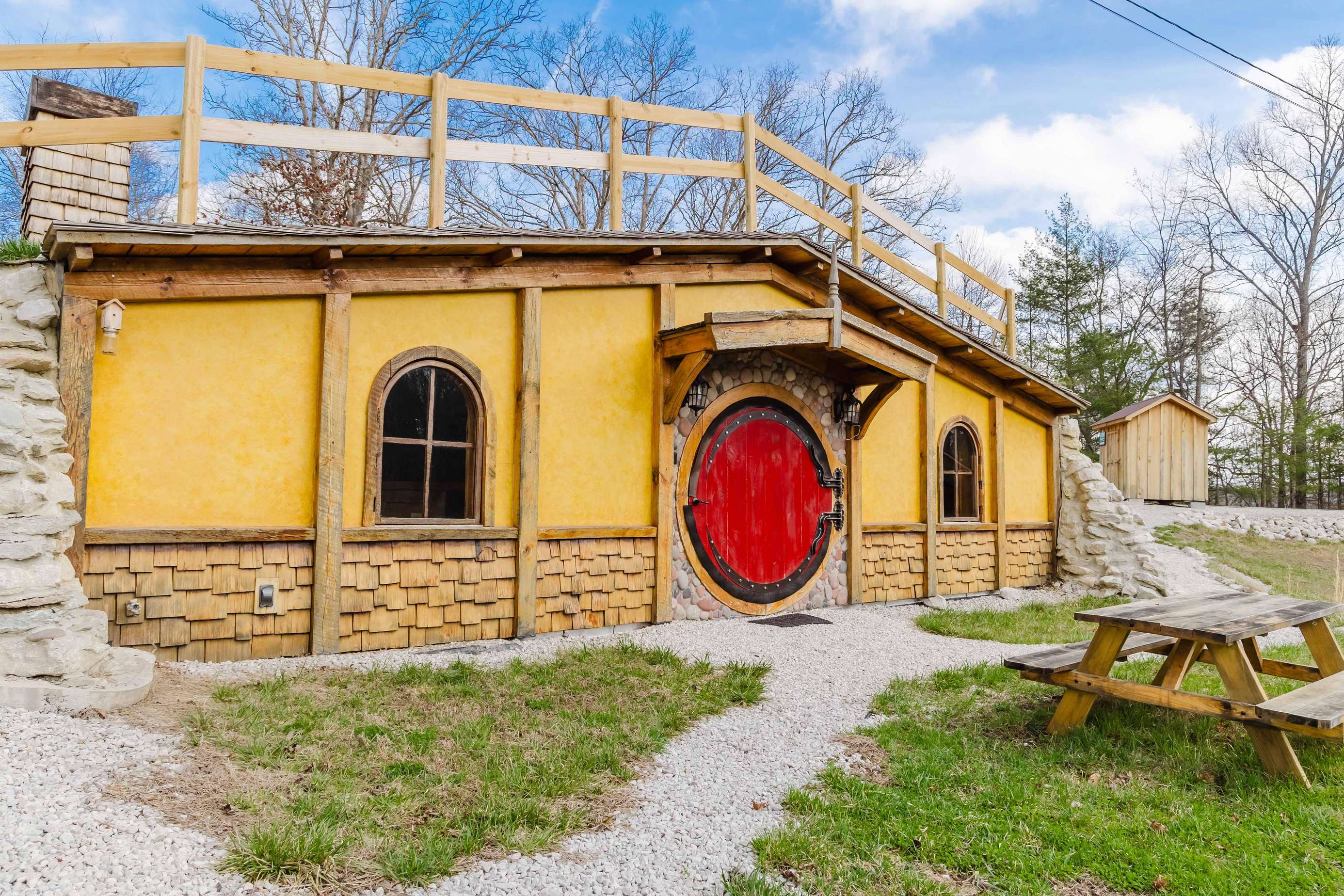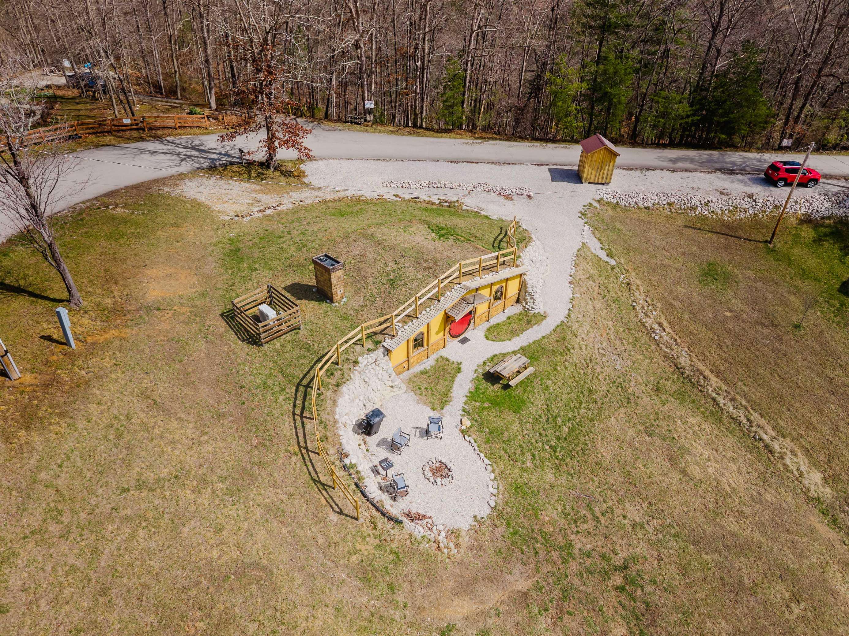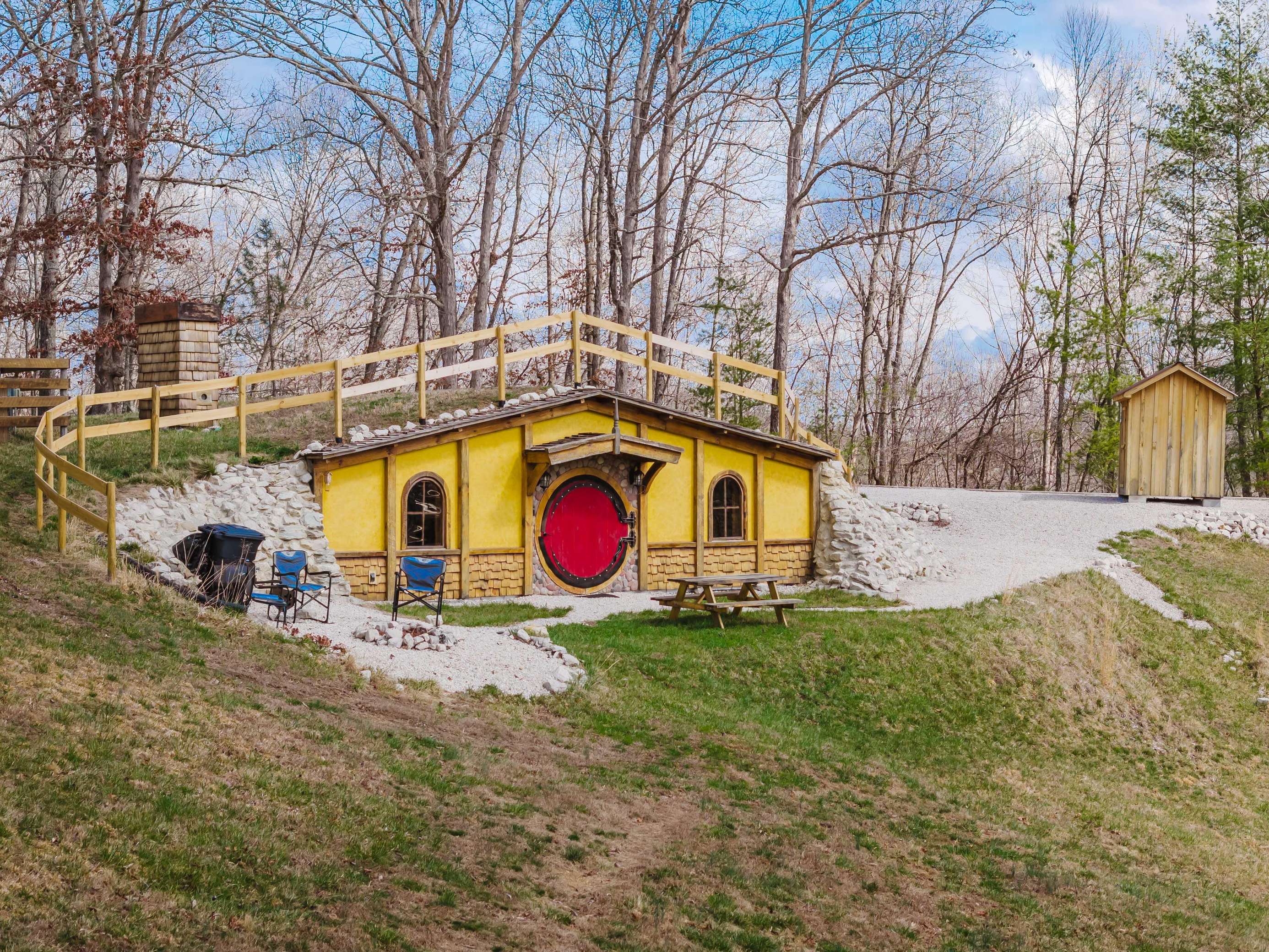 The home every fantasy-con has been looking for. Red Hobbit of Cliffview Resort is an experience of whimsical enchantment. Perfect for 2 couples or a single family with young kids. Centrally located, explore Middle-Earths Red River Gorge through the lens of Frodo and Bilbo Baggins in a real earth-shelter dwelling with modern amenities for an unforgettably unique experience! -with a raised ceiling of course!- Perfect for guests who prefer easy navigation and avoid narrow windy back-roads . Directions to the Red Hobbit hole are as easy as it gets.