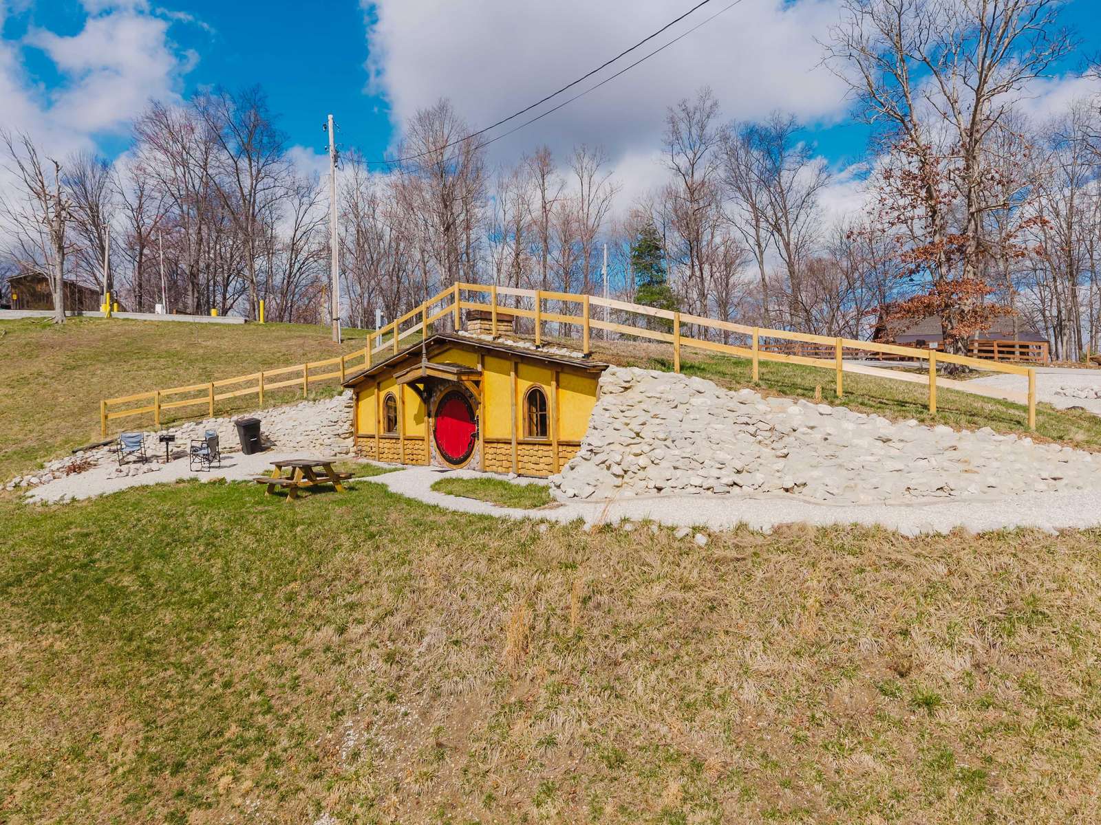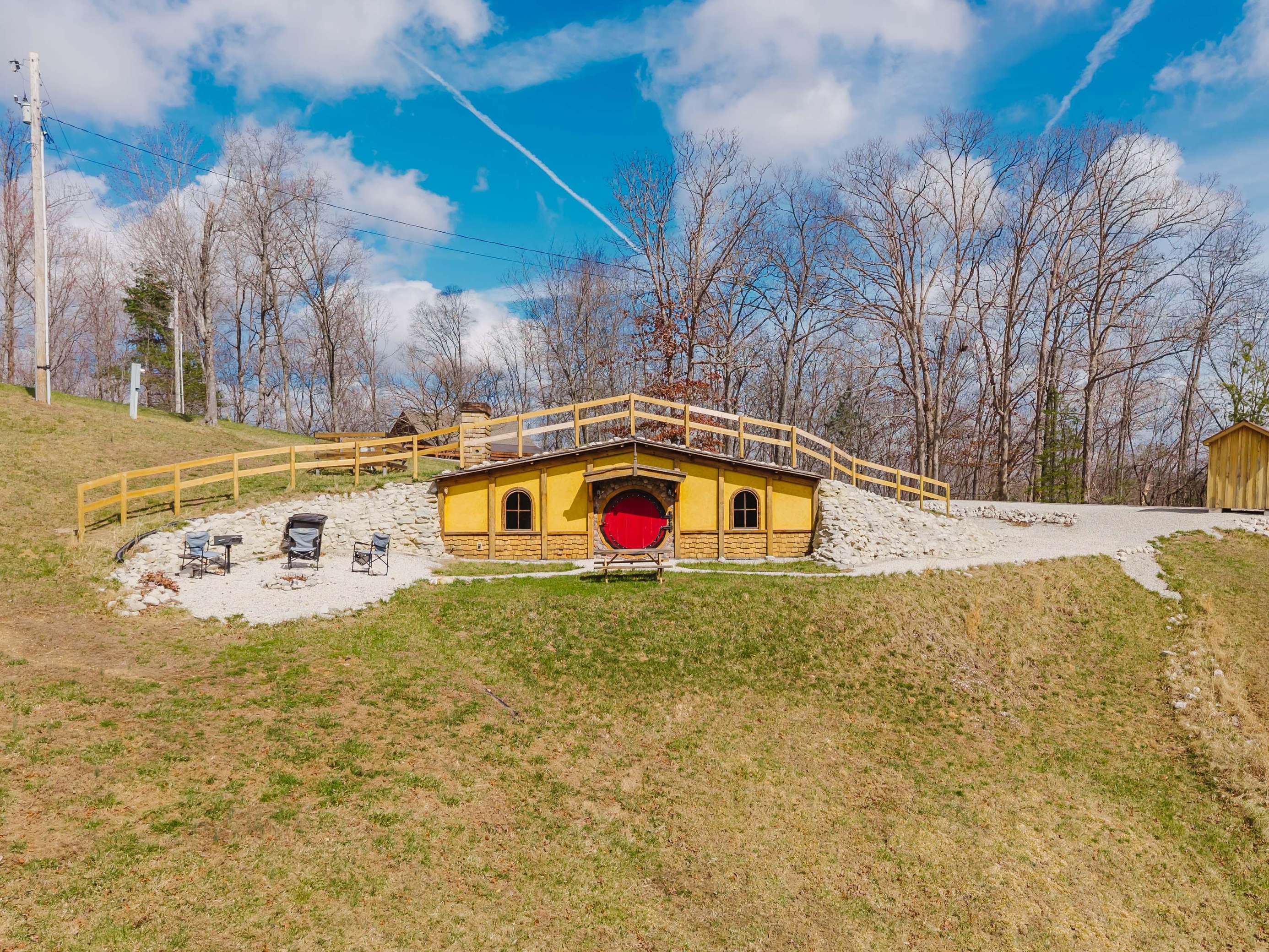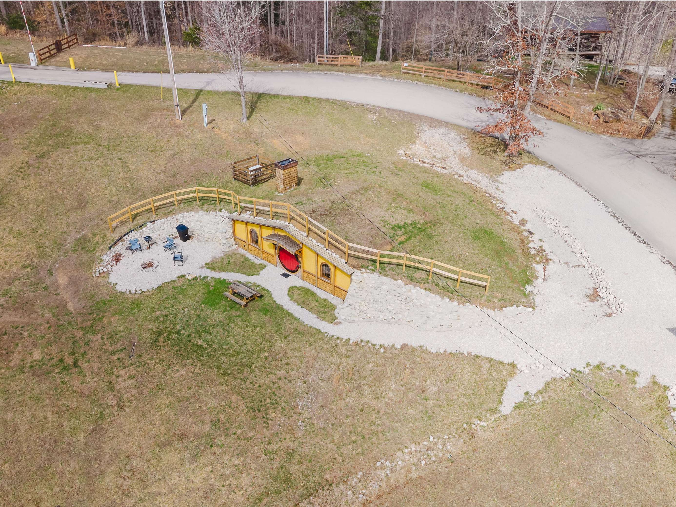 The home every fantasy-con has been looking for. Red Hobbit of Cliffview Resort is an experience of whimsical enchantment. Perfect for 2 couples or a single family with young kids. Centrally located, explore Middle-Earths Red River Gorge through the lens of Frodo and Bilbo Baggins in a real earth-shelter dwelling with modern amenities for an unforgettably unique experience! -with a raised ceiling of course!- Perfect for guests who prefer easy navigation and avoid narrow windy back-roads . Directions to the Red Hobbit hole are as easy as it gets.