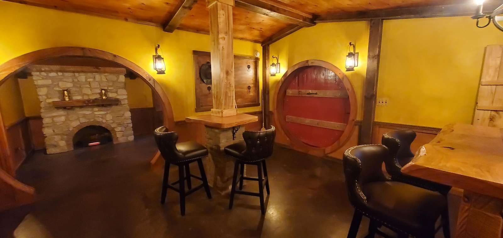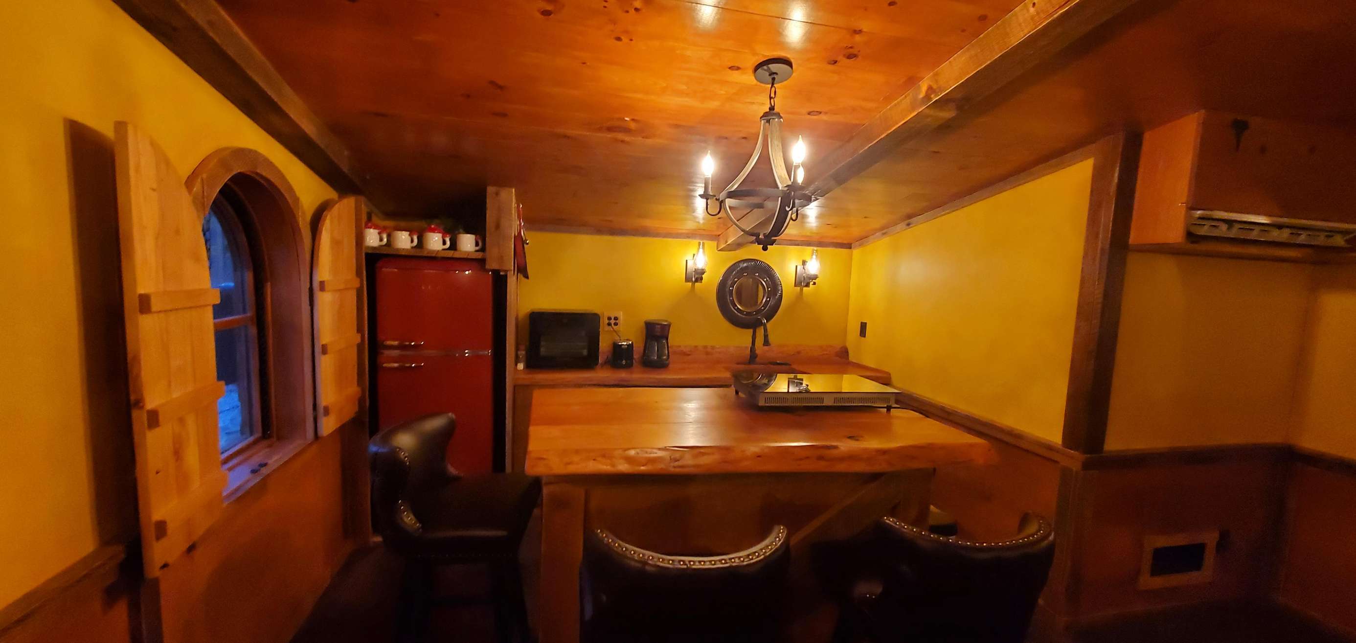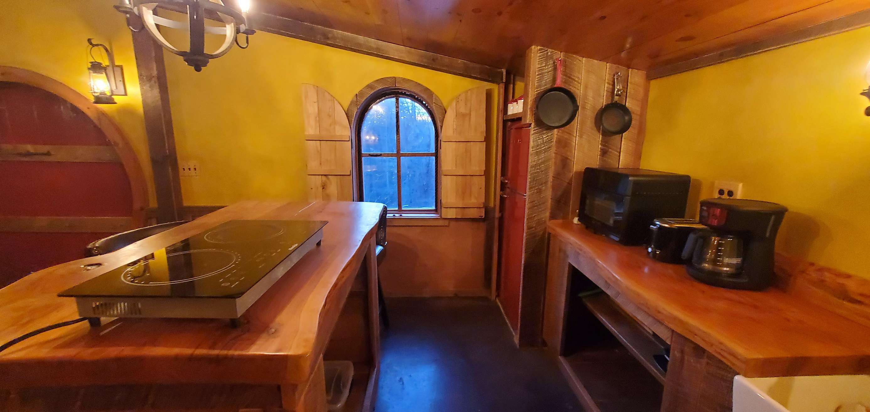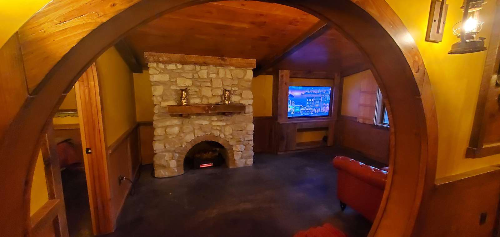 Inside the Red Hobbit, the extent of the craftsmanship and detail come into focus. Enter the iconic hand built round door to the open kitchenette and spacious dining area on bar stool seating at the kitchen island and bar top table. The kitchenette features, Refrigerator, toaster-oven, 2-burner electric cooktop, microwave, coffee maker and all of the cookware and dinnerware you need. The adjacent living room has a decorative real stone fireplace with electric Log insert to enjoy while sitting on the couch streaming your favorite program or game on the 55'' flat screen smart TV connected to the high speed fiber optic Wi-Fi.