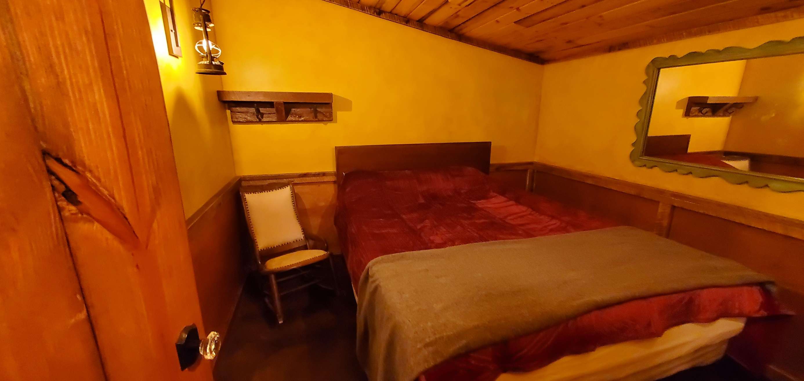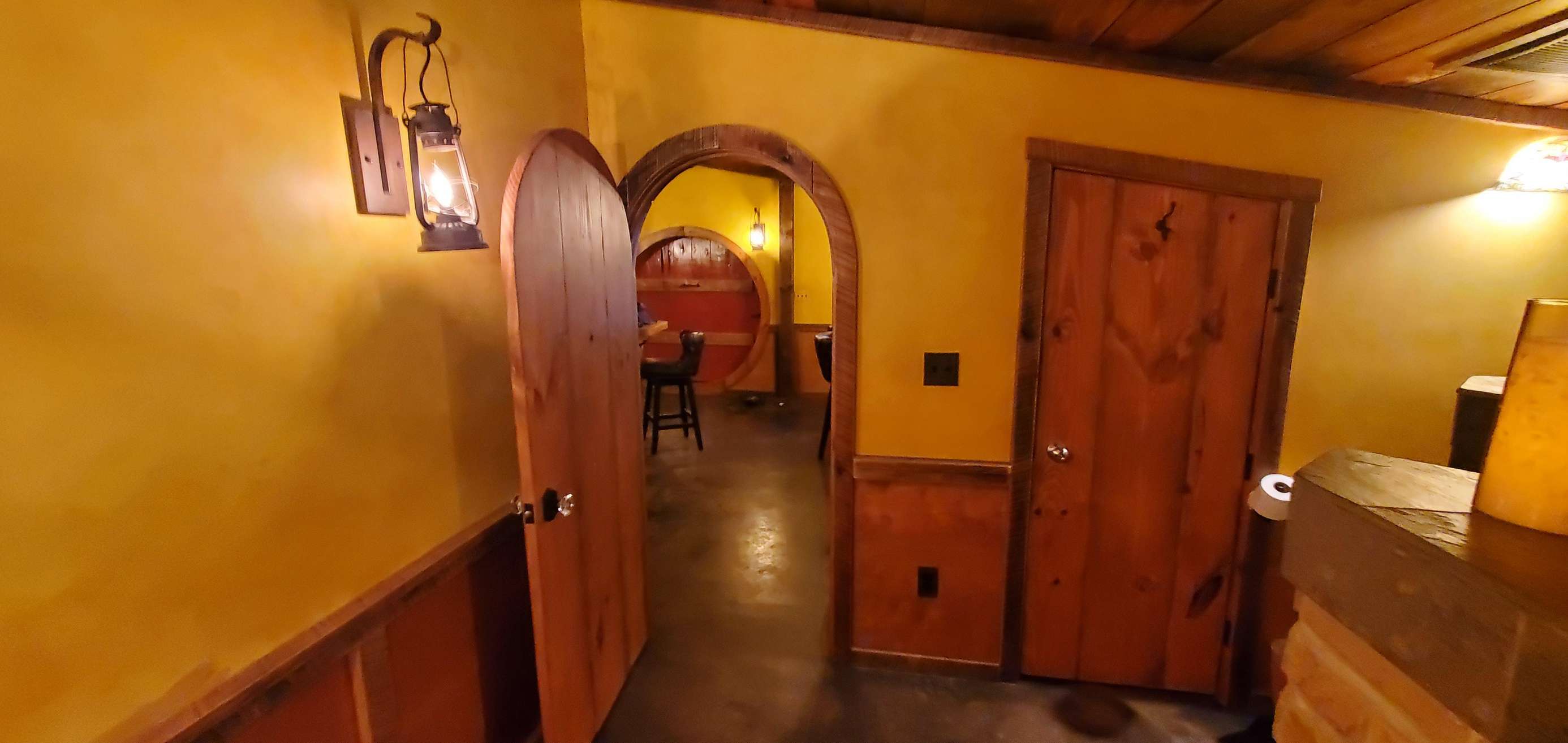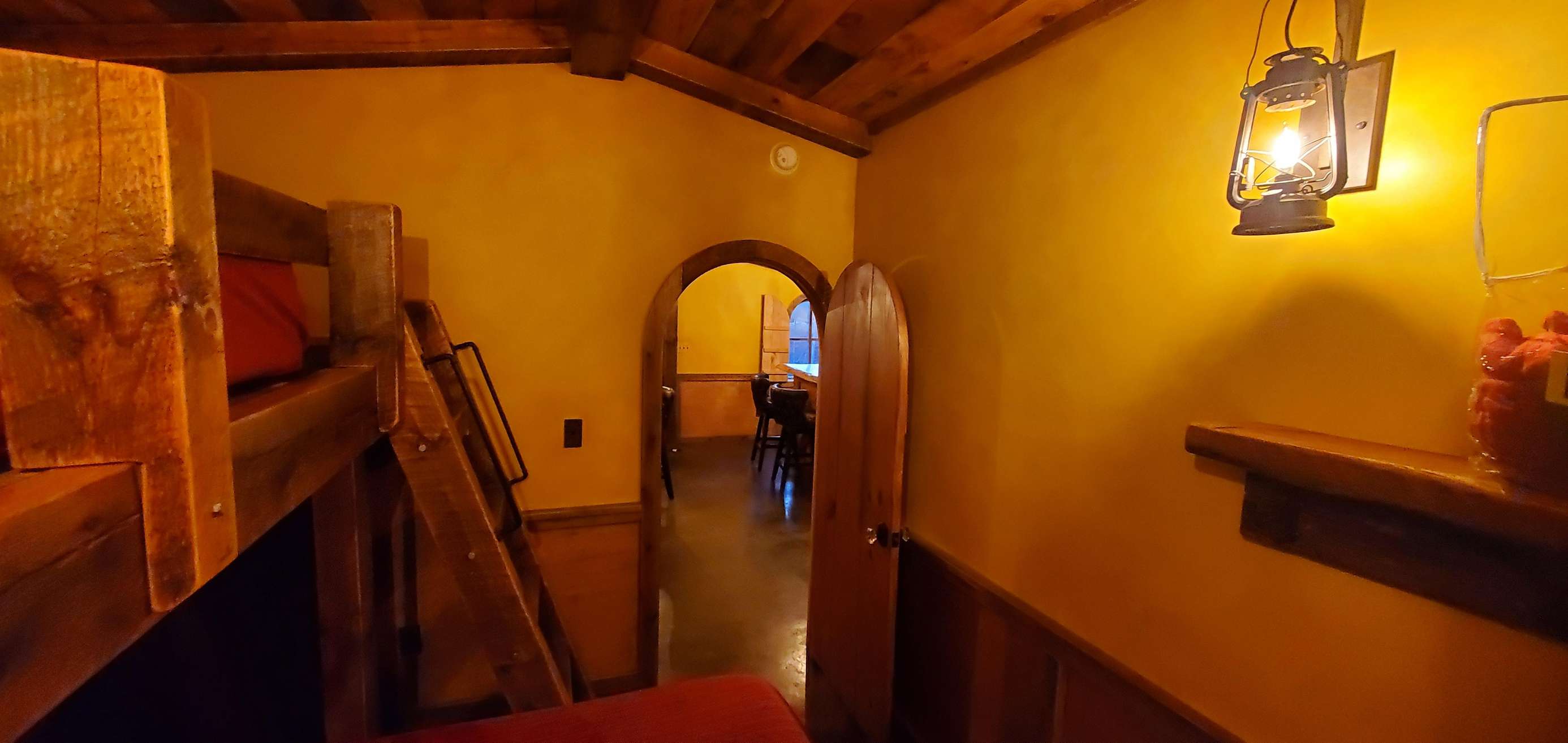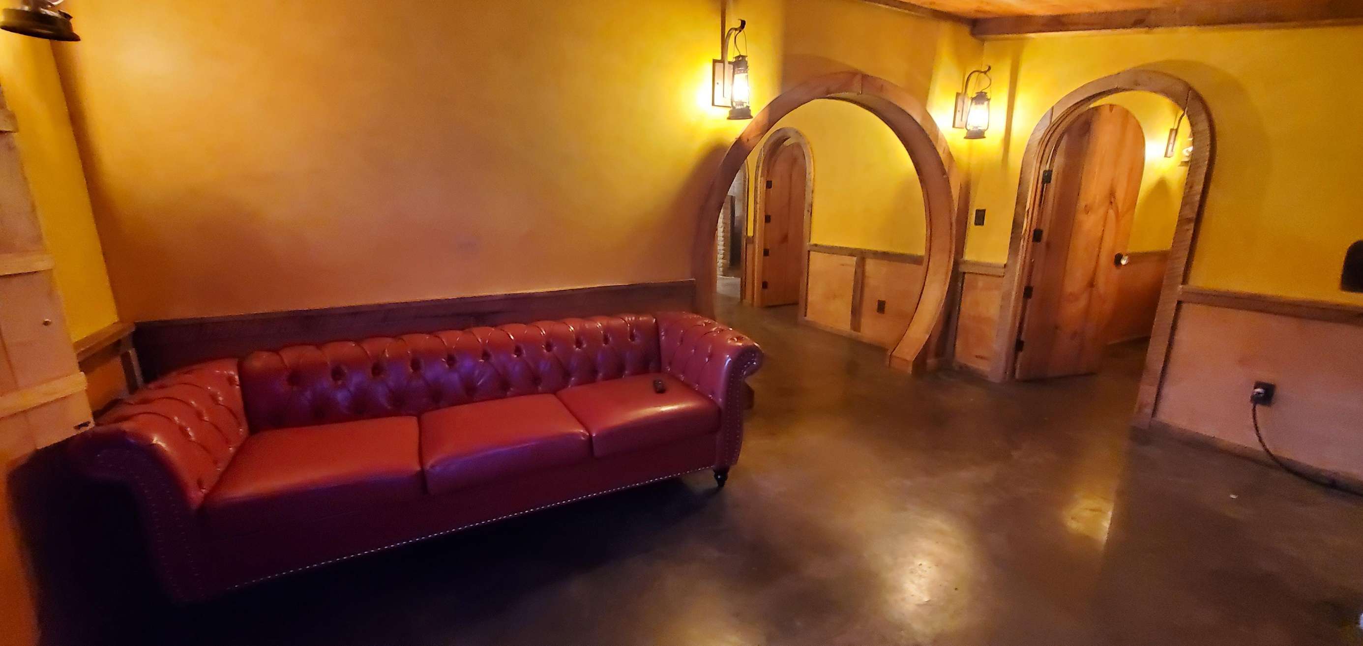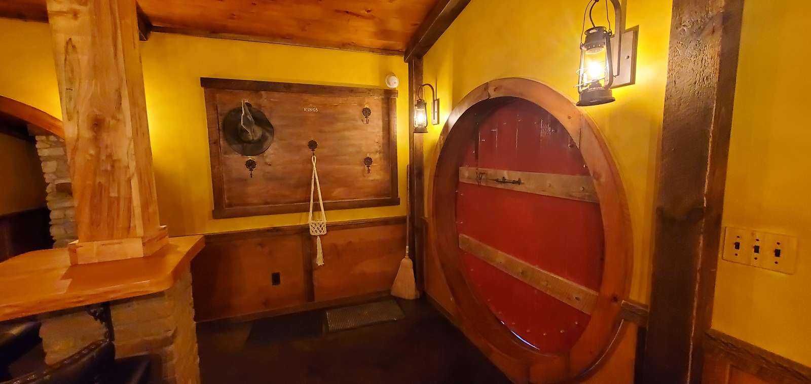 Inside the Red Hobbit, the extent of the craftsmanship and detail come into focus. Enter the iconic hand built round door to the open kitchenette and spacious dining area on bar stool seating at the kitchen island and bar top table. The kitchenette features, Refrigerator, toaster-oven, 2-burner electric cooktop, microwave, coffee maker and all of the cookware and dinnerware you need. The adjacent living room has a decorative real stone fireplace with electric Log insert to enjoy while sitting on the couch streaming your favorite program or game on the 55'' flat screen smart TV connected to the high speed fiber optic Wi-Fi.
