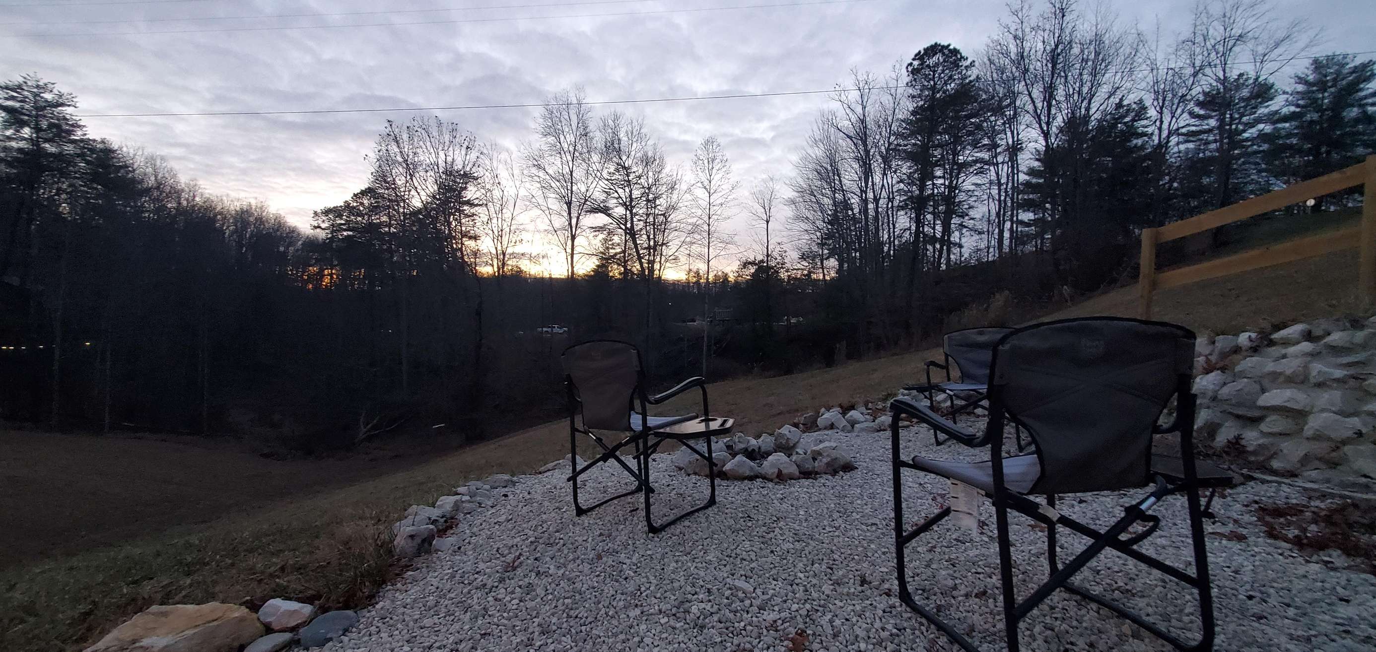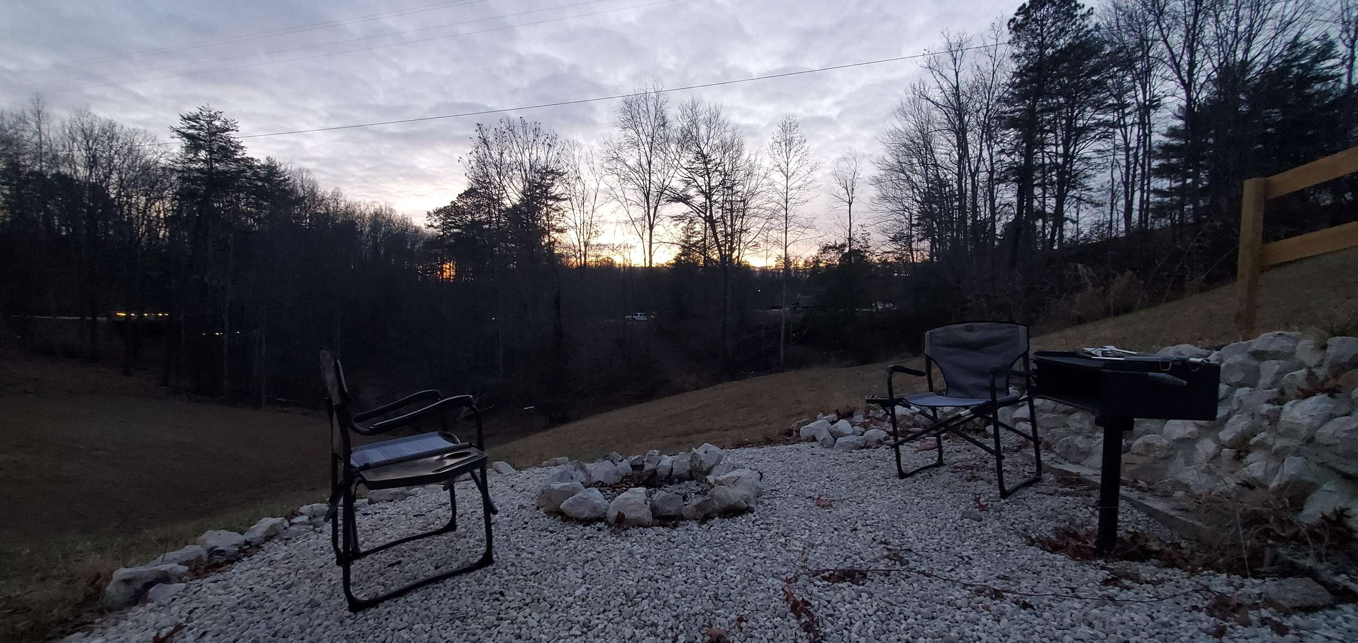 Outside is a park style charcoal grill, built in campfire pit with seating for toasting s'mores and outdoor dining picnic table.