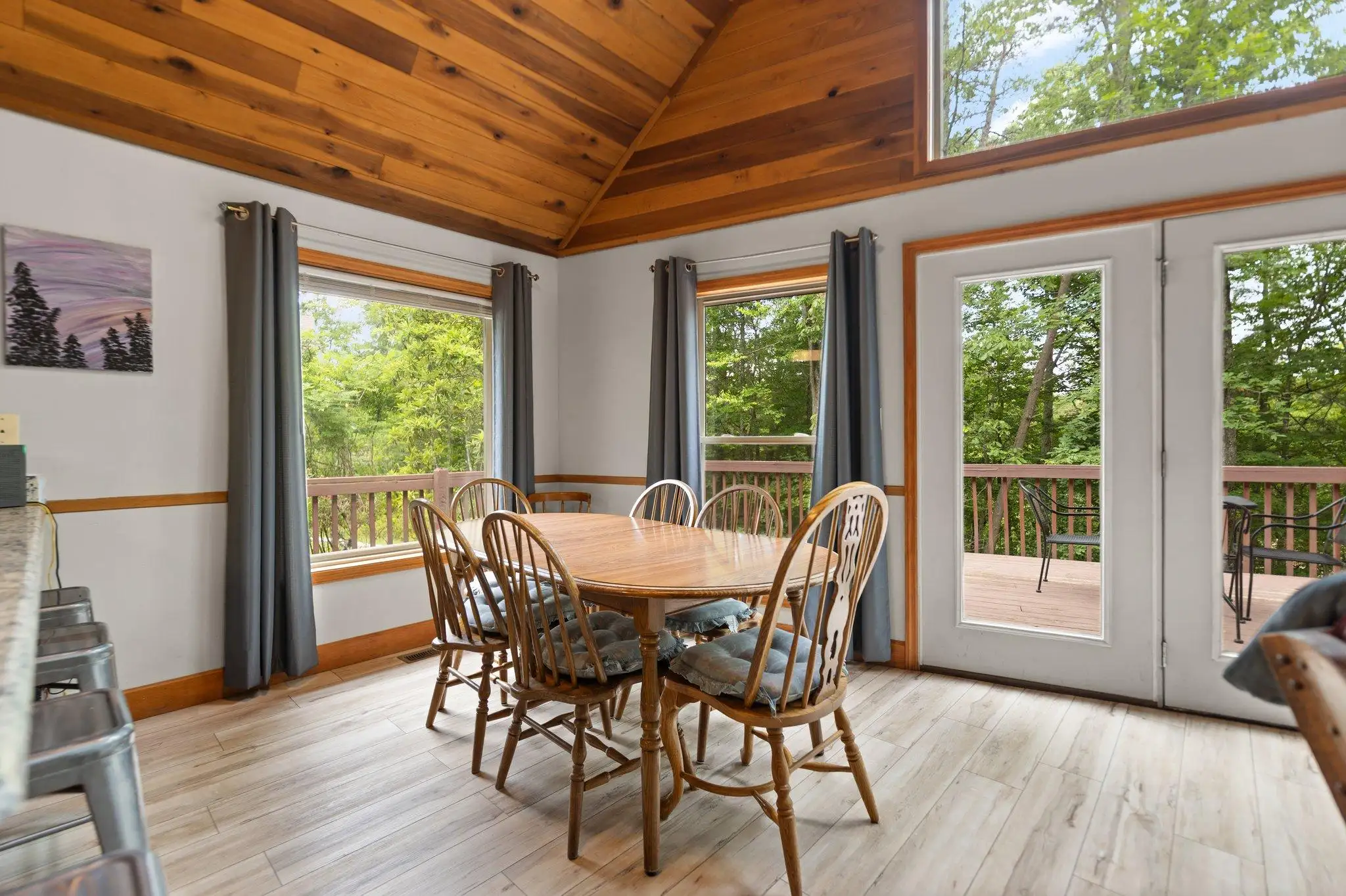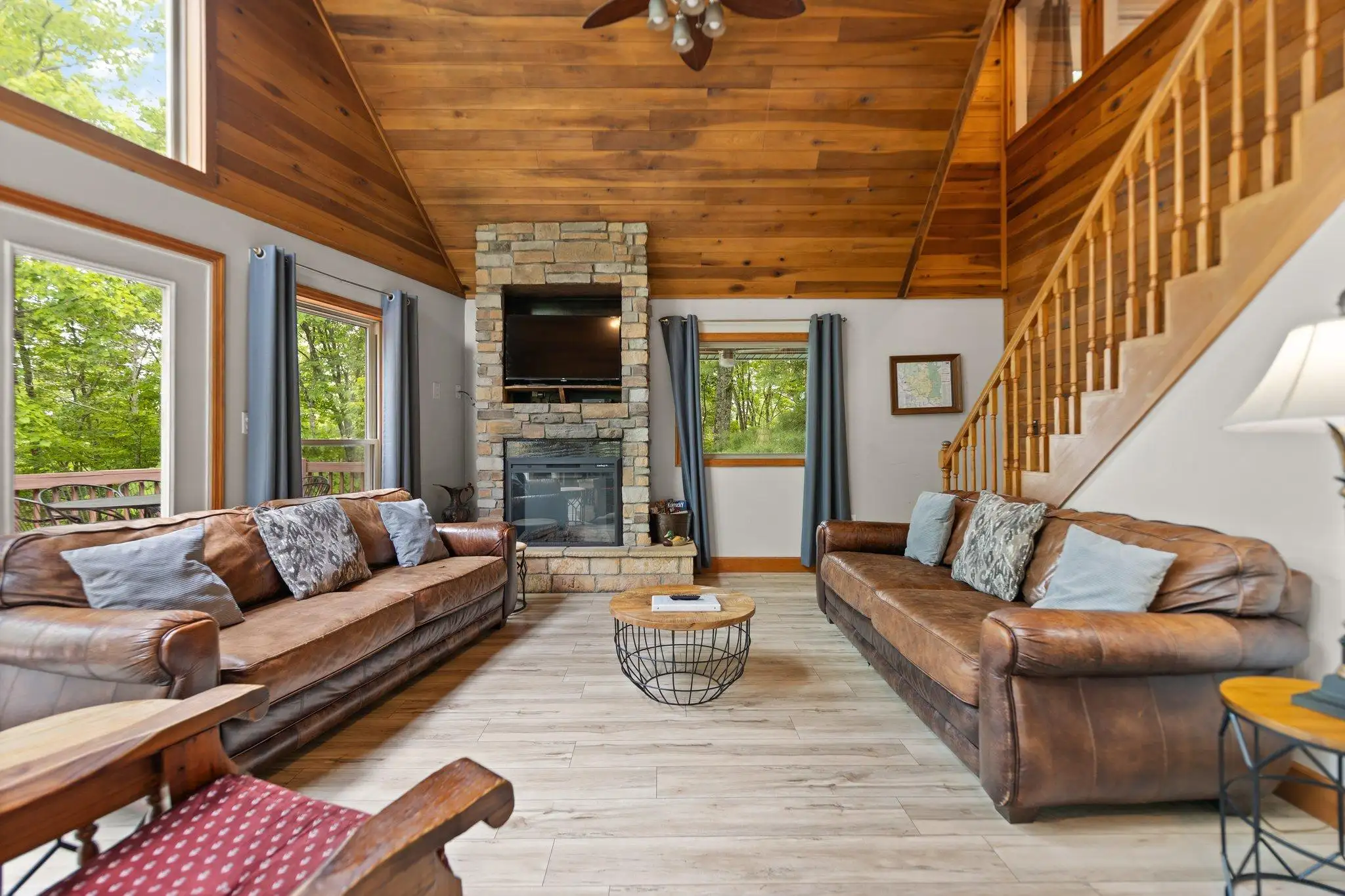 The main living space is open to the kitchen, dining table and living area with floor to ceiling picture frame windows letting in lots of natural light showcasing the scenic forested backdrop. The kitchen has a large wrap around counter with bar stool seating. Plenty of counter space. It comes with all the modern amenities including New refrigerator, microwave, dishwasher, oven/range, toaster and all of the cookware and dishware you need for a weekend getaway or extended stay. The living room is lined with plush sofas and chairs to unwind and relax after the days activities. Fiber optic Wi-Fi is connected to the flat screen Smart TV for entertainment. Cabin has central gas Heat/AC, Jacuzzi tub, stone fireplace,dvd player, and plenty of plush couch seating to unwind and relax after the days activities!