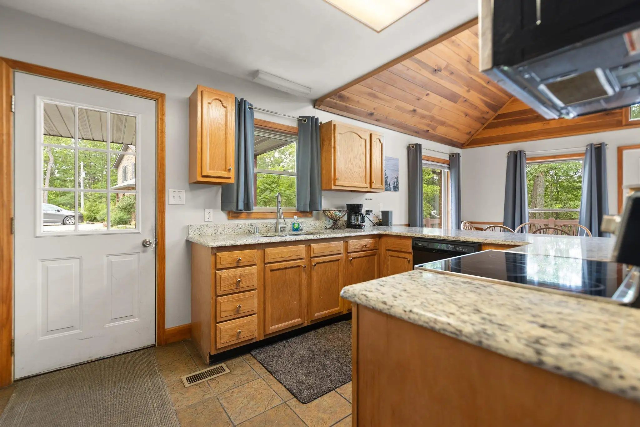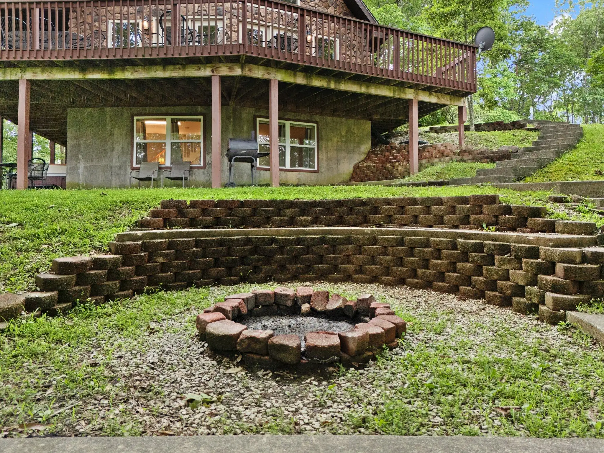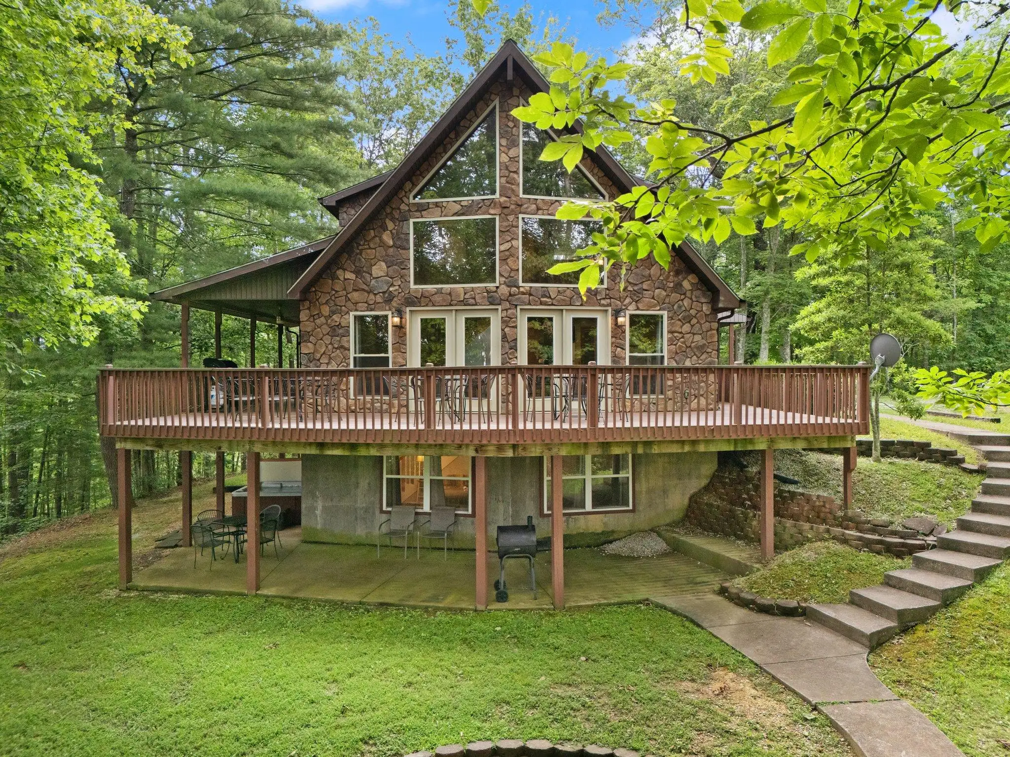 Outside is a private 5 person hot tub shaded from the rain and snow under the covered porch. The wrap around deck is partially covered and has a gas grill, charcoal grill both under shelter from the elements for no rain out grilling. There are tables and chairs for outdoor dining on the open deck to take in the scenery. The yard is home to a large stone fire pit with built in seating with plenty of space for everyone to enjoy toasting s'mores.