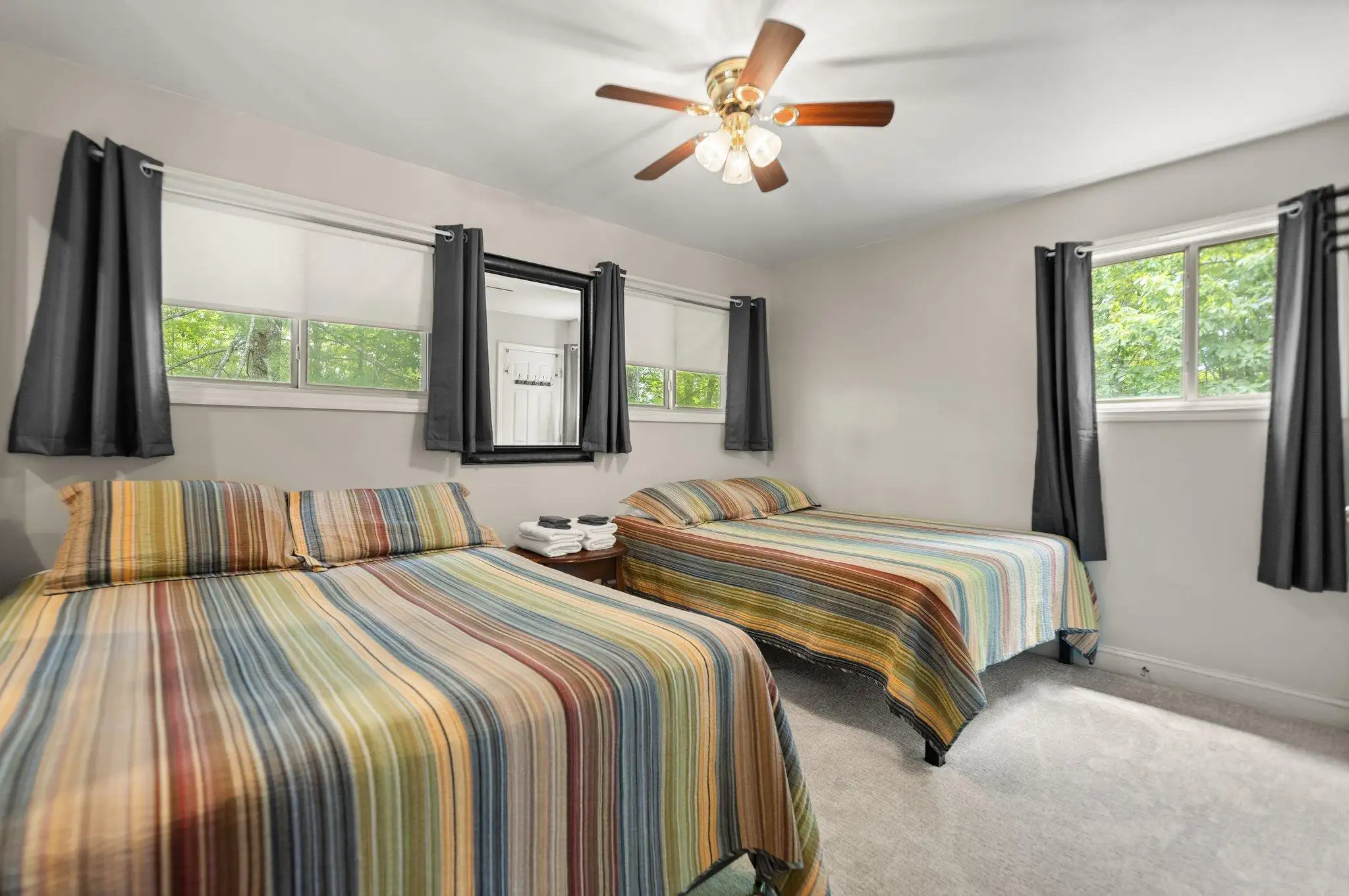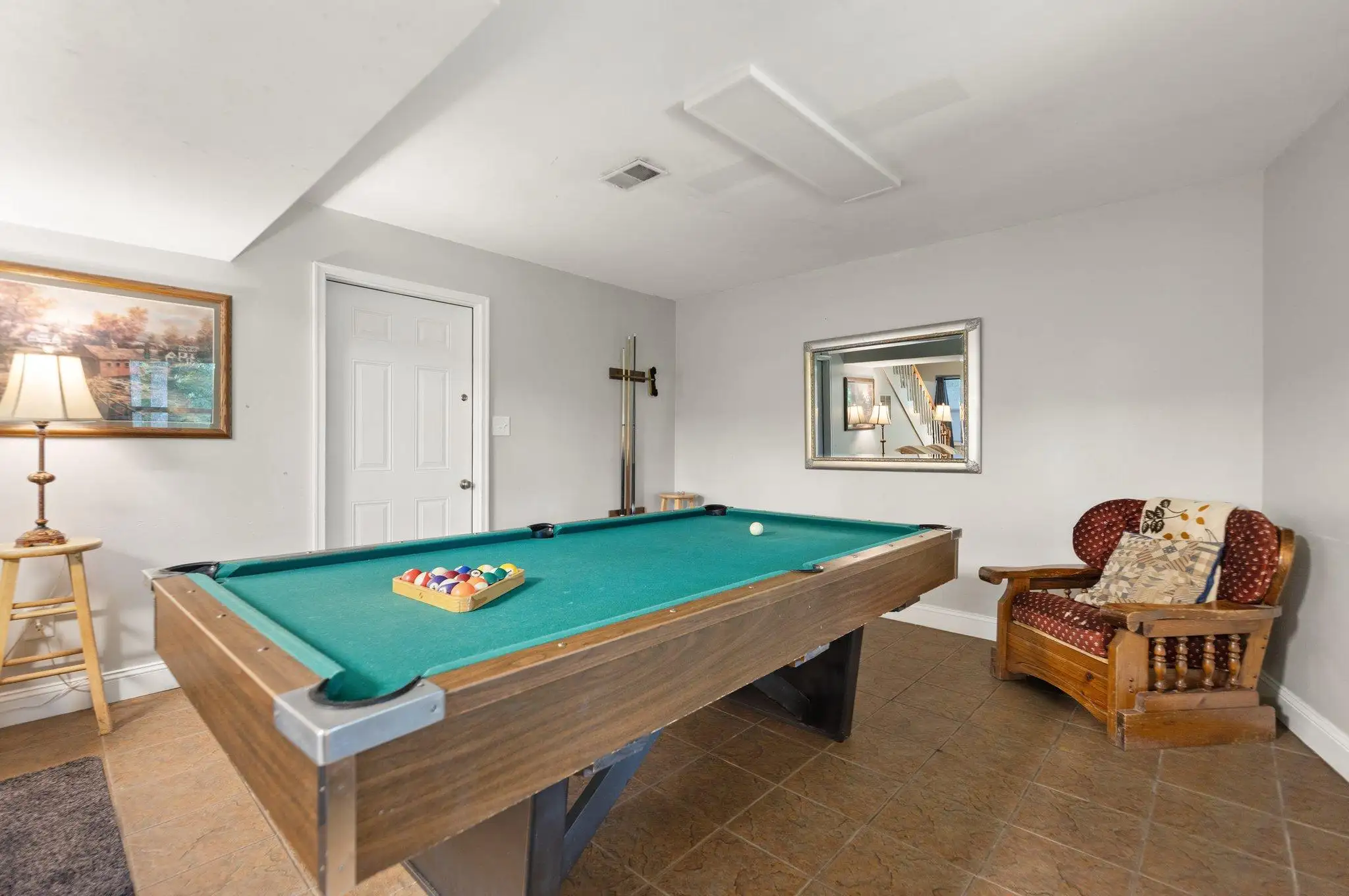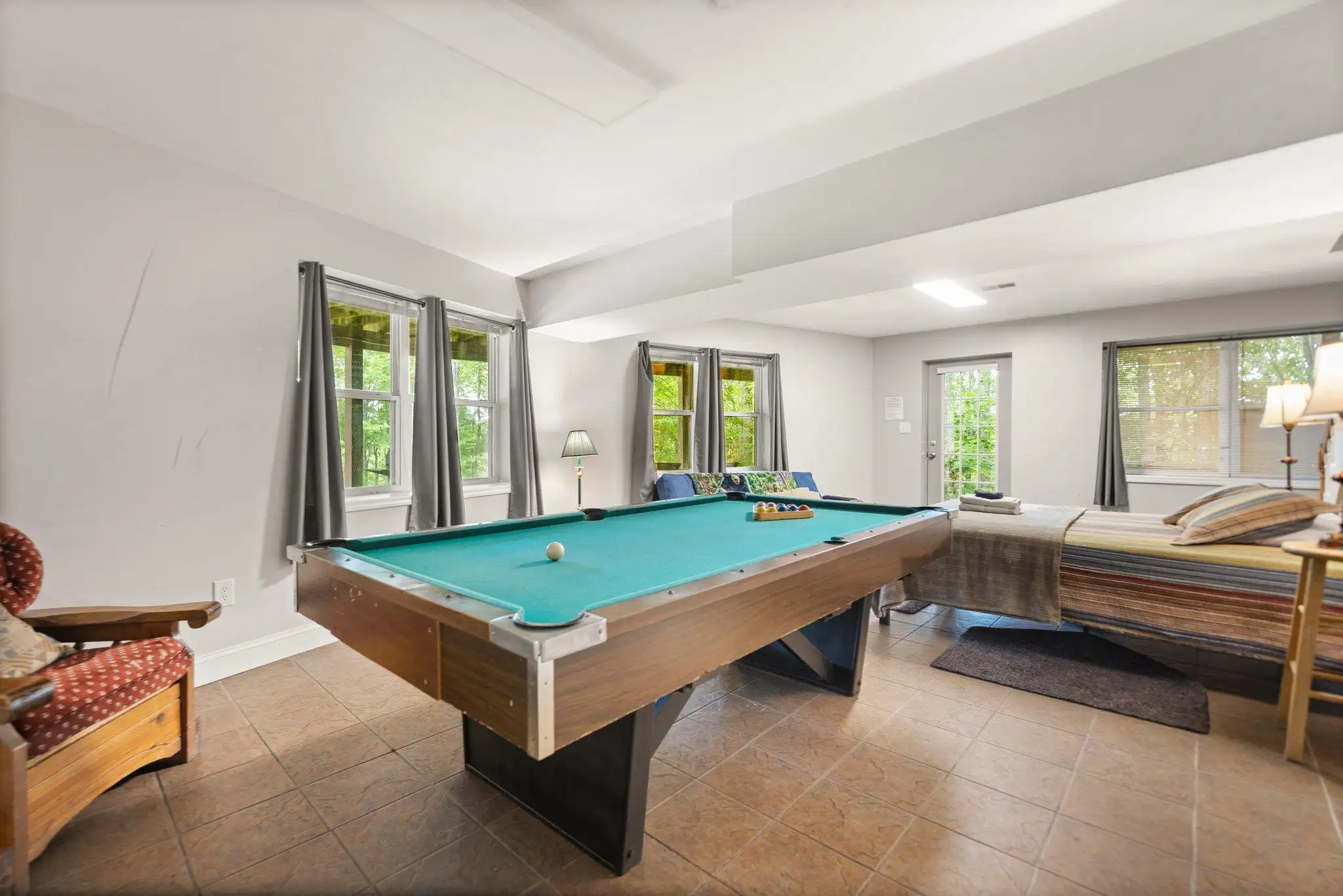 Inside, the master BR on the middle floor has one queen bed and access to the Jack and Jill Full bath with Jacuzzi Tub and step-in shower, The top floor has two private bedrooms that share a full bath with step-in shower. One bedroom has 2 queen beds, the second BR has one queen and 2 twin beds. The Lower level den has a queen bed and is open to the game room with a 6 foot pool table and has a full bath with shower stall and is equipped with a full laundry facility, essential for large groups.
