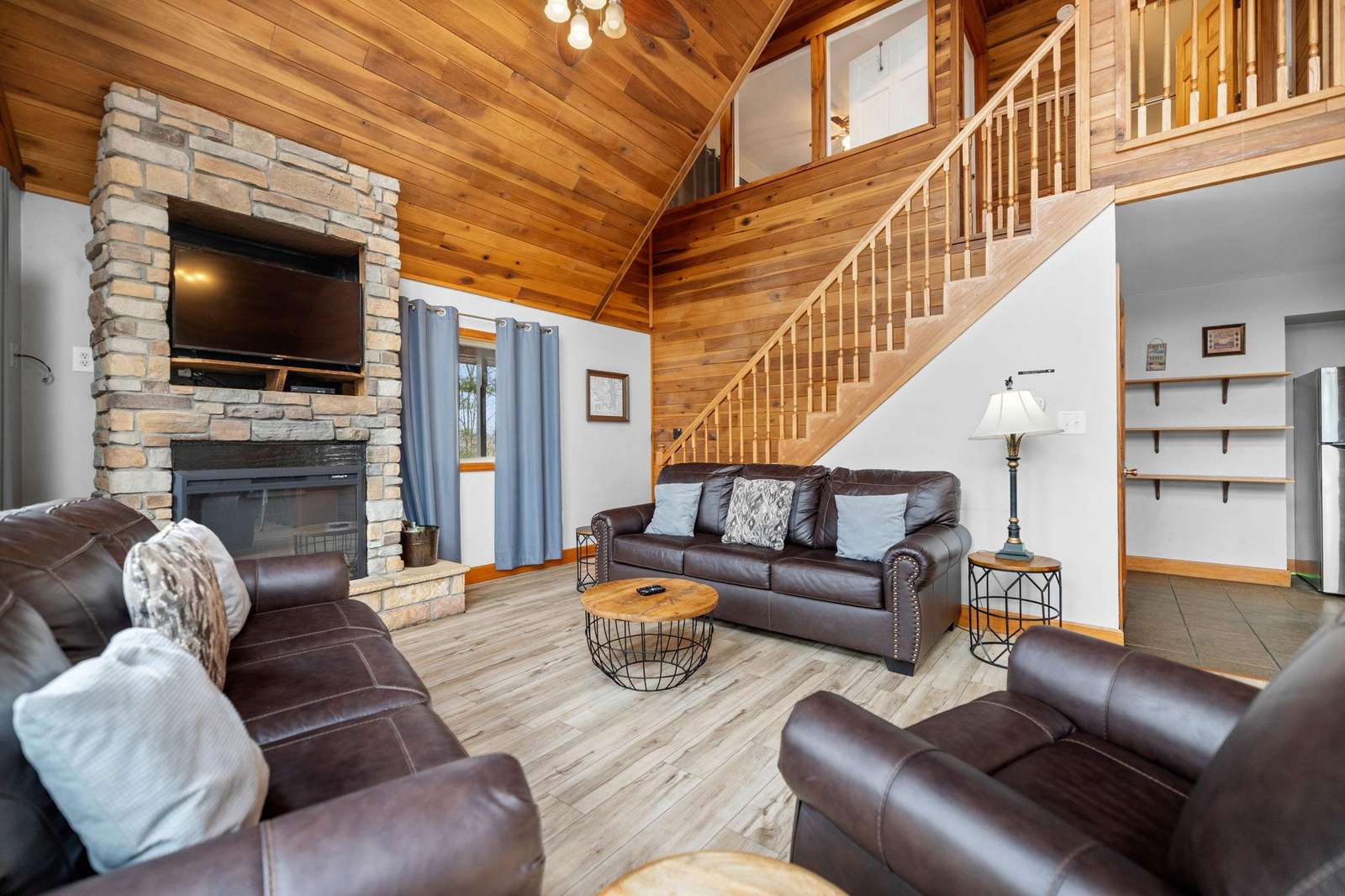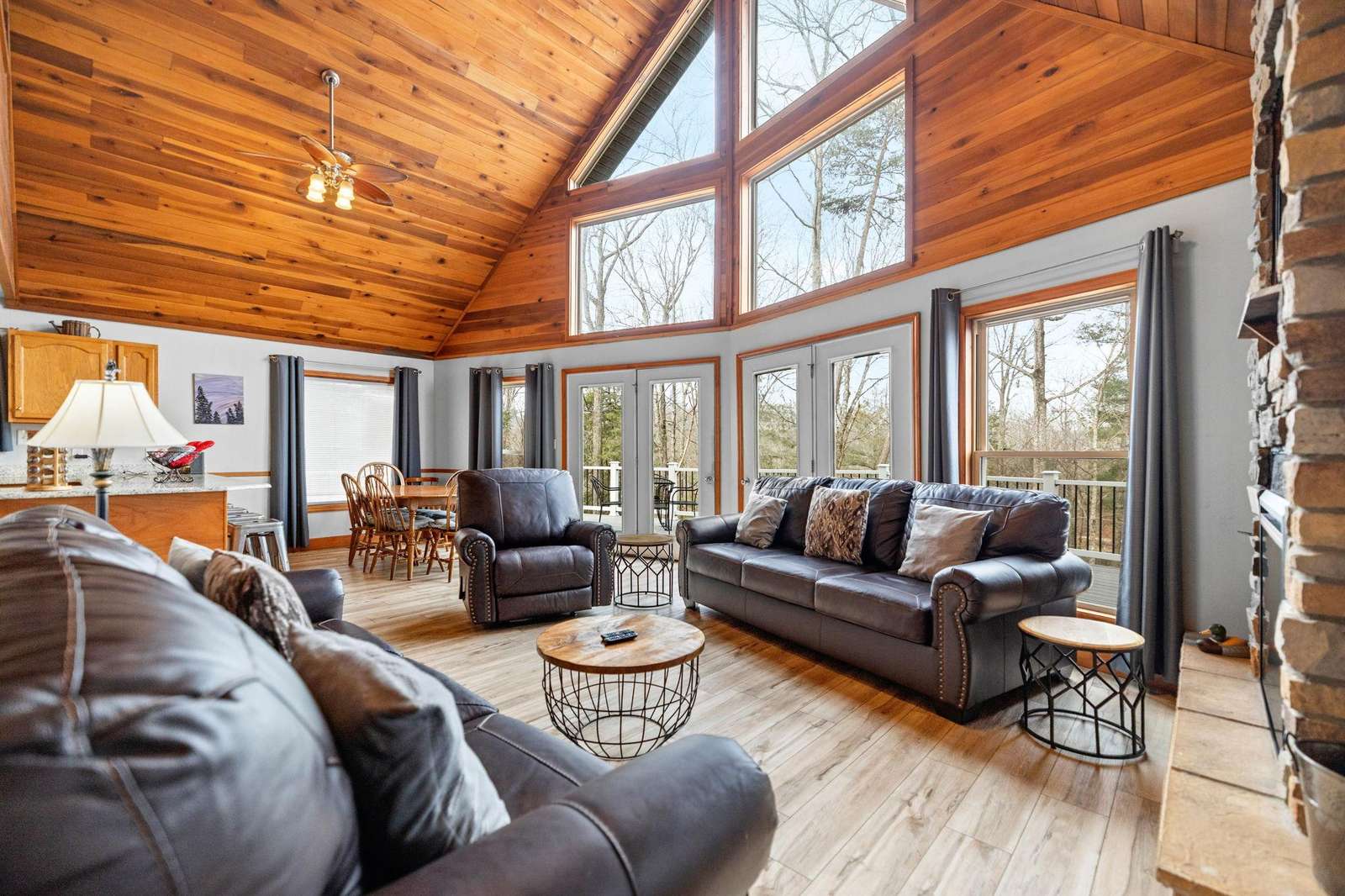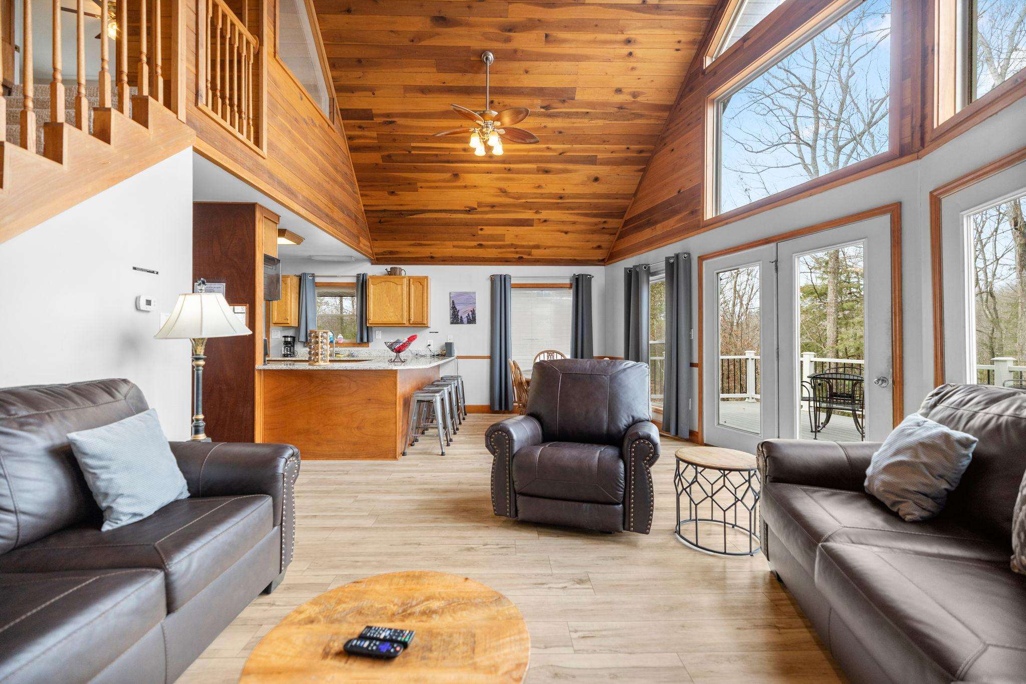 The main living space is open to the kitchen, dining table and living area with floor to ceiling picture frame windows letting in lots of natural light showcasing the scenic forested backdrop. The kitchen has a large wrap around counter with bar stool seating. Plenty of counter space. It comes with all the modern amenities including New refrigerator, microwave, dishwasher, oven/range, toaster and all of the cookware and dishware you need for a weekend getaway or extended stay. The living room is lined with plush sofas and chairs to unwind and relax after the days activities. Fiber optic Wi-Fi is connected to the flat screen Smart TV for entertainment. Cabin has central gas Heat/AC, Jacuzzi tub, stone fireplace,dvd player, and plenty of plush couch seating to unwind and relax after the days activities!