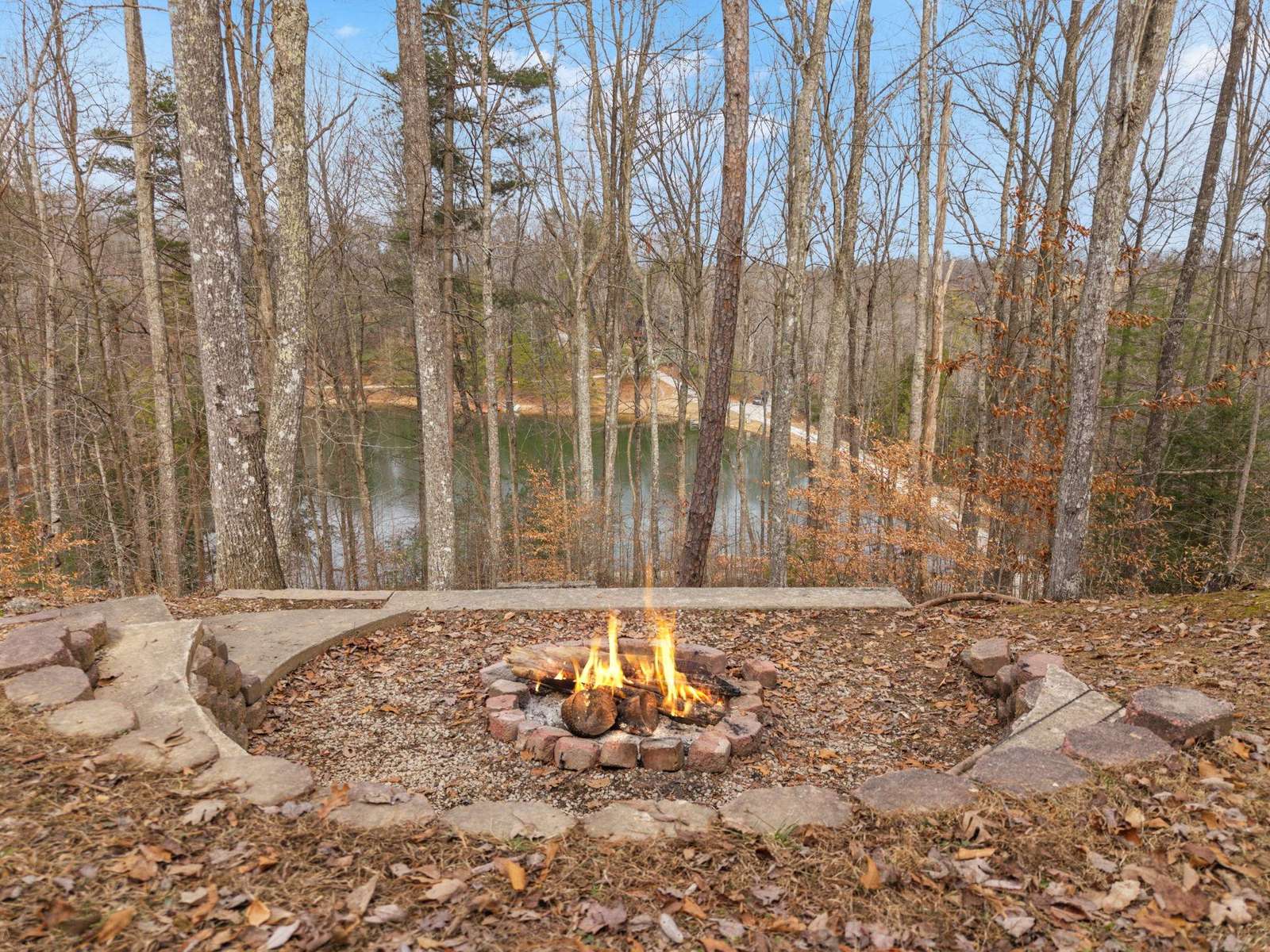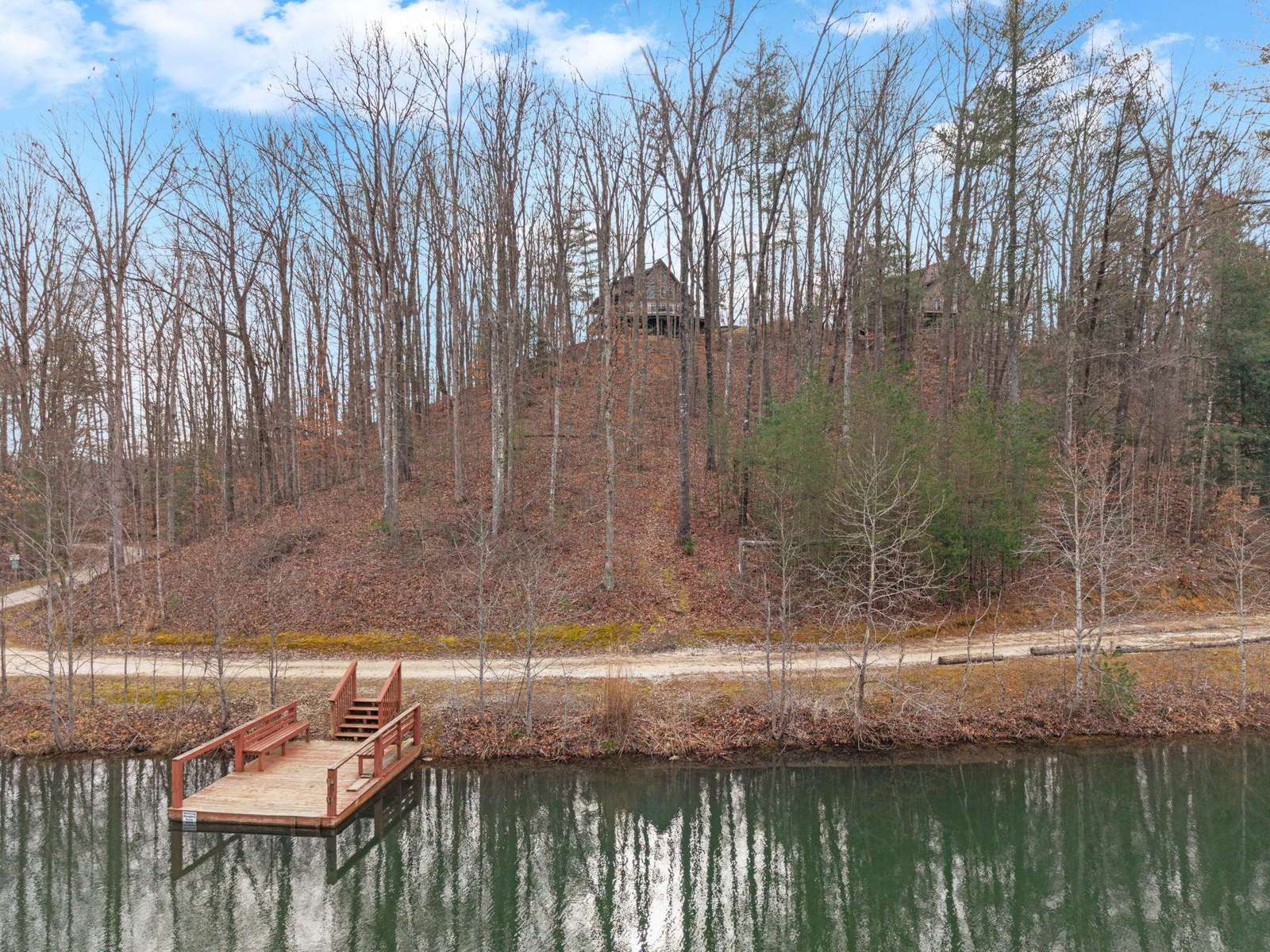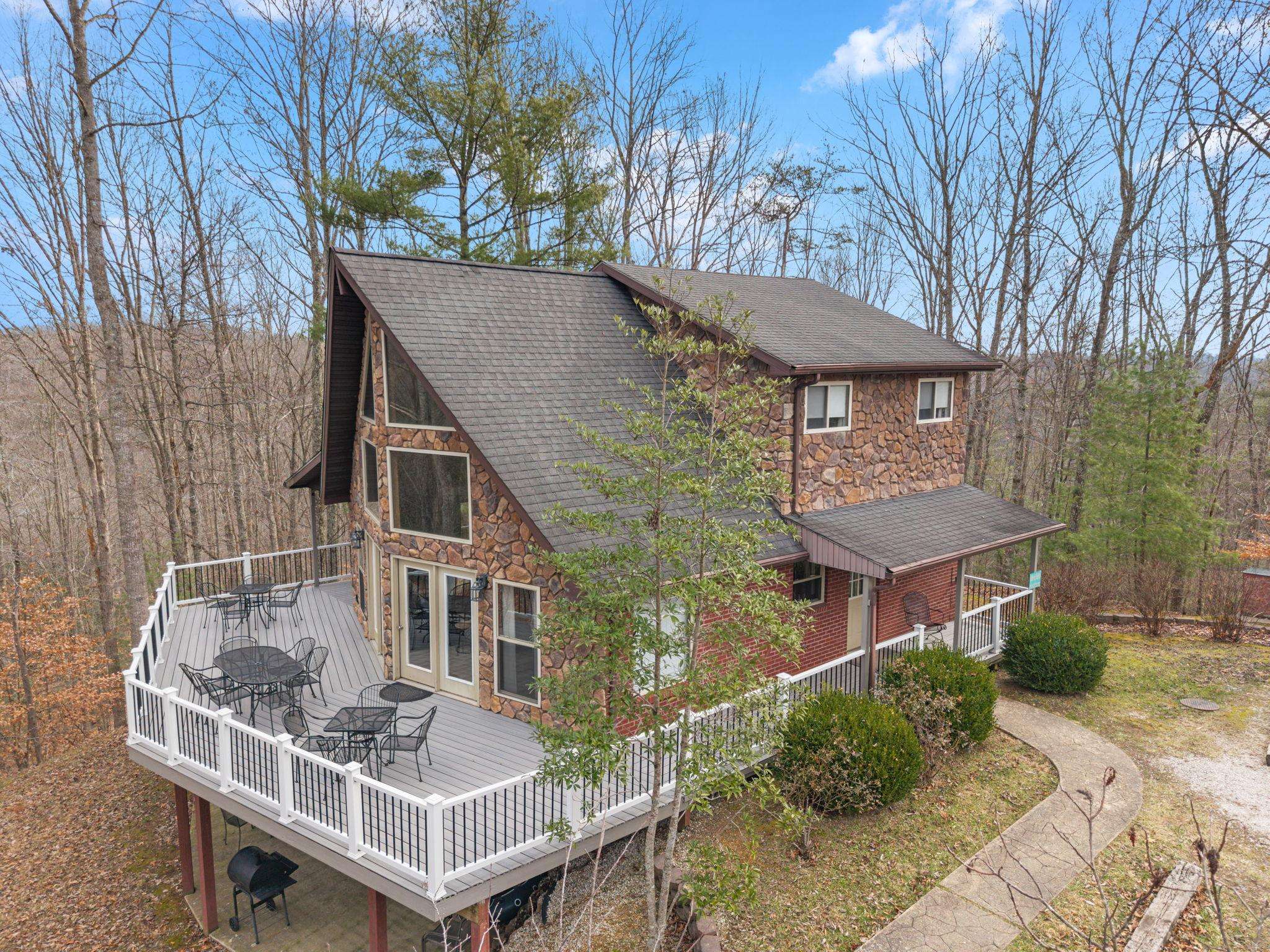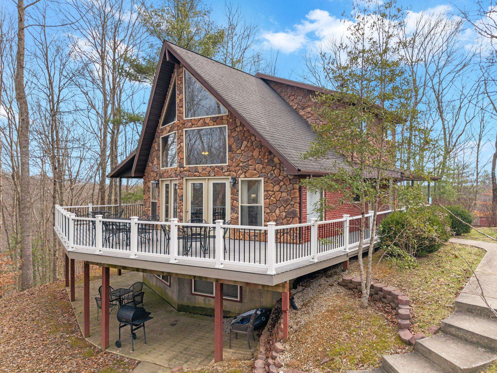 The views from this secluded Kentucky cabin are magnificent. The lake is below on one side with private dock. Tthe woods and cliffview are on the other side. Has hot tub, covered deck, built in fire pit, fiber optic Wi-Fi,, Gas Grill and fireplace.