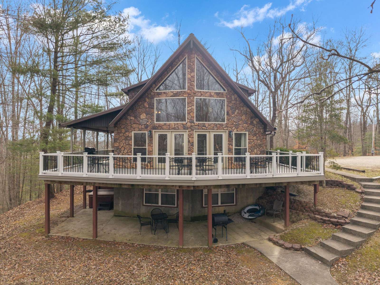 Outside is a private 5 person hot tub shaded from the rain and snow under the covered porch. The wrap around deck is partially covered and has a gas grill, charcoal grill both under shelter from the elements for no rain out grilling. There are tables and chairs for outdoor dining on the open deck to take in the scenery. The yard is home to a large stone fire pit with built in seating with plenty of space for everyone to enjoy toasting s'mores.
